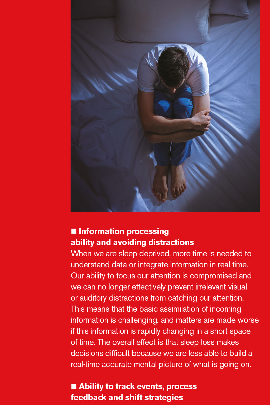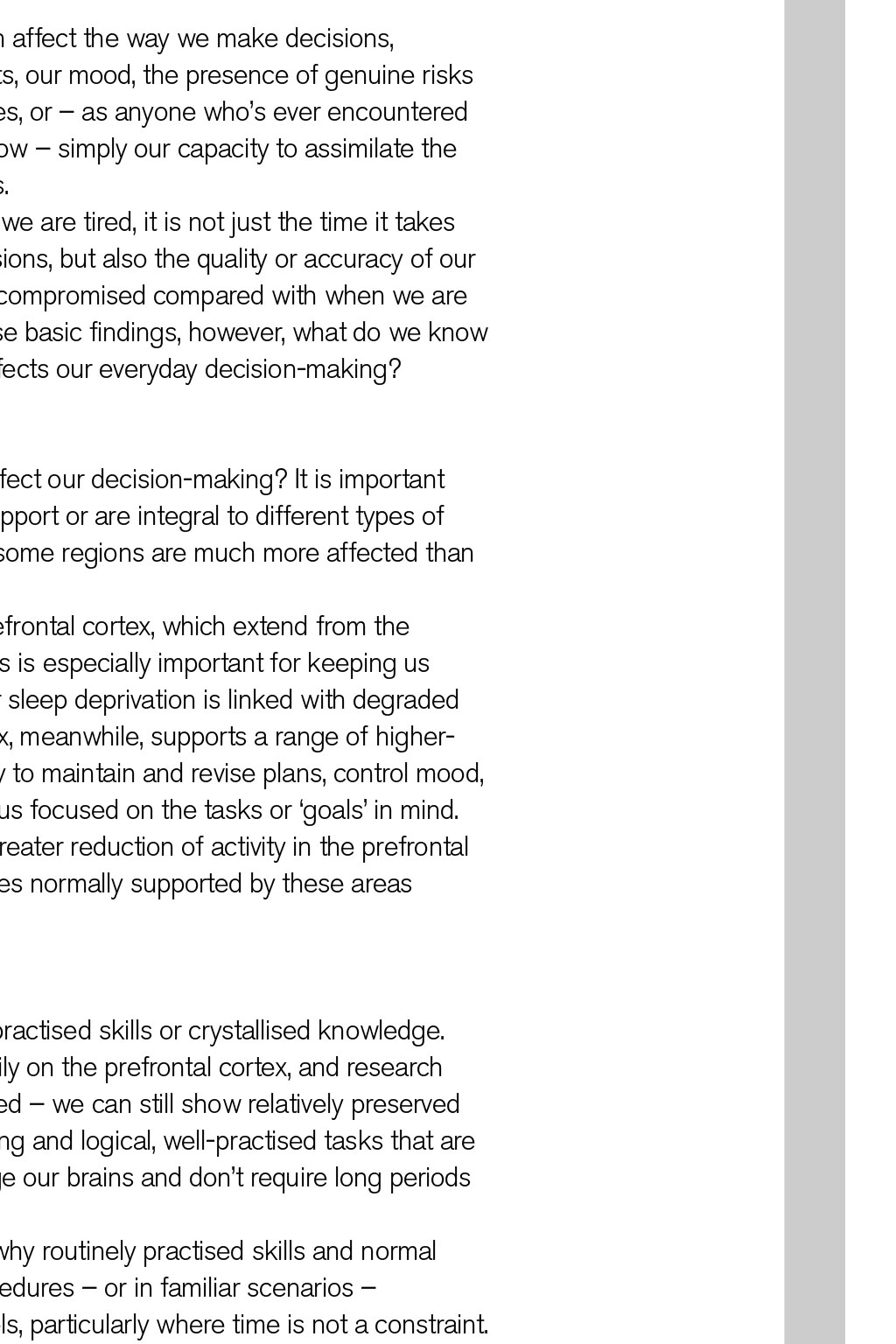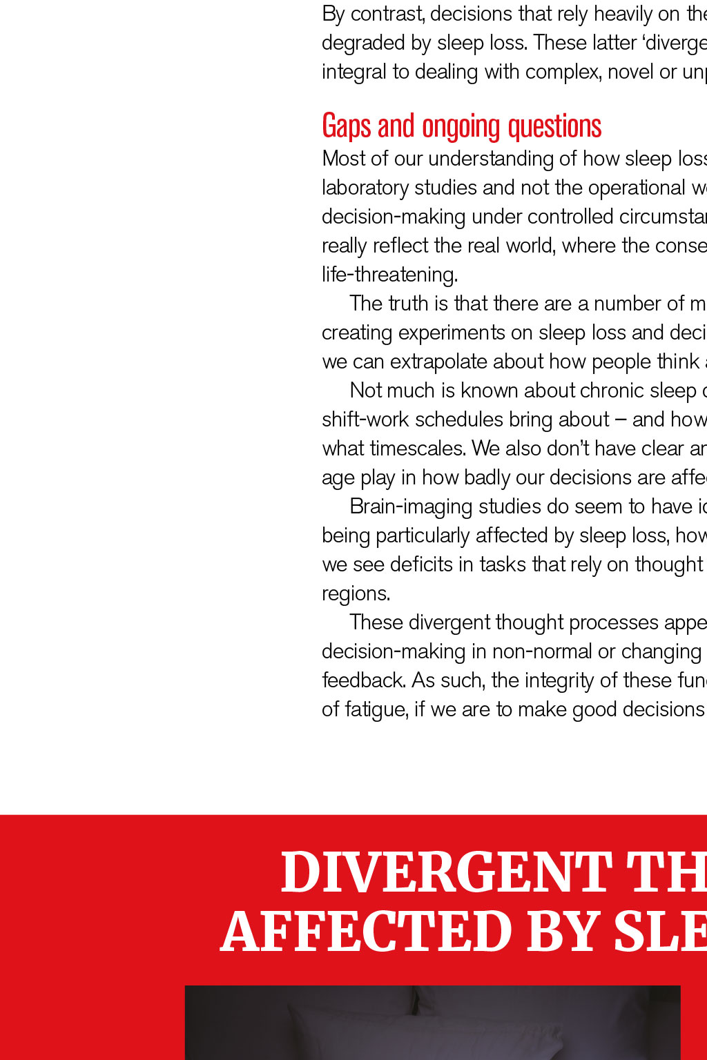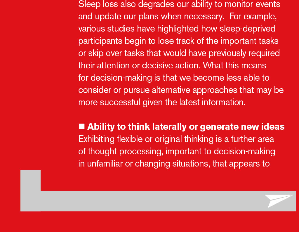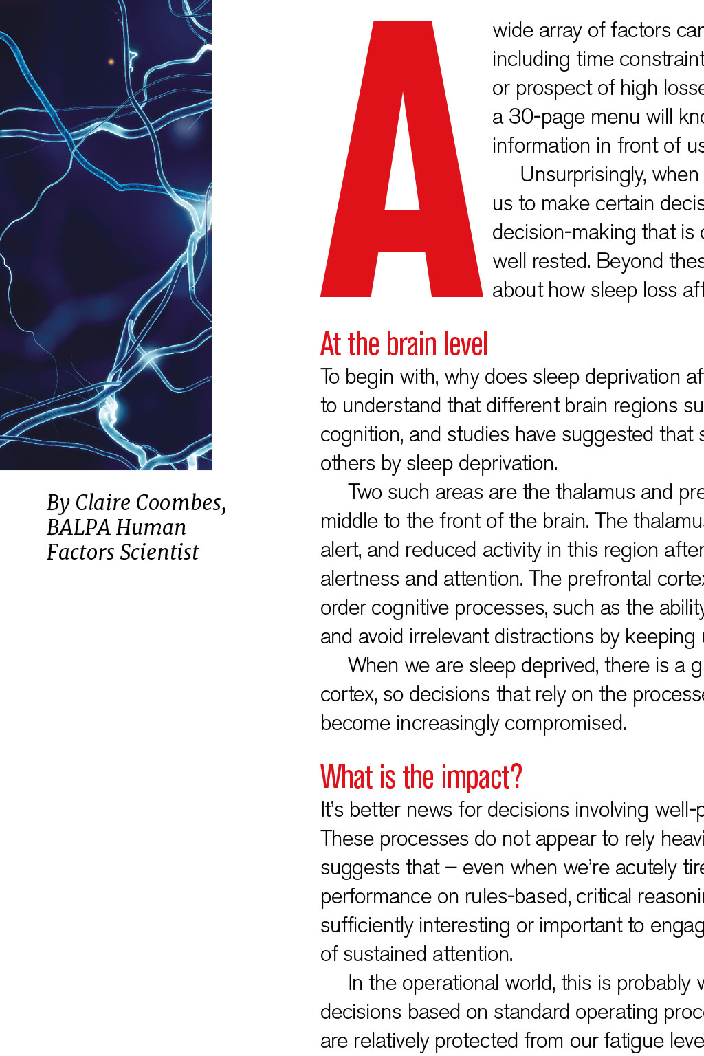 DECISIONZZZZZ, DECISIONZZZZZ A wide array of factors can affect the way we make decisions, including time constraints, our mood, the presence of genuine risks or prospect of high losses, or as anyone whos ever encountered a 30-page menu will know simply our capacity to assimilate the information in front of us. Unsurprisingly, when we are tired, it is not just the time it takes us to make certain decisions, but also the quality or accuracy of our decision-making that is compromised compared with when we are well rested. Beyond these basic findings, however, what do we know about how sleep loss affects our everyday decision-making? At the brain level By Claire Coombes, BALPA Human Factors Scientist To begin with, why does sleep deprivation affect our decision-making? It is important to understand that different brain regions support or are integral to different types of cognition, and studies have suggested that some regions are much more affected than others by sleep deprivation. Two such areas are the thalamus and prefrontal cortex, which extend from the middle to the front of the brain. The thalamus is especially important for keeping us alert, and reduced activity in this region after sleep deprivation is linked with degraded alertness and attention. The prefrontal cortex, meanwhile, supports a range of higherorder cognitive processes, such as the ability to maintain and revise plans, control mood, and avoid irrelevant distractions by keeping us focused on the tasks or goals in mind. When we are sleep deprived, there is a greater reduction of activity in the prefrontal cortex, so decisions that rely on the processes normally supported by these areas become increasingly compromised. What is the impact? Its better news for decisions involving well-practised skills or crystallised knowledge. These processes do not appear to rely heavily on the prefrontal cortex, and research suggests that even when were acutely tired we can still show relatively preserved performance on rules-based, critical reasoning and logical, well-practised tasks that are sufficiently interesting or important to engage our brains and dont require long periods of sustained attention. In the operational world, this is probably why routinely practised skills and normal decisions based on standard operating procedures or in familiar scenarios are relatively protected from our fatigue levels, particularly where time is not a constraint. By contrast, decisions that rely heavily on the prefrontal cortex appear to be particularly degraded by sleep loss. These latter divergent thinking skills are considered to be integral to dealing with complex, novel or unpredictable scenarios. Gaps and ongoing questions Most of our understanding of how sleep loss affects decision-making comes from laboratory studies and not the operational world. So it is reasonable to question whether decision-making under controlled circumstances, using unimportant tasks, can ever really reflect the real world, where the consequences of decisions may be life-threatening. The truth is that there are a number of methodological challenges involved with creating experiments on sleep loss and decision-making, which can limit how much we can extrapolate about how people think and behave in real-world contexts. Not much is known about chronic sleep deprivation the type of sleep loss most shift-work schedules bring about and how this affects decision-making, and over what timescales. We also dont have clear answers on what role individual differences or age play in how badly our decisions are affected by our fatigue levels. Brain-imaging studies do seem to have identified the prefrontal cortical areas as being particularly affected by sleep loss, however which, in turn, seems to explain why we see deficits in tasks that rely on thought processes normally supported by those regions. These divergent thought processes appear critical for allowing the brain to cope with decision-making in non-normal or changing scenarios and to act effectively on feedback. As such, the integrity of these functions must be preserved from the effects of fatigue, if we are to make good decisions in a crisis or unfamiliar situation. DIVERGENT THINKING SKILLS AFFECTED BY SLEEP DEPRIVATION be especially degraded by sleep loss. Research has shown that, as participants become progressively more sleep deprived, their ability to produce innovative ideas diminishes and they are more reliant on previous decisions or strategies, regardless of whether they are appropriate. n Information processing ability and avoiding distractions When we are sleep deprived, more time is needed to understand data or integrate information in real time. Our ability to focus our attention is compromised and we can no longer effectively prevent irrelevant visual or auditory distractions from catching our attention. This means that the basic assimilation of incoming information is challenging, and matters are made worse if this information is rapidly changing in a short space of time. The overall effect is that sleep loss makes decisions difficult because we are less able to build a real-time accurate mental picture of what is going on. n Ability to track events, process feedback and shift strategies Sleep loss also degrades our ability to monitor events and update our plans when necessary. For example, various studies have highlighted how sleep-deprived participants begin to lose track of the important tasks or skip over tasks that would have previously required their attention or decisive action. What this means for decision-making is that we become less able to consider or pursue alternative approaches that may be more successful given the latest information. n Ability to think laterally or generate new ideas Exhibiting flexible or original thinking is a further area of thought processing, important to decision-making in unfamiliar or changing situations, that appears to n Risk propensity and ability to appreciate