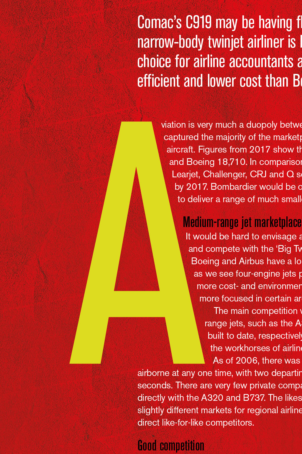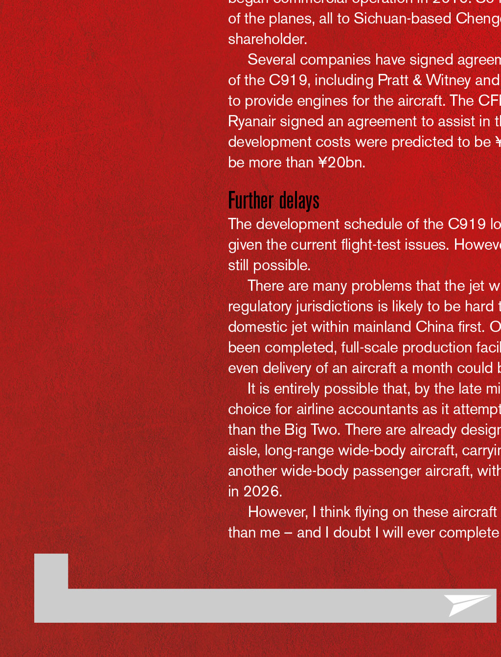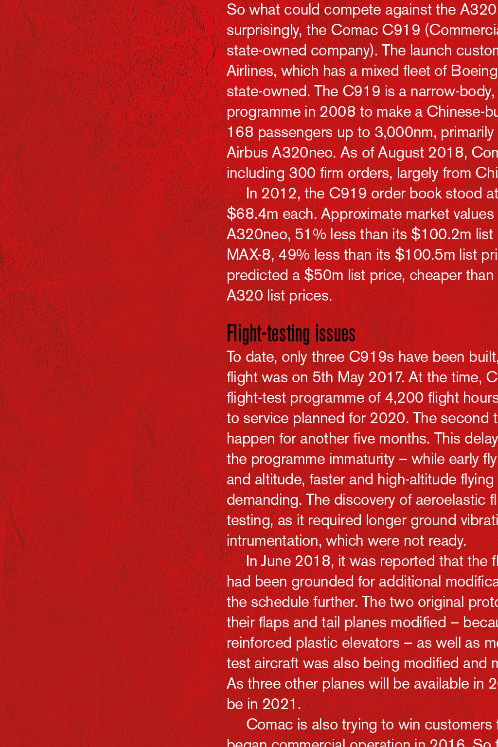 By First Officer Matthew Martin, Log Board member THE RISE OF CHINESE-MADE AIRCRAFT Comac’s C919 may be having flight-test issues, but this narrow-body twinjet airliner is likely to become the jet of choice for airline accountants as it attempts to be more fuel efficient and lower cost than Boeing and Airbus viation is very much a duopoly between Boeing and Airbus, which have captured the majority of the marketplace with their heavy and wide-bodied aircraft. Figures from 2017 show that Airbus has delivered 10,921 aircraft and Boeing 18,710. In comparison, Bombardier – which now owns the Learjet, Challenger, CRJ and Q series – had delivered around 7,000 aircraft by 2017. Bombardier would be one of the next big aircraft manufacturers to deliver a range of much smaller jets. Medium-range jet marketplace It would be hard to envisage anyone being able to pump up production and compete with the ‘Big Two’ in every segment of their production. Boeing and Airbus have a long history of aircraft development and – as we see four-engine jets phased out in favour of models that are more cost- and environmentally sensitive – competition is likely to be more focused in certain areas. The main competition within airlines seems to be in medium- range jets, such as the A320 and B737, with 8,000 and 10,000 built to date, respectively. It is these medium-range jets that are the workhorses of airlines and often make the most profit. As of 2006, there was an average of 1,250 Boeing 737s airborne at any one time, with two departing or landing somewhere every five seconds. There are very few private companies with aircraft that could compete directly with the A320 and B737. The likes of the Ejet 175 and 195 compete in slightly different markets for regional airlines’ expanding summer routes, and are not direct like-for-like competitors. Good competition So what could compete against the A320 and B737? Perhaps, somewhat surprisingly, the Comac C919 (Commercial Aircraft Corporation of China Ltd, a state-owned company). The launch customer for this airliner will be China Eastern Airlines, which has a mixed fleet of Boeing and Airbus, and is predominately state-owned. The C919 is a narrow-body, twinjet airliner, which launched its programme in 2008 to make a Chinese-built aircraft, carrying between 156 and 168 passengers up to 3,000nm, primarily to compete against Boeing 737 MAX and Airbus A320neo. As of August 2018, Comac has more than 100 commitments, including 300 firm orders, largely from Chinese airlines. In 2012, the C919 order book stood at 380 units worth US$26bn, averaging $68.4m each. Approximate market values in 2013 were $49.2m for the Airbus A320neo, 51% less than its $100.2m list price, and $51.4m for the Boeing 737 MAX-8, 49% less than its $100.5m list price. In June 2015, China national radio predicted a $50m list price, cheaper than those for the B737 or A320 list prices. Flight-testing issues To date, only three C919s have been built, and the first test flight was on 5th May 2017. At the time, Comac had planned a flight- est programme of 4,200 flight hours with an introduction to service planned for 2020. The second test flight did not happen for another five months. This delay was because of the programme immaturity – while early flying is at low speed and altitude, faster and high-altitude flying are much more demanding. The discovery of aeroelastic flutter limited flight testing, as it required longer ground vibration testing and intrumentation, which were not ready. IT WOULD BE HARD TO ENVISAGE ANYONE BEING ABLE TO COMPETE WITH THE ‘BIG TWO’ IN EVERY SEGMENT OF PRODUCTION In June 2018, it was reported that the flight-test aircraft had been grounded for additional modifications, extending the schedule further. The two original prototypes were having their flaps and tail planes modified – because of delamination of the carbon-fibre, reinforced plastic elevators – as well as modifications to their fuel tanks. The third test aircraft was also being modified and maximum-rate pressurisation was tested. As three other planes will be available in 2019, Comac maintains first deliveries will be in 2021. Comac is also trying to win customers for its smaller ARJ21 regional jet, which began commercial operation in 2016. So far, the company has delivered just four of the planes, all to Sichuan-based Chengdu Airlines, in which Comac is a major shareholder. Several companies have signed agreements to assist with the development of the C919, including Pratt & Witney and CFM International, which have offered to provide engines for the aircraft. The CFM LEAP-1C was chosen. In 2011, Ryanair signed an agreement to assist in the development of the C919. Original development costs were predicted to be ¥9.5bn, but the actual cost is estimated to be more than ¥20bn. Further delays The development schedule of the C919 looks likely to slip further beyond 2021, given the current flight-test issues. However, a delivery with the launch customer is still possible. There are many problems that the jet will face: certification to fly in different regulatory jurisdictions is likely to be hard to obtain, so it will probably become a domestic jet within mainland China first. Once the prototype and flight testing have been completed, full-scale production facilities will have to be built; at this stage, even delivery of an aircraft a month could be some time away. It is entirely possible that, by the late mid-century, the C919 will be the jet of choice for airline accountants as it attempts to be more fuel efficient and lower cost than the Big Two. There are already design plans for the C929, a twin-engine, twin- aisle, long-range wide-body aircraft, carrying 250-290 passengers; and the C939 – another wide-body passenger aircraft, with first flights proposed for 2023, launching in 2026. However, I think flying on these aircraft will be a choice for my children rather than me – and I doubt I will eve