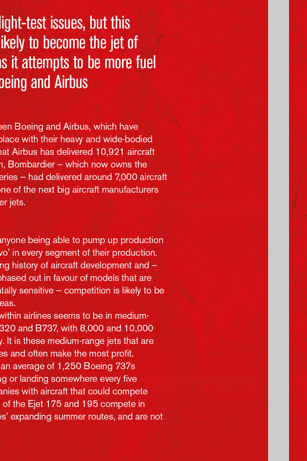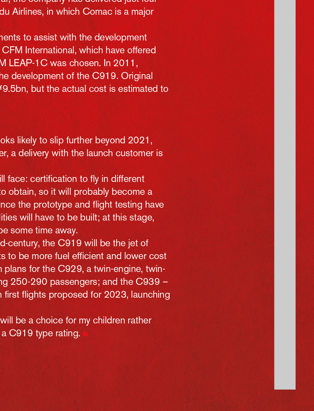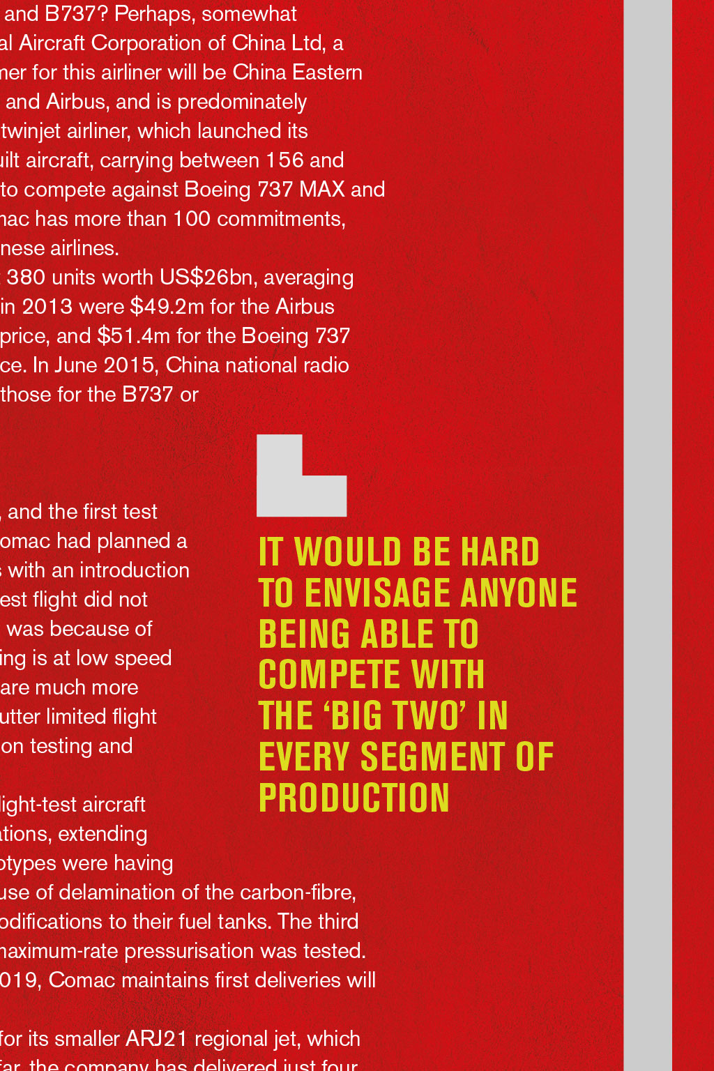 By First Officer Matthew Martin, Log Board member THE RISE OF CHINESE-MADE AIRCRAFT Comac’s C919 may be having flight-test issues, but this narrow-body twinjet airliner is likely to become the jet of choice for airline accountants as it attempts to be more fuel efficient and lower cost than Boeing and Airbus viation is very much a duopoly between Boeing and Airbus, which have captured the majority of the marketplace with their heavy and wide-bodied aircraft. Figures from 2017 show that Airbus has delivered 10,921 aircraft and Boeing 18,710. In comparison, Bombardier – which now owns the Learjet, Challenger, CRJ and Q series – had delivered around 7,000 aircraft by 2017. Bombardier would be one of the next big aircraft manufacturers to deliver a range of much smaller jets. Medium-range jet marketplace It would be hard to envisage anyone being able to pump up production and compete with the ‘Big Two’ in every segment of their production. Boeing and Airbus have a long history of aircraft development and – as we see four-engine jets phased out in favour of models that are more cost- and environmentally sensitive – competition is likely to be more focused in certain areas. The main competition within airlines seems to be in medium- range jets, such as the A320 and B737, with 8,000 and 10,000 built to date, respectively. It is these medium-range jets that are the workhorses of airlines and often make the most profit. As of 2006, there was an average of 1,250 Boeing 737s airborne at any one time, with two departing or landing somewhere every five seconds. There are very few private companies with aircraft that could compete directly with the A320 and B737. The likes of the Ejet 175 and 195 compete in slightly different markets for regional airlines’ expanding summer routes, and are not direct like-for-like competitors. Good competition So what could compete against the A320 and B737? Perhaps, somewhat surprisingly, the Comac C919 (Commercial Aircraft Corporation of China Ltd, a state-owned company). The launch customer for this airliner will be China Eastern Airlines, which has a mixed fleet of Boeing and Airbus, and is predominately state-owned. The C919 is a narrow-body, twinjet airliner, which launched its programme in 2008 to make a Chinese-built aircraft, carrying between 156 and 168 passengers up to 3,000nm, primarily to compete against Boeing 737 MAX and Airbus A320neo. As of August 2018, Comac has more than 100 commitments, including 300 firm orders, largely from Chinese airlines. In 2012, the C919 order book stood at 380 units worth US$26bn, averaging $68.4m each. Approximate market values in 2013 were $49.2m for the Airbus A320neo, 51% less than its $100.2m list price, and $51.4m for the Boeing 737 MAX-8, 49% less than its $100.5m list price. In June 2015, China national radio predicted a $50m list price, cheaper than those for the B737 or A320 list prices. Flight-testing issues To date, only three C919s have been built, and the first test flight was on 5th May 2017. At the time, Comac had planned a flight- est programme of 4,200 flight hours with an introduction to service planned for 2020. The second test flight did not happen for another five months. This delay was because of the programme immaturity – while early flying is at low speed and altitude, faster and high-altitude flying are much more demanding. The discovery of aeroelastic flutter limited flight testing, as it required longer ground vibration testing and intrumentation, which were not ready. IT WOULD BE HARD TO ENVISAGE ANYONE BEING ABLE TO COMPETE WITH THE ‘BIG TWO’ IN EVERY SEGMENT OF PRODUCTION In June 2018, it was reported that the flight-test aircraft had been grounded for additional modifications, extending the schedule further. The two original prototypes were having their flaps and tail planes modified – because of delamination of the carbon-fibre, reinforced plastic elevators – as well as modifications to their fuel tanks. The third test aircraft was also being modified and maximum-rate pressurisation was tested. As three other planes will be available in 2019, Comac maintains first deliveries will be in 2021. Comac is also trying to win customers for its smaller ARJ21 regional jet, which began commercial operation in 2016. So far, the company has delivered just four of the planes, all to Sichuan-based Chengdu Airlines, in which Comac is a major shareholder. Several companies have signed agreements to assist with the development of the C919, including Pratt & Witney and CFM International, which have offered to provide engines for the aircraft. The CFM LEAP-1C was chosen. In 2011, Ryanair signed an agreement to assist in the development of the C919. Original development costs were predicted to be ¥9.5bn, but the actual cost is estimated to be more than ¥20bn. Further delays The development schedule of the C919 looks likely to slip further beyond 2021, given the current flight-test issues. However, a delivery with the launch customer is still possible. There are many problems that the jet will face: certification to fly in different regulatory jurisdictions is likely to be hard to obtain, so it will probably become a domestic jet within mainland China first. Once the prototype and flight testing have been completed, full-scale production facilities will have to be built; at this stage, even delivery of an aircraft a month could be some time away. It is entirely possible that, by the late mid-century, the C919 will be the jet of choice for airline accountants as it attempts to be more fuel efficient and lower cost than the Big Two. There are already design plans for the C929, a twin-engine, twin- aisle, long-range wide-body aircraft, carrying 250-290 passengers; and the C939 – another wide-body passenger aircraft, with first flights proposed for 2023, launching in 2026. However, I think flying on these aircraft will be a choice for my children rather than me – and I doubt I will eve