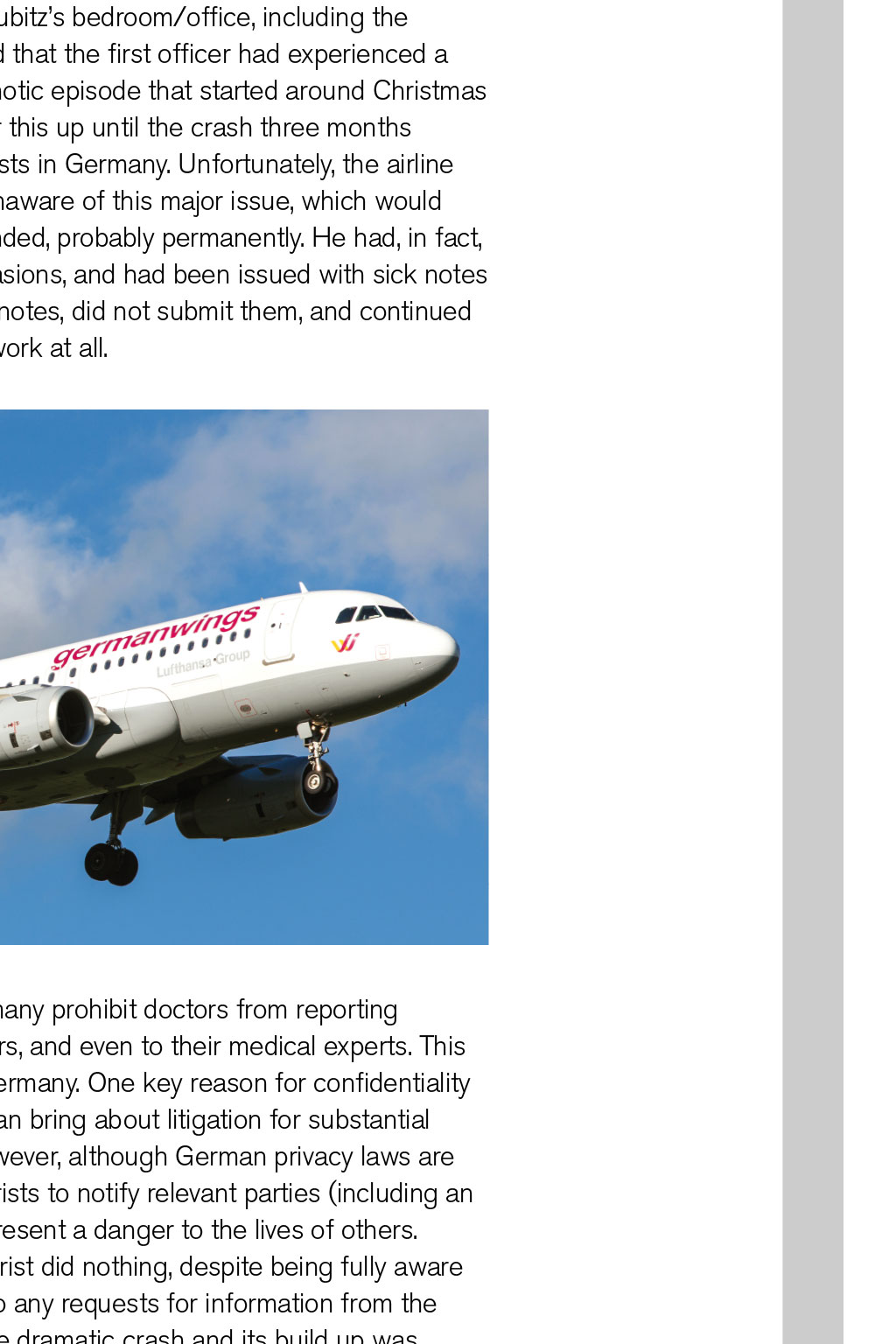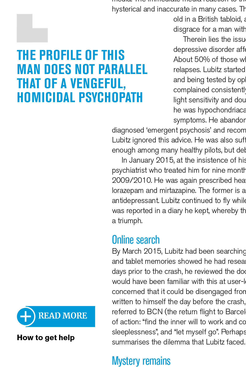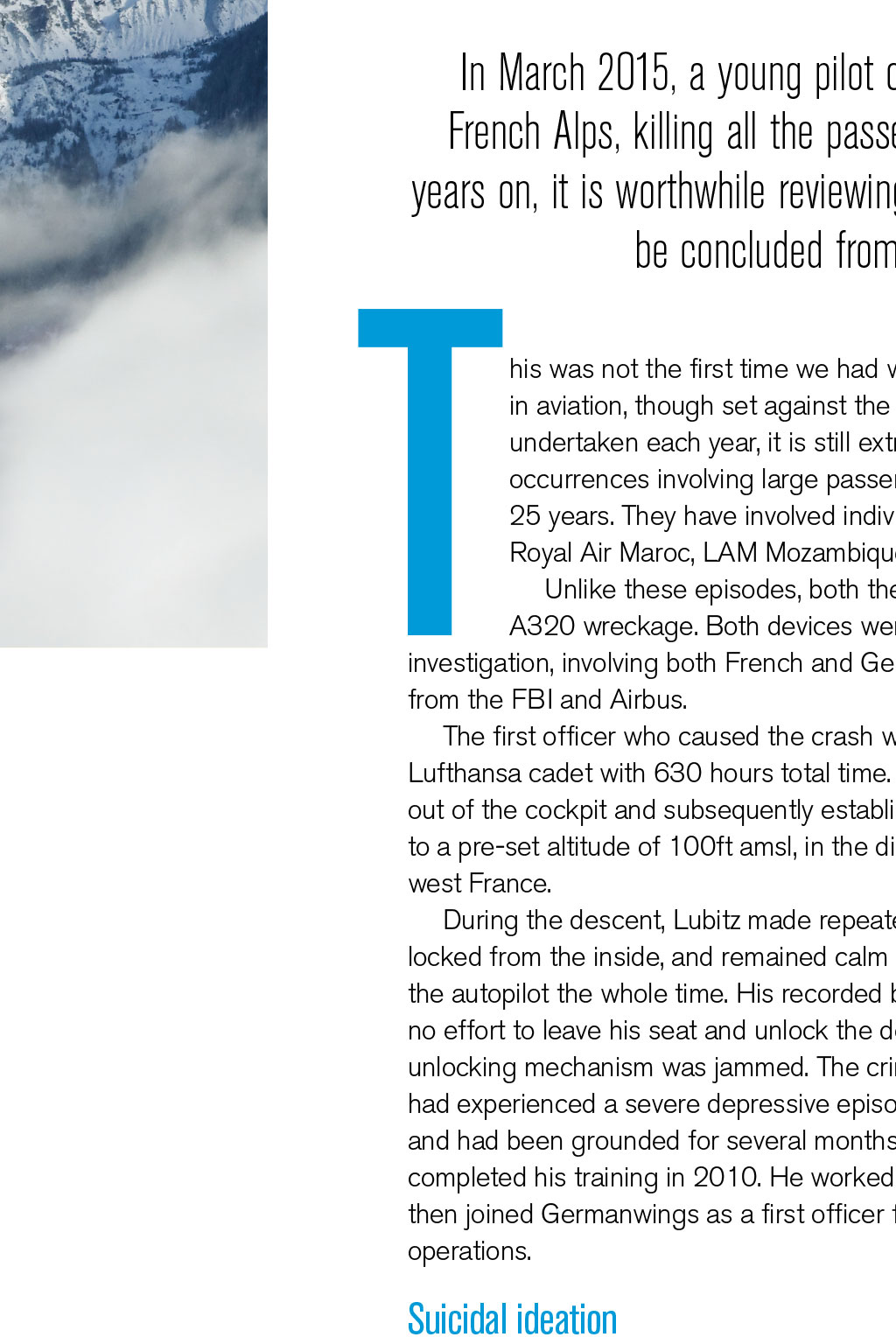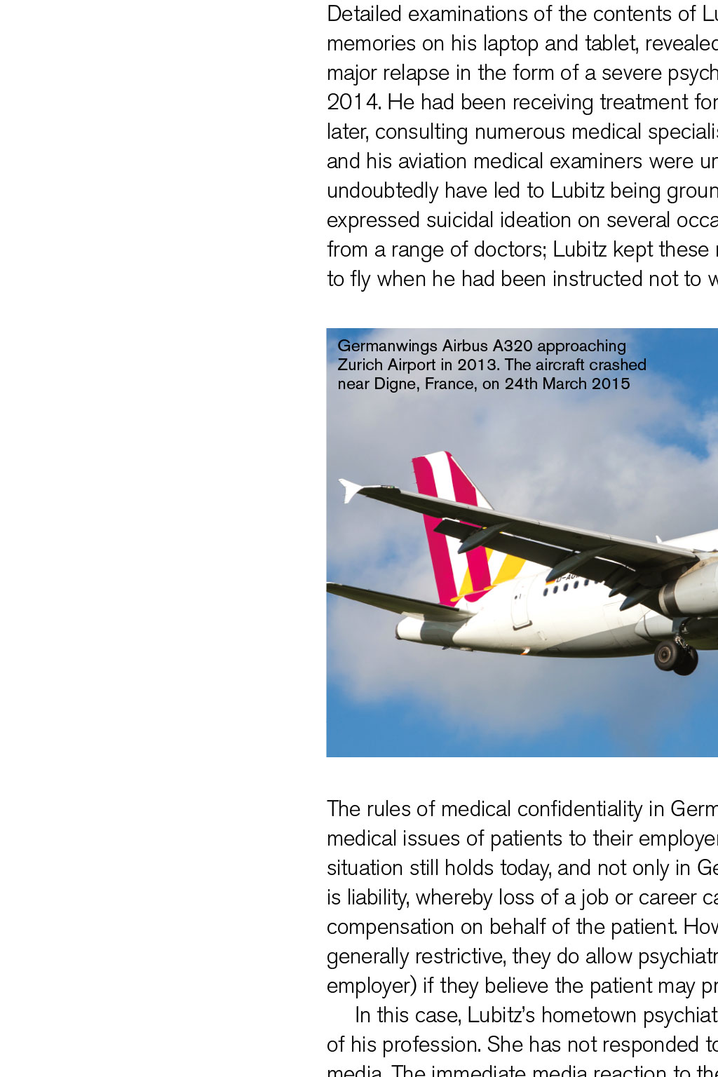 GERMANWINGS 9525 REVISITED By David Keen, Log Board member In March 2015, a young pilot crashed in a remote part of the French Alps, killing all the passengers and crew on board. Four years on, it is worthwhile reviewing what happened – and what may T be concluded from this terrible event his was not the first time we had witnessed a dramatic murder-suicide in aviation, though set against the billions of passenger journeys safely undertaken each year, it is still extraordinarily rare. At least five more notable occurrences involving large passenger numbers have taken place in the past 25 years. They have involved individual pilots operating for Egyptair, Silk Air, Royal Air Maroc, LAM Mozambique, and almost certainly Malaysian Airlines. Unlike these episodes, both the CVR and FDR were recovered from the A320 wreckage. Both devices were sufficiently intact to allow a detailed investigation, involving both French and German aviation authorities, with cooperation from the FBI and Airbus. The first officer who caused the crash was Andreas Lubitz, a 27-year-old former Lufthansa cadet with 630 hours total time. His actions involved locking the captain out of the cockpit and subsequently establishing the jet into a high-speed descent to a pre-set altitude of 100ft amsl, in the direction of a mountainous region of south- west France. During the descent, Lubitz made repeated actions to keep the flight-deck door locked from the inside, and remained calm and in control of the Airbus, making use of the autopilot the whole time. His recorded breathing patterns were calm, and he made no effort to leave his seat and unlock the door, precluding the theory that the door- unlocking mechanism was jammed. The criminal investigators learned that Lubitz had experienced a severe depressive episode during initial flight training in 2009, and had been grounded for several months. Following recovery, he re-joined and completed his training in 2010. He worked as long-haul cabin crew for two years, and then joined Germanwings as a first officer flying the A320 in short-haul European operations. Suicidal ideation Detailed examinations of the contents of Lubitz’s bedroom/office, including the memories on his laptop and tablet, revealed that the first officer had experienced a major relapse in the form of a severe psychotic episode that started around Christmas 2014. He had been receiving treatment for this up until the crash three months later, consulting numerous medical specialists in Germany. Unfortunately, the airline and his aviation medical examiners were unaware of this major issue, which would undoubtedly have led to Lubitz being grounded, probably permanently. He had, in fact, expressed suicidal ideation on several occasions, and had been issued with sick notes from a range of doctors; Lubitz kept these notes, did not submit them, and continued to fly when he had been instructed not to work at all. The rules of medical confidentiality in Germany prohibit doctors from reporting medical issues of patients to their employers, and even to their medical experts. This situation still holds today, and not only in Germany. One key reason for confidentiality is liability, whereby loss of a job or career can bring about litigation for substantial compensation on behalf of the patient. However, although German privacy laws are generally restrictive, they do allow psychiatrists to notify relevant parties (including an employer) if they believe the patient may present a danger to the lives of others. In this case, Lubitz’s hometown psychiatrist did nothing, despite being fully aware of his profession. She has not responded to any requests for information from the media. The immediate media reaction to the dramatic crash and its build up was hysterical and inaccurate in many cases. The co-pilot was reported to be 17 years Germanwings Airbus A320 approaching Zurich Airport in 2013. The aircraft crashed near Digne, France, on 24th March 2015 THE PROFILE OF THIS MAN DOES NOT PARALLEL THAT OF A VENGEFUL, HOMICIDAL PSYCHOPATH old in a British tabloid, and Piers Morgan trumpeted that “it was a disgrace for a man with acute depression to be allowed to fly”. Therein lies the issue of mental health of this pilot. Major depressive disorder affects approximately one in six men. About 50% of those who recover will experience one or more relapses. Lubitz started with psychosomatic symptoms, consulting and being tested by ophthalmologists and neurologists. He complained consistently of seeing stars, halos, and suffering from light sensitivity and double vision. Some doctors suggested that he was hypochondriacal; others that he, in fact, had psychotic symptoms. He abandoned treatment at this point. His GP READ MORE How to get help diagnosed ‘emergent psychosis’ and recommended psychiatric treatment. At first, Lubitz ignored this advice. He was also suffering from chronic sleeplessness, common enough among many healthy pilots, but debilitating nonetheless. In January 2015, at the insistence of his mother, Lubitz returned to the same psychiatrist who treated him for nine months back in his initial training period of 2009/2010. He was again prescribed heavy-duty psychotropic drugs, namely lorazepam and mirtazapine. The former is a powerful sedative, the latter an antidepressant. Lubitz continued to fly while taking these. His torment with insomnia was reported in a diary he kept, whereby three to four hours’ sleep was considered a triumph. Online search By March 2015, Lubitz had been searching for means of suicide online. His laptop and tablet memories showed he had researched many different approaches, and two days prior to the crash, he reviewed the door-locking mechanism on the A320. He would have been familiar with this at user-level, but the young pilot was presumably concerned that it could be disengaged from outside the cockpit. A note, apparently written to himself the day before the crash, was entitled ‘Decision 