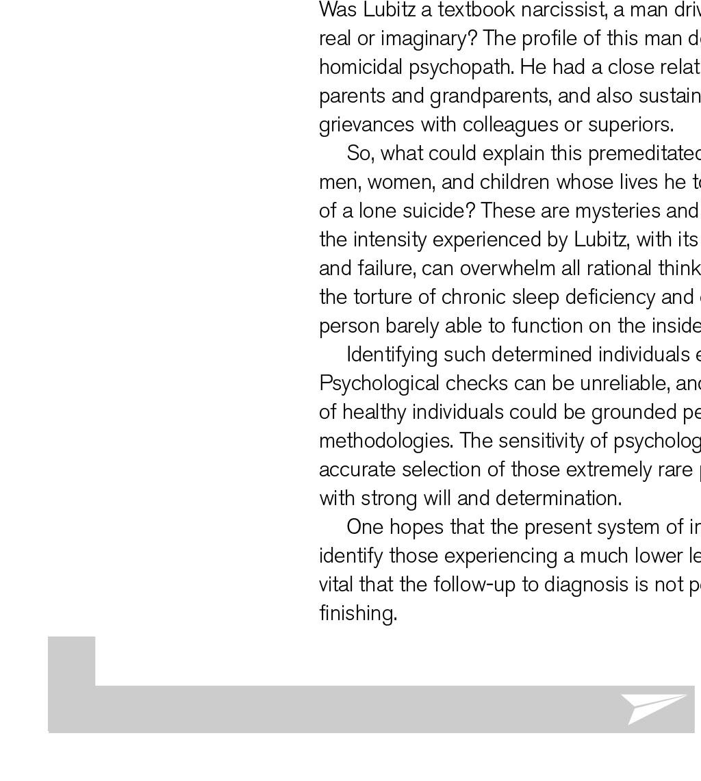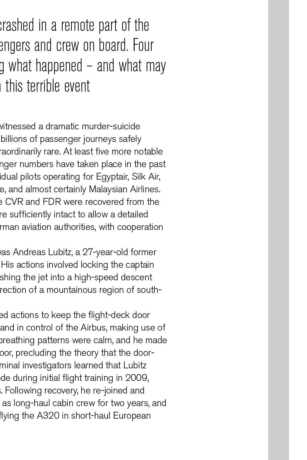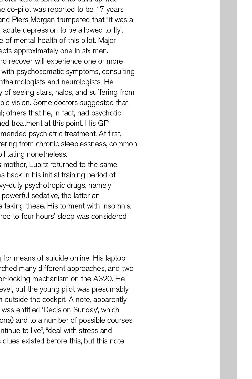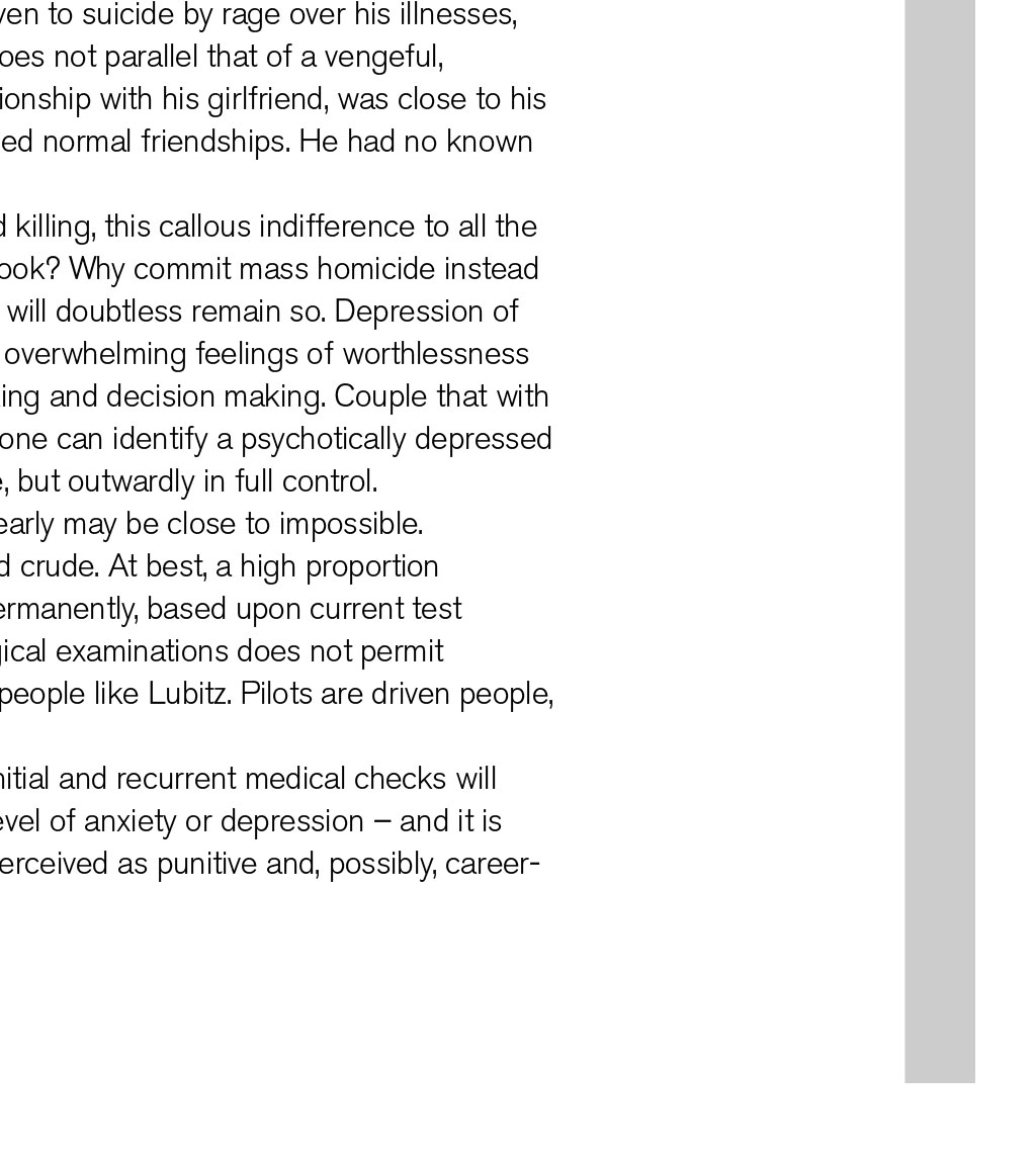 GERMANWINGS 9525 REVISITED By David Keen, Log Board member In March 2015, a young pilot crashed in a remote part of the French Alps, killing all the passengers and crew on board. Four years on, it is worthwhile reviewing what happened – and what may T be concluded from this terrible event his was not the first time we had witnessed a dramatic murder-suicide in aviation, though set against the billions of passenger journeys safely undertaken each year, it is still extraordinarily rare. At least five more notable occurrences involving large passenger numbers have taken place in the past 25 years. They have involved individual pilots operating for Egyptair, Silk Air, Royal Air Maroc, LAM Mozambique, and almost certainly Malaysian Airlines. Unlike these episodes, both the CVR and FDR were recovered from the A320 wreckage. Both devices were sufficiently intact to allow a detailed investigation, involving both French and German aviation authorities, with cooperation from the FBI and Airbus. The first officer who caused the crash was Andreas Lubitz, a 27-year-old former Lufthansa cadet with 630 hours total time. His actions involved locking the captain out of the cockpit and subsequently establishing the jet into a high-speed descent to a pre-set altitude of 100ft amsl, in the direction of a mountainous region of south- west France. During the descent, Lubitz made repeated actions to keep the flight-deck door locked from the inside, and remained calm and in control of the Airbus, making use of the autopilot the whole time. His recorded breathing patterns were calm, and he made no effort to leave his seat and unlock the door, precluding the theory that the door- unlocking mechanism was jammed. The criminal investigators learned that Lubitz had experienced a severe depressive episode during initial flight training in 2009, and had been grounded for several months. Following recovery, he re-joined and completed his training in 2010. He worked as long-haul cabin crew for two years, and then joined Germanwings as a first officer flying the A320 in short-haul European operations. Suicidal ideation Detailed examinations of the contents of Lubitz’s bedroom/office, including the memories on his laptop and tablet, revealed that the first officer had experienced a major relapse in the form of a severe psychotic episode that started around Christmas 2014. He had been receiving treatment for this up until the crash three months later, consulting numerous medical specialists in Germany. Unfortunately, the airline and his aviation medical examiners were unaware of this major issue, which would undoubtedly have led to Lubitz being grounded, probably permanently. He had, in fact, expressed suicidal ideation on several occasions, and had been issued with sick notes from a range of doctors; Lubitz kept these notes, did not submit them, and continued to fly when he had been instructed not to work at all. The rules of medical confidentiality in Germany prohibit doctors from reporting medical issues of patients to their employers, and even to their medical experts. This situation still holds today, and not only in Germany. One key reason for confidentiality is liability, whereby loss of a job or career can bring about litigation for substantial compensation on behalf of the patient. However, although German privacy laws are generally restrictive, they do allow psychiatrists to notify relevant parties (including an employer) if they believe the patient may present a danger to the lives of others. In this case, Lubitz’s hometown psychiatrist did nothing, despite being fully aware of his profession. She has not responded to any requests for information from the media. The immediate media reaction to the dramatic crash and its build up was hysterical and inaccurate in many cases. The co-pilot was reported to be 17 years Germanwings Airbus A320 approaching Zurich Airport in 2013. The aircraft crashed near Digne, France, on 24th March 2015 THE PROFILE OF THIS MAN DOES NOT PARALLEL THAT OF A VENGEFUL, HOMICIDAL PSYCHOPATH old in a British tabloid, and Piers Morgan trumpeted that “it was a disgrace for a man with acute depression to be allowed to fly”. Therein lies the issue of mental health of this pilot. Major depressive disorder affects approximately one in six men. About 50% of those who recover will experience one or more relapses. Lubitz started with psychosomatic symptoms, consulting and being tested by ophthalmologists and neurologists. He complained consistently of seeing stars, halos, and suffering from light sensitivity and double vision. Some doctors suggested that he was hypochondriacal; others that he, in fact, had psychotic symptoms. He abandoned treatment at this point. His GP READ MORE How to get help diagnosed ‘emergent psychosis’ and recommended psychiatric treatment. At first, Lubitz ignored this advice. He was also suffering from chronic sleeplessness, common enough among many healthy pilots, but debilitating nonetheless. In January 2015, at the insistence of his mother, Lubitz returned to the same psychiatrist who treated him for nine months back in his initial training period of 2009/2010. He was again prescribed heavy-duty psychotropic drugs, namely lorazepam and mirtazapine. The former is a powerful sedative, the latter an antidepressant. Lubitz continued to fly while taking these. His torment with insomnia was reported in a diary he kept, whereby three to four hours’ sleep was considered a triumph. Online search By March 2015, Lubitz had been searching for means of suicide online. His laptop and tablet memories showed he had researched many different approaches, and two days prior to the crash, he reviewed the door-locking mechanism on the A320. He would have been familiar with this at user-level, but the young pilot was presumably concerned that it could be disengaged from outside the cockpit. A note, apparently written to himself the day before the crash, was entitled ‘Decision 