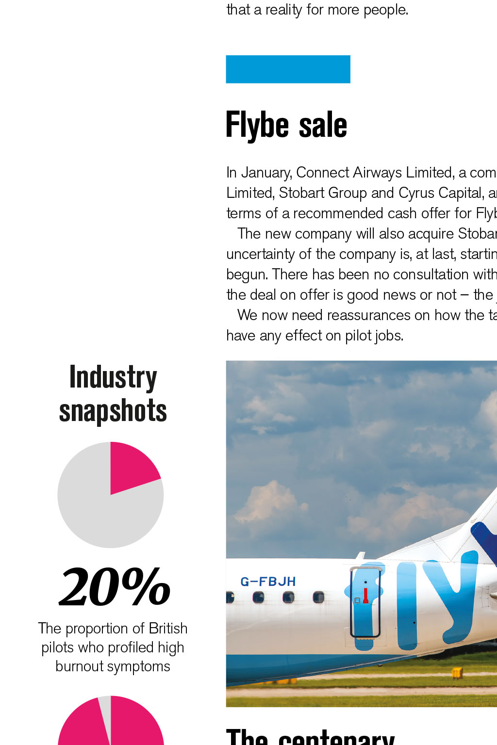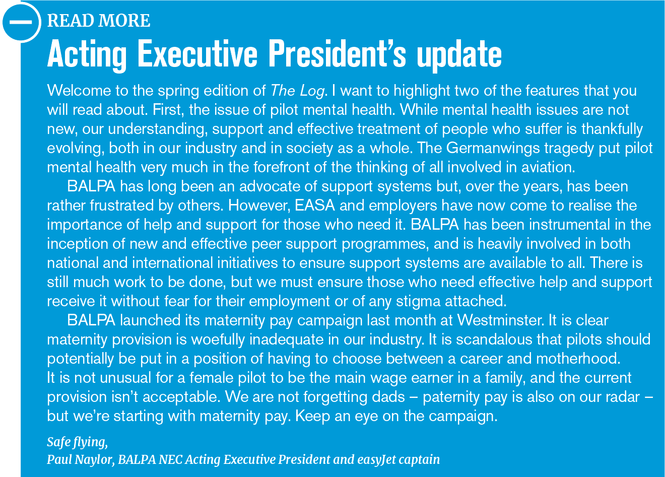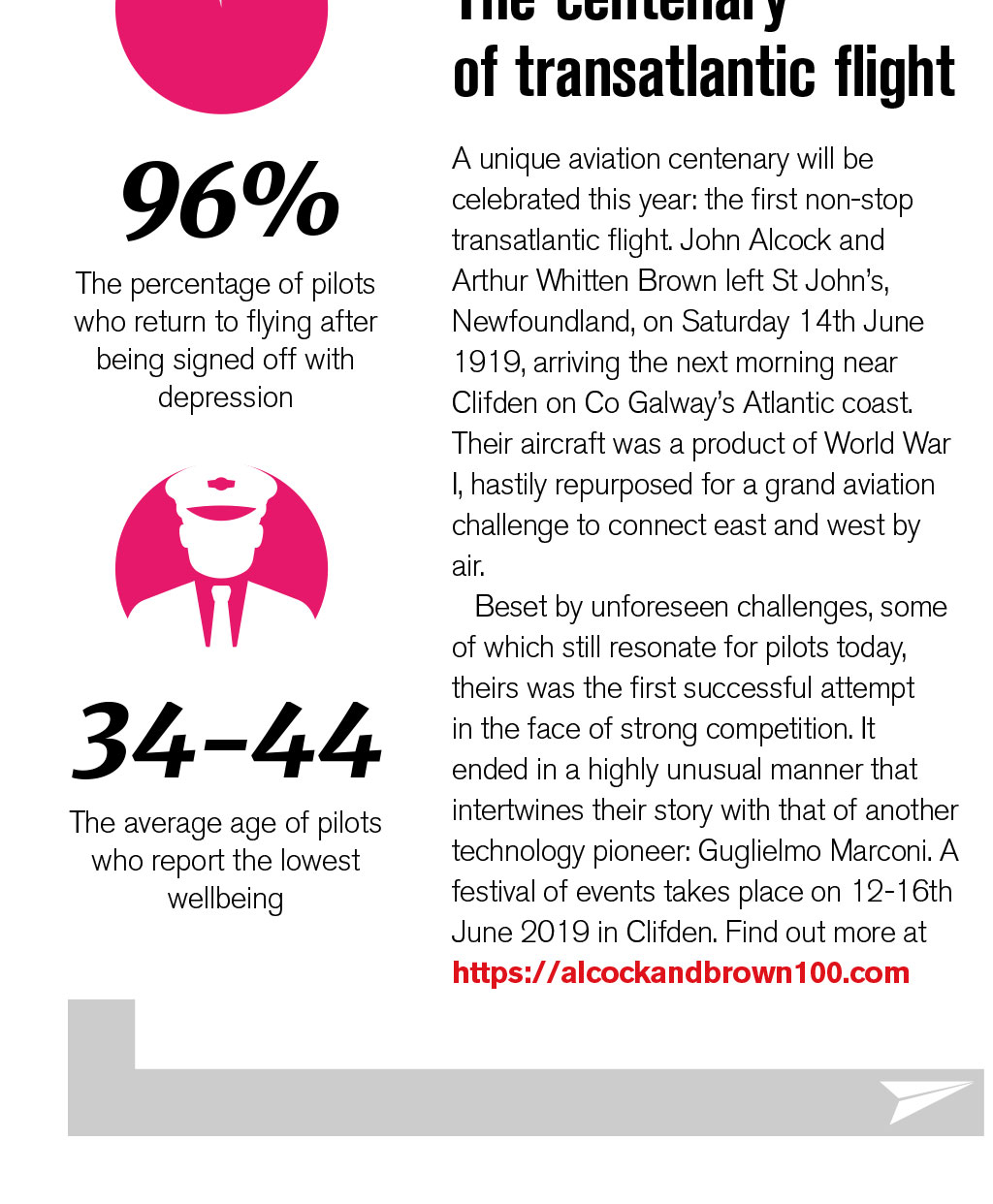 Upfront The latest in aviation and industrial news from around the world READ MORE Acting Executive President’s update Pilot apprenticeship set for take-off The first apprenticeship standard for commercial airline pilots in the UK – developed by a group of leading aviation employers and organisations – has been approved for delivery. Developed by the Aviation Industry Skills Board specialist sub-group, the apprenticeship standard has the backing of BALPA and the Honourable Company of Air Pilots, and is supported by leading aviation employers including British Airways, Flybe, EasyJet and Virgin Atlantic Airways. We have previously raised concerns over the phenomenally high cost of pilot training, which can run to £100,000 or more, meaning we could be losing out on talented potential pilots from less affluent backgrounds. Piloting should be an equal opportunities career; we hope the new pilot apprenticeship programme will make that a reality for more people. Flybe sale In January, Connect Airways Limited, a company bringing together Virgin Atlantic Limited, Stobart Group and Cyrus Capital, announced it had reached agreement on the terms of a recommended cash offer for Flybe. The new company will also acquire Stobart Air. We’re pleased to see the previous uncertainty of the company is, at last, starting to clear, but the hard work has just begun. There has been no consultation with us from Flybe, so we don’t know whether the deal on offer is good news or not – the jury is out. We now need reassurances on how the takeover will progress, and whether this will have any effect on pilot jobs. Industry snapshots 20% The proportion of British pilots who profiled high burnout symptoms 96% The percentage of pilots who return to flying after being signed off with depression 34-44 The average age of pilots who report the lowest wellbeing The centenary of transatlantic flight The Log straight to your tablet or mobile Congratulations if you’re reading this on your tablet or mobile – you’ve clearly discovered the new Log app! Following growing member feedback that you’d like an electronic way to read The Log, we have worked to fulfil this request. Our new app will give us the ability to include more images, video content and links. We’re hoping this will lead to extra advertising revenue (which helps us keep costs down) if we can offer the option of video advertising, too. Members now have the choice as to how they would like to view BALPA’s latest news and features. If you’d like to switch to the app instead of your printed subscription, just let us know. You can also read the magazine online at http://portfolio.cpl.co.uk/The-Log A unique aviation centenary will be celebrated this year: the first non-stop transatlantic flight. John Alcock and Arthur Whitten Brown left St John’s, Newfoundland, on Saturday 14th June 1919, arriving the next morning near Clifden on Co Galway’s Atlantic coast. Their aircraft was a product of World War I, hastily repurposed for a grand aviation challenge to connect east and west by air. Beset by unforeseen challenges, some of which still resonate for pilots today, theirs was the first successful attempt in the face of strong competition. It ended in a highly unusual manner that intertwines their story with that of another technology pioneer: Guglielmo Marconi. A festival of events takes place on 12-16th June 2019 in Clifden. Find out more at https://alcockandbrown100.com Drone airport chaos leads to tougher rules You were, no doubt, following the chaos caused at Gatwick and Heathrow around Christmas and the new year, indeed, some of you may have been affected by it. While the disruption was terrible for passengers and workers alike, the level of chaos gave BALPA a great chance to reiterate our calls regarding drones – and stick in a bit of an “I told you so” as well. Although the drones in question were already breaking the law, we took the opportunity to highlight how lax the current regulations were, and how we felt that this demonstrated just how careless the Government had been towards the drone issue. In the wake of the incidents, the Government realised more needed to be done, and has since announced an expansion of the restriction zone and increased police powers. It is now investing in drone-detection trials at airports – something we have welcomed. NEWS Upfront The latest in aviation and industrial news from around the world READ MORE Acting Executive President’s update Welcome to the spring edition of The Log. I want to highlight two of the features that you will read about. First, the issue of pilot mental health. While mental health issues are not new, our understanding, support and effective treatment of people who suffer is thankfully evolving, both in our industry and in society as a whole. The Germanwings tragedy put pilot mental health very much in the forefront of the thinking of all involved in aviation. BALPA has long been an advocate of support systems but, over the years, has been rather frustrated by others. However, EASA and employers have now come to realise the importance of help and support for those who need it. BALPA has been instrumental in the inception of new and effective peer support programmes, and is heavily involved in both national and international initiatives to ensure support systems are available to all. There is still much work to be done, but we must ensure those who need effective help and support receive it without fear for their employment or of any stigma attached. BALPA launched its maternity pay campaign last month at Westminster. It is clear maternity provision is woefully inadequate in our industry. It is scandalous that pilots should potentially be put in a position of having to choose between a career and motherhood. It is not unusual for a female pilot to be the main wage earner in a family, and the current provision isn’t acceptable. We are not forgetting dads – paternity pay 