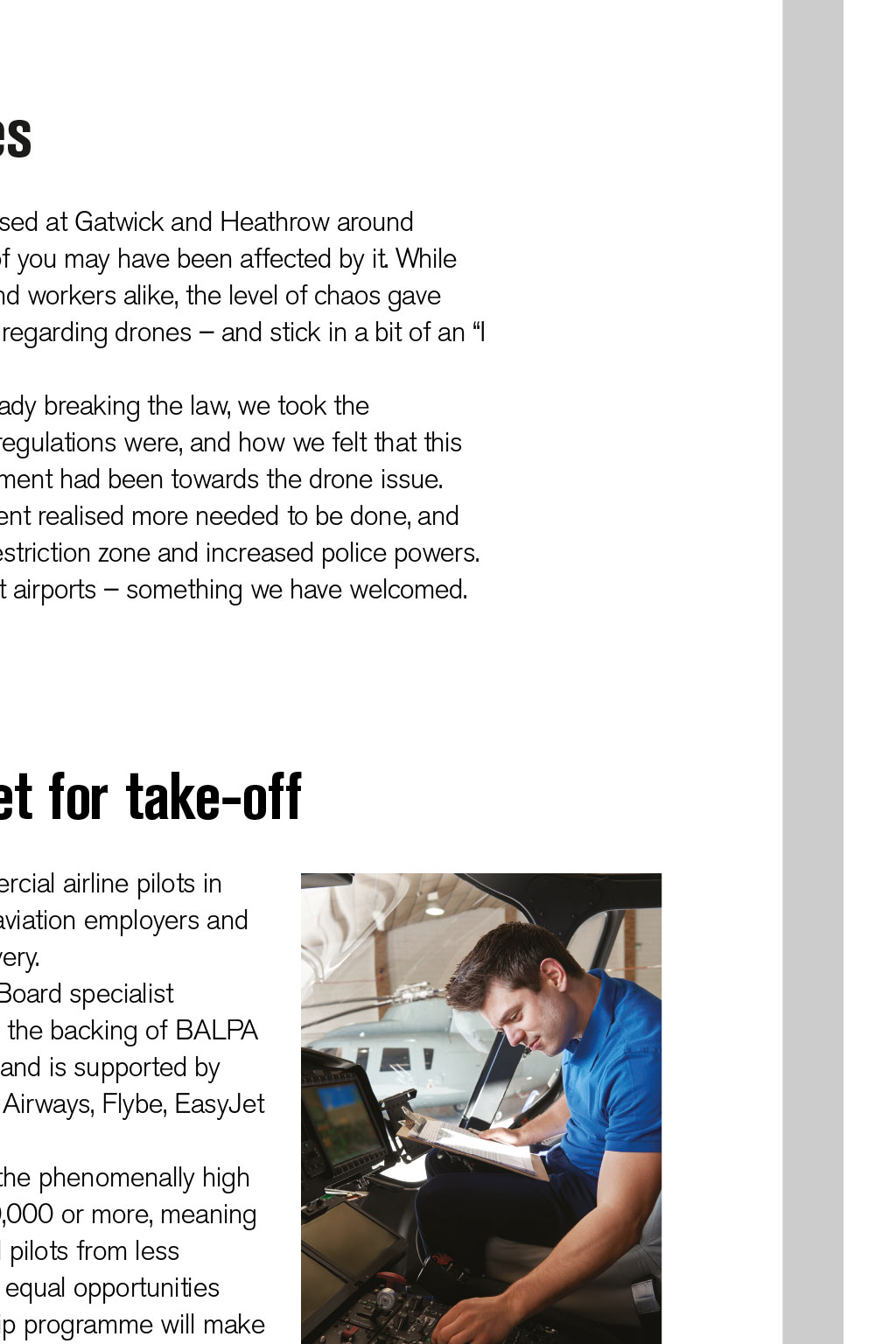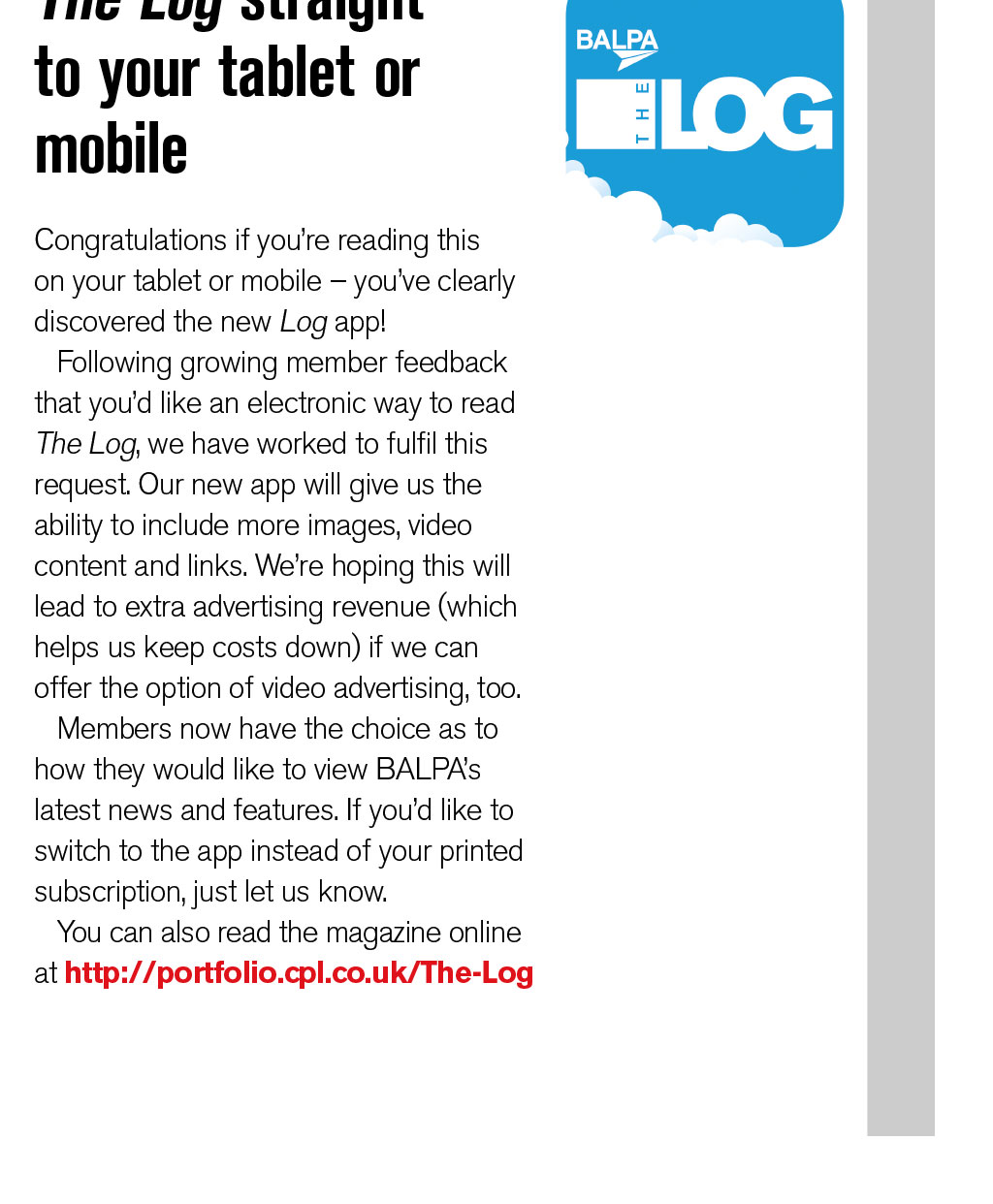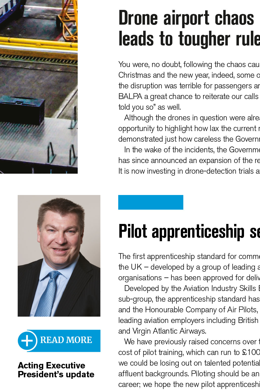 Upfront The latest in aviation and industrial news from around the world READ MORE Acting Executive President’s update Pilot apprenticeship set for take-off The first apprenticeship standard for commercial airline pilots in the UK – developed by a group of leading aviation employers and organisations – has been approved for delivery. Developed by the Aviation Industry Skills Board specialist sub-group, the apprenticeship standard has the backing of BALPA and the Honourable Company of Air Pilots, and is supported by leading aviation employers including British Airways, Flybe, EasyJet and Virgin Atlantic Airways. We have previously raised concerns over the phenomenally high cost of pilot training, which can run to £100,000 or more, meaning we could be losing out on talented potential pilots from less affluent backgrounds. Piloting should be an equal opportunities career; we hope the new pilot apprenticeship programme will make that a reality for more people. Flybe sale In January, Connect Airways Limited, a company bringing together Virgin Atlantic Limited, Stobart Group and Cyrus Capital, announced it had reached agreement on the terms of a recommended cash offer for Flybe. The new company will also acquire Stobart Air. We’re pleased to see the previous uncertainty of the company is, at last, starting to clear, but the hard work has just begun. There has been no consultation with us from Flybe, so we don’t know whether the deal on offer is good news or not – the jury is out. We now need reassurances on how the takeover will progress, and whether this will have any effect on pilot jobs. Industry snapshots 20% The proportion of British pilots who profiled high burnout symptoms 96% The percentage of pilots who return to flying after being signed off with depression 34-44 The average age of pilots who report the lowest wellbeing The centenary of transatlantic flight The Log straight to your tablet or mobile Congratulations if you’re reading this on your tablet or mobile – you’ve clearly discovered the new Log app! Following growing member feedback that you’d like an electronic way to read The Log, we have worked to fulfil this request. Our new app will give us the ability to include more images, video content and links. We’re hoping this will lead to extra advertising revenue (which helps us keep costs down) if we can offer the option of video advertising, too. Members now have the choice as to how they would like to view BALPA’s latest news and features. If you’d like to switch to the app instead of your printed subscription, just let us know. You can also read the magazine online at http://portfolio.cpl.co.uk/The-Log A unique aviation centenary will be celebrated this year: the first non-stop transatlantic flight. John Alcock and Arthur Whitten Brown left St John’s, Newfoundland, on Saturday 14th June 1919, arriving the next morning near Clifden on Co Galway’s Atlantic coast. Their aircraft was a product of World War I, hastily repurposed for a grand aviation challenge to connect east and west by air. Beset by unforeseen challenges, some of which still resonate for pilots today, theirs was the first successful attempt in the face of strong competition. It ended in a highly unusual manner that intertwines their story with that of another technology pioneer: Guglielmo Marconi. A festival of events takes place on 12-16th June 2019 in Clifden. Find out more at https://alcockandbrown100.com Drone airport chaos leads to tougher rules You were, no doubt, following the chaos caused at Gatwick and Heathrow around Christmas and the new year, indeed, some of you may have been affected by it. While the disruption was terrible for passengers and workers alike, the level of chaos gave BALPA a great chance to reiterate our calls regarding drones – and stick in a bit of an “I told you so” as well. Although the drones in question were already breaking the law, we took the opportunity to highlight how lax the current regulations were, and how we felt that this demonstrated just how careless the Government had been towards the drone issue. In the wake of the incidents, the Government realised more needed to be done, and has since announced an expansion of the restriction zone and increased police powers. It is now investing in drone-detection trials at airports – something we have welcomed. NEWS Upfront The latest in aviation and industrial news from around the world READ MORE Acting Executive President’s update Welcome to the spring edition of The Log. I want to highlight two of the features that you will read about. First, the issue of pilot mental health. While mental health issues are not new, our understanding, support and effective treatment of people who suffer is thankfully evolving, both in our industry and in society as a whole. The Germanwings tragedy put pilot mental health very much in the forefront of the thinking of all involved in aviation. BALPA has long been an advocate of support systems but, over the years, has been rather frustrated by others. However, EASA and employers have now come to realise the importance of help and support for those who need it. BALPA has been instrumental in the inception of new and effective peer support programmes, and is heavily involved in both national and international initiatives to ensure support systems are available to all. There is still much work to be done, but we must ensure those who need effective help and support receive it without fear for their employment or of any stigma attached. BALPA launched its maternity pay campaign last month at Westminster. It is clear maternity provision is woefully inadequate in our industry. It is scandalous that pilots should potentially be put in a position of having to choose between a career and motherhood. It is not unusual for a female pilot to be the main wage earner in a family, and the current provision isn’t acceptable. We are not forgetting dads – paternity pay 