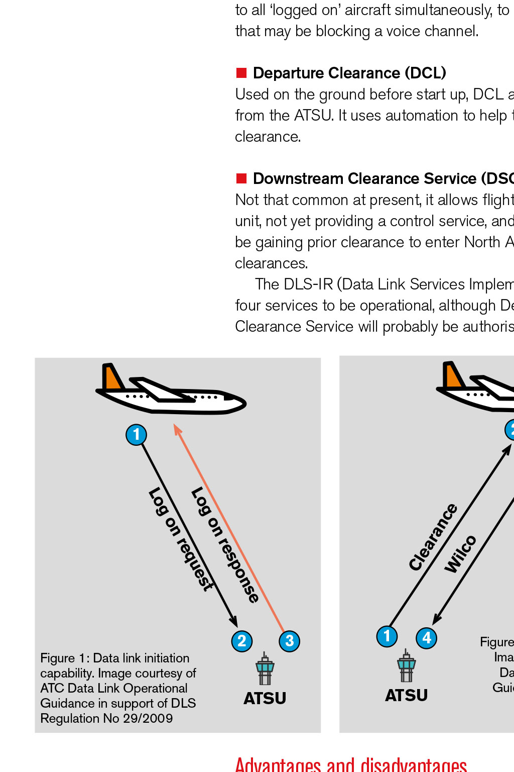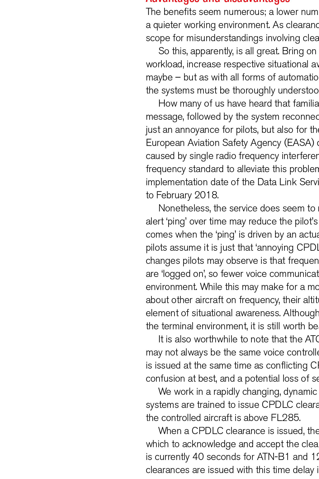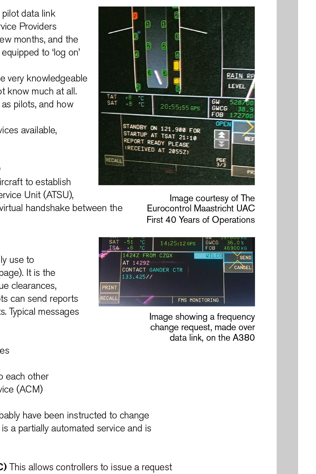 CPDLC: APPLICATION AND FUTURE TECH LOG In part two of our series, we explore how CPDLC works for pilots By Captain Jeremy Feldman, Log Board member I t seems that use of CPDLC (controller pilot data link communications) by Air Navigation Service Providers (ANSPs) has increased over the past few months, and the requirement for pilots who are CPDLC equipped to log on is growing. We know that some members will be very knowledgeable on the use of CPDLC and some will not know much at all. So, what exactly can CPDLC do for us as pilots, and how does it work? There are currently six data link services available, although not all are implemented: n Data Link Initiation Capability (DLIC) (see figure 1, below right). This allows an aircraft to establish initial communications with an Air Traffic Service Unit (ATSU), before any further use of data link like a virtual handshake between the aircraft and ground station. Image courtesy of The Eurocontrol Maastricht UAC First 40 Years of Operations nATC Clearances Service (ACL) ACL provides the service that pilots primarily use to communicate with ATC (figure 2, opposite page). It is the operational driver that can allow ATC to issue clearances, notifications and instructions. Likewise, pilots can send reports and acknowledgements, and make requests. Typical messages include, but are not Image showing a frequency limited to: change request, made over data link, on the A380 oClimb/descent clearances oNavigation, turns and headings clearances oSSR instructions oReplies both from aircraft and ATSU to each other oATC Communications Management Service (ACM) The frequent pilot users of CPDLC will probably have been instructed to change frequency and contact the next ATSU. This is a partially automated service and is provided by ACM. nATC Microphone Check Service (AMC) This allows controllers to issue a request to all logged on aircraft simultaneously, to ask pilots to check for a stuck microphone that may be blocking a voice channel. nDeparture Clearance (DCL) Used on the ground before start up, DCL allows pilots to request departure clearance from the ATSU. It uses automation to help the controllers issue the respective clearance. nDownstream Clearance Service (DSC) Not that common at present, it allows flight crews to contact another ATS unit, not yet providing a control service, and request a clearance. An example would be gaining prior clearance to enter North Atlantic airspace and other oceanic clearances. The DLS-IR (Data Link Services Implementing Rule) has only mandated the first four services to be operational, although Departure Clearance and Downstream Clearance Service will probably be authorised in the future. Aircraft A Cl ea ran ce W ilc o 3 ATSU 1 4 ATSU 2 2 ic km tuc ks ec Ch e ns po es nr go st Lo ue eq nr go Lo Figure 1: Data link initiation capability. Image courtesy of ATC Data Link Operational Guidance insupport of DLS Regulation No 29/2009 2 3 Figure 2: ATC clearances Image courtesy of ATC Data Link Operational Guidance in support of DLS Regulation No 29/2009 Image courtesy of ATC Data Link Operational Guidance in support of DLS Regulation No 29/2009 Ch ec ks tuc km ic 2 1 Aircraft B 1 Sector Advantages and disadvantages The benefits seem numerous; a lower number of voice communications can make for a quieter working environment. As clearances are digital, there is perhaps also less scope for misunderstandings involving clearances and frequency changes. So this, apparently, is all great. Bring on the automation, reduce pilot and controller workload, increase respective situational awareness and all is good, right? Well, maybe but as with all forms of automation, the limitations and associated risks of the systems must be thoroughly understood. How many of us have heard that familiar ping and the CPDLC disconnected message, followed by the system reconnecting and then disconnecting? This is not just an annoyance for pilots, but also for the corresponding ATSUs. Analysis by the European Aviation Safety Agency (EASA) determined that this problem was, in part, caused by single radio frequency interference. EASA has since mandated a multifrequency standard to alleviate this problem, and its one of the reasons the fullimplementation date of the Data Link Services Implementing Rule was pushed back to February 2018. Nonetheless, the service does seem to randomly disconnect, and the incessant alert ping over time may reduce the pilots sensitivity to it. The problem, of course, comes when the ping is driven by an actual aircraft fault requiring attention and the pilots assume it is just that annoying CPDLC again. One of the more noticeable changes pilots may observe is that frequencies become quieter as more aircraft are logged on, so fewer voice communications can make for a quieter working environment. While this may make for a more peaceful ride, the lack of information about other aircraft on frequency, their altitude and flight path may remove a key element of situational awareness. Although this threat is perhaps more prevalent in the terminal environment, it is still worth bearing in mind. It is also worthwhile to note that the ATC operator issuing the CPDLC clearance may not always be the same voice controller. In the scenario where a voice clearance is issued at the same time as conflicting CPDLC clearance is issued, this may lead to confusion at best, and a potential loss of separation or of communications at worst. We work in a rapidly changing, dynamic environment; consequently, automated systems are trained to issue CPDLC clearances only when it is not time critical and the controlled aircraft is above FL285. When a CPDLC clearance is issued, the pilots have a certain amount of time in which to acknowledge and accept the clearance. Within Maastricht airspace, this is currently 40 seconds for ATN-B1 and 120 seconds for FANS-2. So CPDLC clearances are issued with this time delay in mind and the threat of time-critical clearance conflic