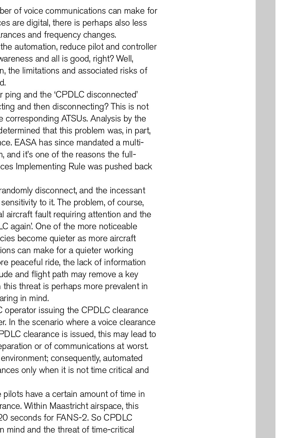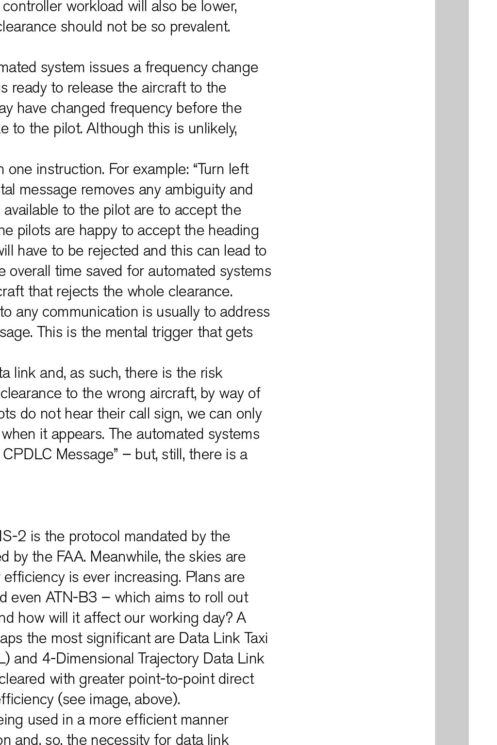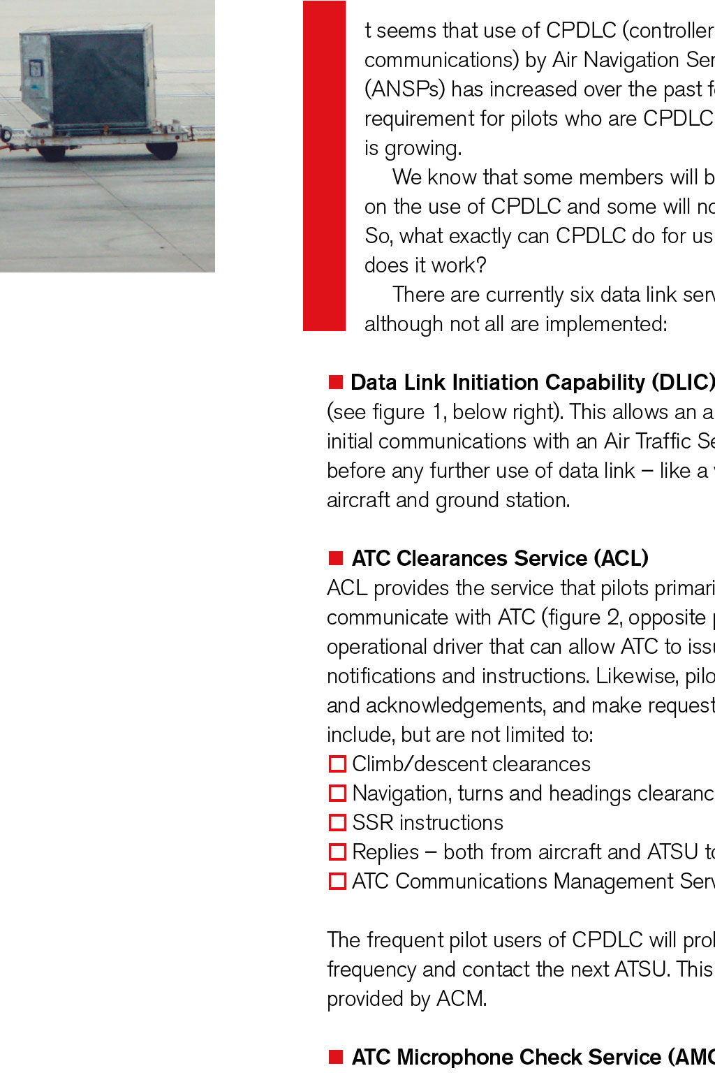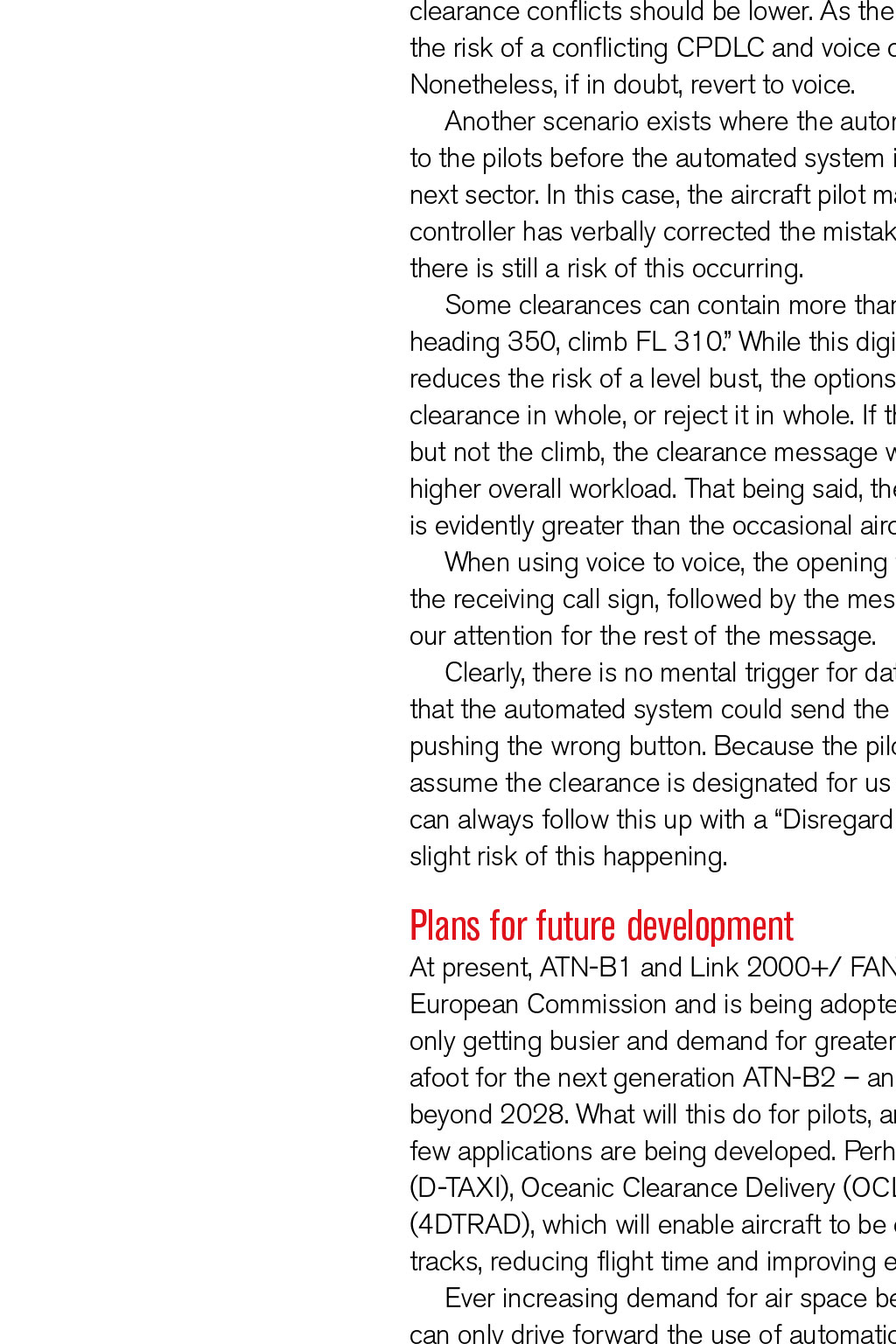 CPDLC: APPLICATION AND FUTURE TECH LOG In part two of our series, we explore how CPDLC works for pilots By Captain Jeremy Feldman, Log Board member I t seems that use of CPDLC (controller pilot data link communications) by Air Navigation Service Providers (ANSPs) has increased over the past few months, and the requirement for pilots who are CPDLC equipped to log on is growing. We know that some members will be very knowledgeable on the use of CPDLC and some will not know much at all. So, what exactly can CPDLC do for us as pilots, and how does it work? There are currently six data link services available, although not all are implemented: n Data Link Initiation Capability (DLIC) (see figure 1, below right). This allows an aircraft to establish initial communications with an Air Traffic Service Unit (ATSU), before any further use of data link like a virtual handshake between the aircraft and ground station. Image courtesy of The Eurocontrol Maastricht UAC First 40 Years of Operations nATC Clearances Service (ACL) ACL provides the service that pilots primarily use to communicate with ATC (figure 2, opposite page). It is the operational driver that can allow ATC to issue clearances, notifications and instructions. Likewise, pilots can send reports and acknowledgements, and make requests. Typical messages include, but are not Image showing a frequency limited to: change request, made over data link, on the A380 oClimb/descent clearances oNavigation, turns and headings clearances oSSR instructions oReplies both from aircraft and ATSU to each other oATC Communications Management Service (ACM) The frequent pilot users of CPDLC will probably have been instructed to change frequency and contact the next ATSU. This is a partially automated service and is provided by ACM. nATC Microphone Check Service (AMC) This allows controllers to issue a request to all logged on aircraft simultaneously, to ask pilots to check for a stuck microphone that may be blocking a voice channel. nDeparture Clearance (DCL) Used on the ground before start up, DCL allows pilots to request departure clearance from the ATSU. It uses automation to help the controllers issue the respective clearance. nDownstream Clearance Service (DSC) Not that common at present, it allows flight crews to contact another ATS unit, not yet providing a control service, and request a clearance. An example would be gaining prior clearance to enter North Atlantic airspace and other oceanic clearances. The DLS-IR (Data Link Services Implementing Rule) has only mandated the first four services to be operational, although Departure Clearance and Downstream Clearance Service will probably be authorised in the future. Aircraft A Cl ea ran ce W ilc o 3 ATSU 1 4 ATSU 2 2 ic km tuc ks ec Ch e ns po es nr go st Lo ue eq nr go Lo Figure 1: Data link initiation capability. Image courtesy of ATC Data Link Operational Guidance insupport of DLS Regulation No 29/2009 2 3 Figure 2: ATC clearances Image courtesy of ATC Data Link Operational Guidance in support of DLS Regulation No 29/2009 Image courtesy of ATC Data Link Operational Guidance in support of DLS Regulation No 29/2009 Ch ec ks tuc km ic 2 1 Aircraft B 1 Sector Advantages and disadvantages The benefits seem numerous; a lower number of voice communications can make for a quieter working environment. As clearances are digital, there is perhaps also less scope for misunderstandings involving clearances and frequency changes. So this, apparently, is all great. Bring on the automation, reduce pilot and controller workload, increase respective situational awareness and all is good, right? Well, maybe but as with all forms of automation, the limitations and associated risks of the systems must be thoroughly understood. How many of us have heard that familiar ping and the CPDLC disconnected message, followed by the system reconnecting and then disconnecting? This is not just an annoyance for pilots, but also for the corresponding ATSUs. Analysis by the European Aviation Safety Agency (EASA) determined that this problem was, in part, caused by single radio frequency interference. EASA has since mandated a multifrequency standard to alleviate this problem, and its one of the reasons the fullimplementation date of the Data Link Services Implementing Rule was pushed back to February 2018. Nonetheless, the service does seem to randomly disconnect, and the incessant alert ping over time may reduce the pilots sensitivity to it. The problem, of course, comes when the ping is driven by an actual aircraft fault requiring attention and the pilots assume it is just that annoying CPDLC again. One of the more noticeable changes pilots may observe is that frequencies become quieter as more aircraft are logged on, so fewer voice communications can make for a quieter working environment. While this may make for a more peaceful ride, the lack of information about other aircraft on frequency, their altitude and flight path may remove a key element of situational awareness. Although this threat is perhaps more prevalent in the terminal environment, it is still worth bearing in mind. It is also worthwhile to note that the ATC operator issuing the CPDLC clearance may not always be the same voice controller. In the scenario where a voice clearance is issued at the same time as conflicting CPDLC clearance is issued, this may lead to confusion at best, and a potential loss of separation or of communications at worst. We work in a rapidly changing, dynamic environment; consequently, automated systems are trained to issue CPDLC clearances only when it is not time critical and the controlled aircraft is above FL285. When a CPDLC clearance is issued, the pilots have a certain amount of time in which to acknowledge and accept the clearance. Within Maastricht airspace, this is currently 40 seconds for ATN-B1 and 120 seconds for FANS-2. So CPDLC clearances are issued with this time delay in mind and the threat of time-critical clearance conflic
