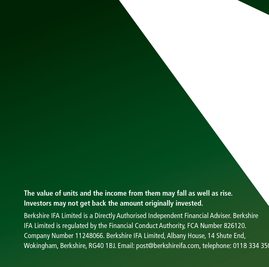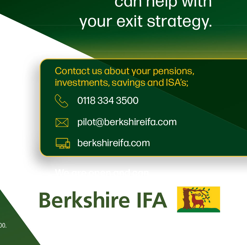 Over 20 years employed as a pilot? 2020 EXIT Berkshire Independent Financial Advisers can help with your exit strategy. Contact us about your pensions, investments, savings and ISAs; 0118 334 3500 pilot@berkshireifa.com berkshireifa.com The value of units and the income from them may fall as well as rise. Investors may not get back the amount originally invested. Berkshire IFA Limited is a Directly Authorised Independent Financial Adviser. Berkshire IFA Limited is regulated by the Financial Conduct Authority, FCA Number 826120. Company Number 11248066. Berkshire IFA Limited, Albany House, 14 Shute End, Wokingham, Berkshire, RG40 1BJ. Email: post@berkshireifa.com, telephone: 0118 334 3500. We are open and can conduct video meetings Berkshire IFA