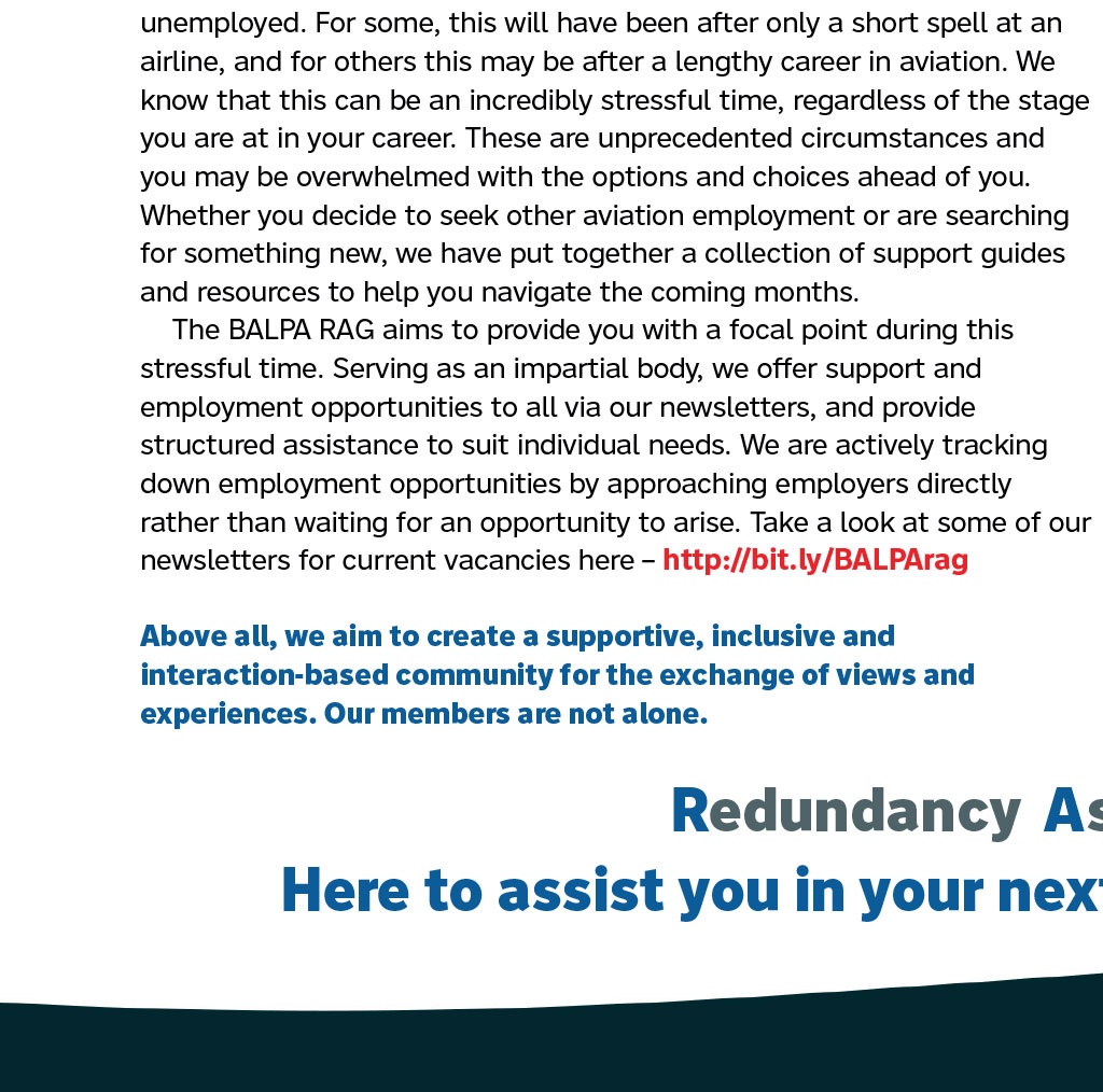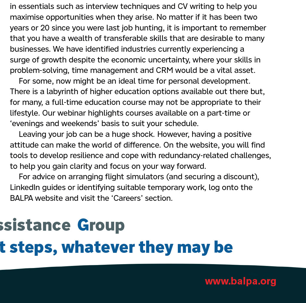 Worried about the future? We are here to support you! With the aviation industry contracting daily, many have found themselves unemployed. For some, this will have been after only a short spell at an airline, and for others this may be after a lengthy career in aviation. We know that this can be an incredibly stressful time, regardless of the stage you are at in your career. These are unprecedented circumstances and you may be overwhelmed with the options and choices ahead of you. Whether you decide to seek other aviation employment or are searching for something new, we have put together a collection of support guides and resources to help you navigate the coming months. The BALPA RAG aims to provide you with a focal point during this stressful time. Serving as an impartial body, we offer support and employment opportunities to all via our newsletters, and provide structured assistance to suit individual needs. We are actively tracking down employment opportunities by approaching employers directly rather than waiting for an opportunity to arise. Take a look at some of our newsletters for current vacancies here http://bit.ly/BALPArag Above all, we aim to create a supportive, inclusive and interaction-based community for the exchange of views and experiences. Our members are not alone. The RAG is more than a just list of jobs. We provide training packages in essentials such as interview techniques and CV writing to help you maximise opportunities when they arise. No matter if it has been two years or 20 since you were last job hunting, it is important to remember that you have a wealth of transferable skills that are desirable to many businesses. We have identified industries currently experiencing a surge of growth despite the economic uncertainty, where your skills in problem-solving, time management and CRM would be a vital asset. For some, now might be an ideal time for personal development. There is a labyrinth of higher education options available out there but, for many, a full-time education course may not be appropriate to their lifestyle. Our webinar highlights courses available on a part-time or evenings and weekends basis to suit your schedule. Leaving your job can be a huge shock. However, having a positive attitude can make the world of difference. On the website, you will find tools to develop resilience and cope with redundancy-related challenges, to help you gain clarity and focus on your way forward. For advice on arranging flight simulators (and securing a discount), LinkedIn guides or identifying suitable temporary work, log onto the BALPA website and visit the Careers section. Redundancy Assistance Group Here to assist you in your next steps, whatever they may be www.balpa.org