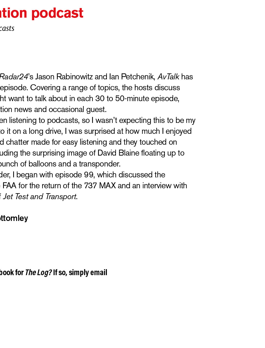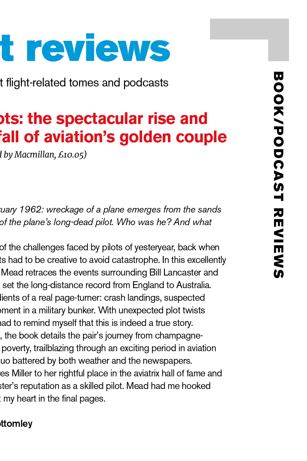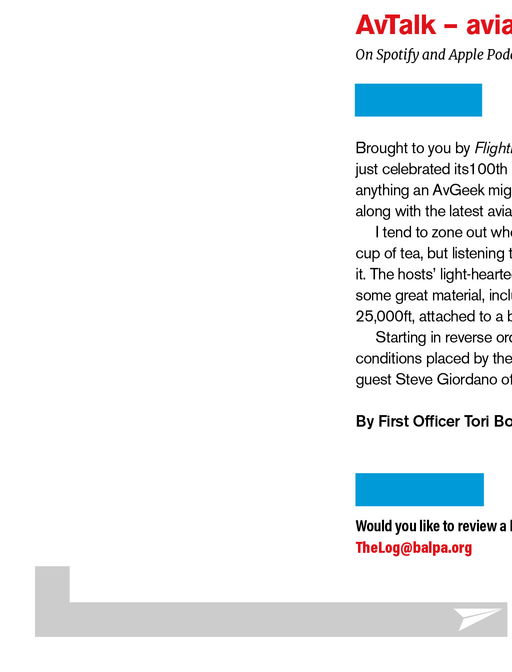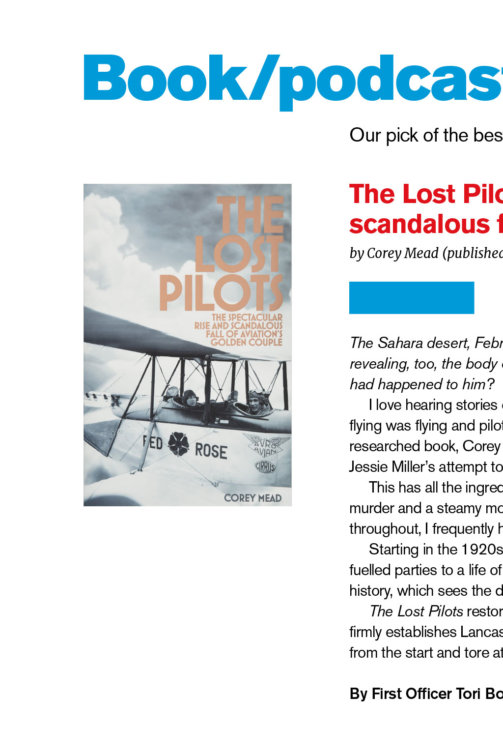The Lost Pilots: the spectacular rise and scandalous fall of aviations golden couple by Corey Mead (published by Macmillan, 10.05) The Sahara desert, February 1962: wreckage of a plane emerges from the sands revealing, too, the body of the planes long-dead pilot. Who was he? And what had happened to him? I love hearing stories of the challenges faced by pilots of yesteryear, back when flying was flying and pilots had to be creative to avoid catastrophe. In this excellently researched book, Corey Mead retraces the events surrounding Bill Lancaster and Jessie Millers attempt to set the long-distance record from England to Australia. This has all the ingredients of a real page-turner: crash landings, suspected murder and a steamy moment in a military bunker. With unexpected plot twists throughout, I frequently had to remind myself that this is indeed a true story. Starting in the 1920s, the book details the pairs journey from champagnefuelled parties to a life of poverty, trailblazing through an exciting period in aviation history, which sees the duo battered by both weather and the newspapers. The Lost Pilots restores Miller to her rightful place in the aviatrix hall of fame and firmly establishes Lancasters reputation as a skilled pilot. Mead had me hooked from the start and tore at my heart in the final pages. By First Officer Tori Bottomley AvTalk aviation podcast On Spotify and Apple Podcasts Brought to you by FlightRadar24s Jason Rabinowitz and Ian Petchenik, AvTalk has just celebrated its100th episode. Covering a range of topics, the hosts discuss anything an AvGeek might want to talk about in each 30 to 50-minute episode, along with the latest aviation news and occasional guest. I tend to zone out when listening to podcasts, so I wasnt expecting this to be my cup of tea, but listening to it on a long drive, I was surprised at how much I enjoyed it. The hosts light-hearted chatter made for easy listening and they touched on some great material, including the surprising image of David Blaine floating up to 25,000ft, attached to a bunch of balloons and a transponder. Starting in reverse order, I began with episode 99, which discussed the conditions placed by the FAA for the return of the 737 MAX and an interview with guest Steve Giordano of Jet Test and Transport. By First Officer Tori Bottomley Would you like to review a book for The Log? If so, simply email TheLog@balpa.org BOO K /P O DCAS T R EVI EWS Our pick of the best flight-related tomes and podcasts