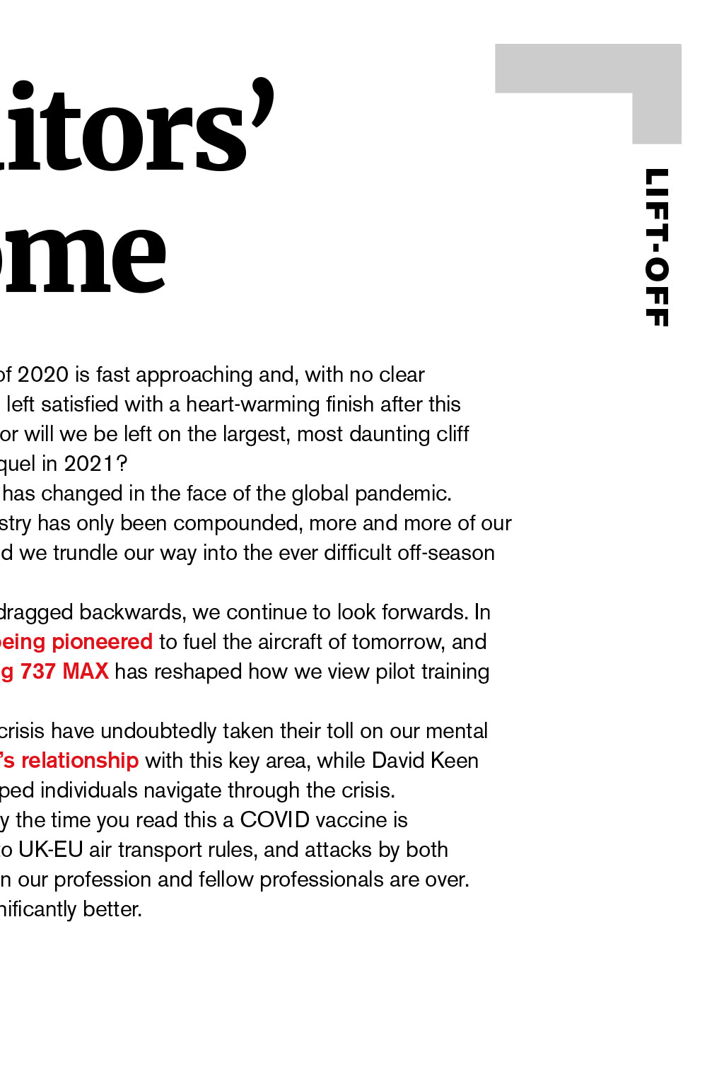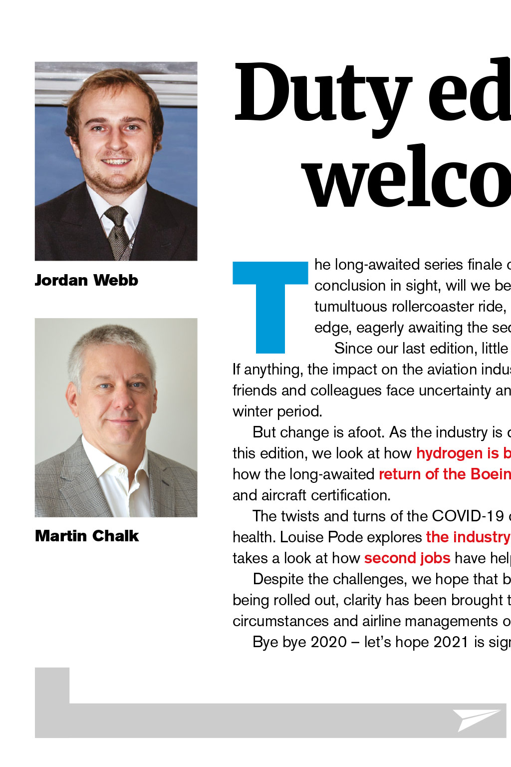Jordan Webb Martin Chalk The long-awaited series finale of 2020 is fast approaching and, with no clear conclusion in sight, will we be left satisfied with a heart-warming finish after this tumultuous rollercoaster ride, or will we be left on the largest, most daunting cliff edge, eagerly awaiting the sequel in 2021? Since our last edition, little has changed in the face of the global pandemic. If anything, the impact on the aviation industry has only been compounded, more and more of our friends and colleagues face uncertainty and we trundle our way into the ever difficult off-season winter period. But change is afoot. As the industry is dragged backwards, we continue to look forwards. In this edition, we look at how hydrogen is being pioneered to fuel the aircraft of tomorrow, and how the long-awaited return of the Boeing 737 MAX has reshaped how we view pilot training and aircraft certification. The twists and turns of the COVID-19 crisis have undoubtedly taken their toll on our mental health. Louise Pode explores the industrys relationship with this key area, while David Keen takes a look at how second jobs have helped individuals navigate through the crisis. Despite the challenges, we hope that by the time you read this a COVID vaccine is being rolled out, clarity has been brought to UK-EU air transport rules, and attacks by both circumstances and airline managements on our profession and fellow professionals are over. Bye bye 2020 lets hope 2021 is significantly better. LIFT-OFF