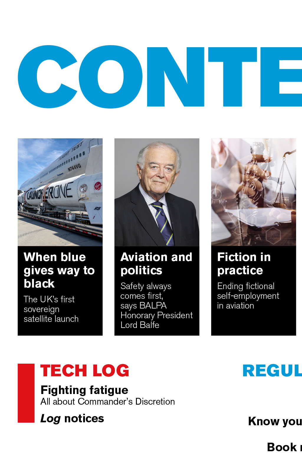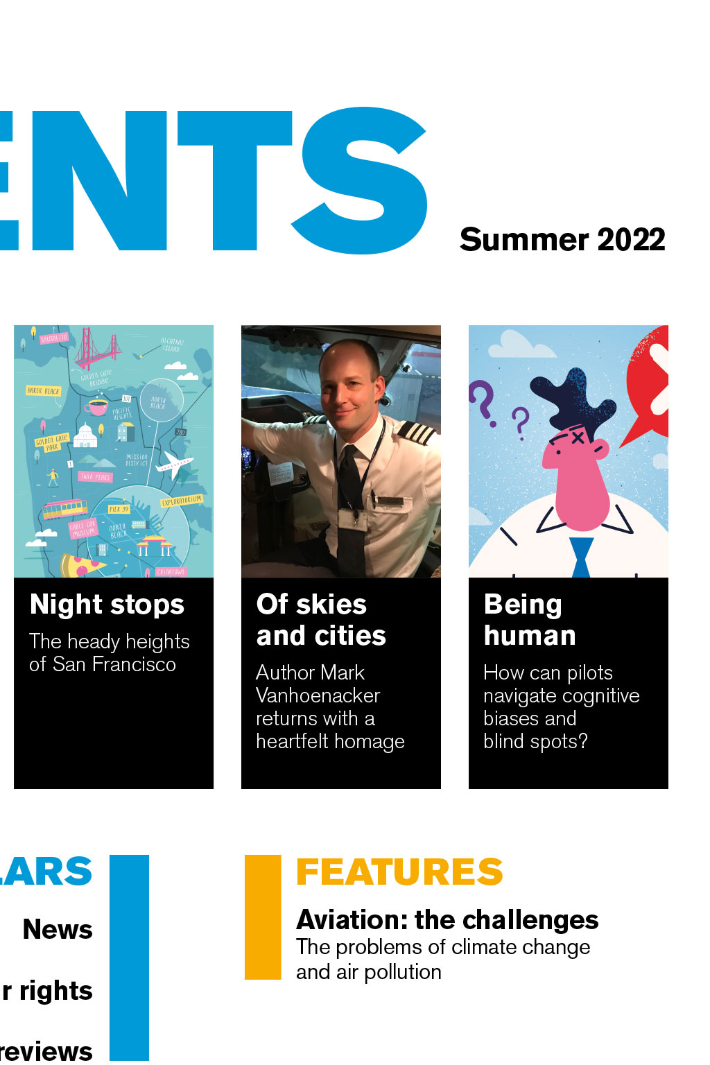 CONTENTS When blue gives way to black The UKs first sovereign satellite launch Aviation and politics Fiction in practice Safety always comes first, says BALPA Honorary President Lord Balfe Ending fictional self-employment in aviation Night stops The heady heights of San Francisco TECH LOG REGULARS Fighting fatigue News All about Commanders Discretion Log notices Know your rights Book reviews Summer 2022 Of skies and cities Being human Author Mark Vanhoenacker returns with a heartfelt homage How can pilots navigate cognitive biases and blind spots? FEATURES Aviation: the challenges The problems of climate change and air pollution