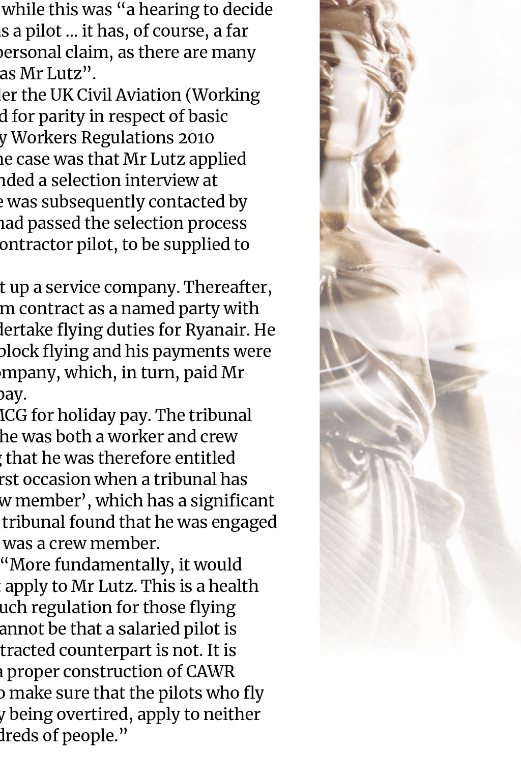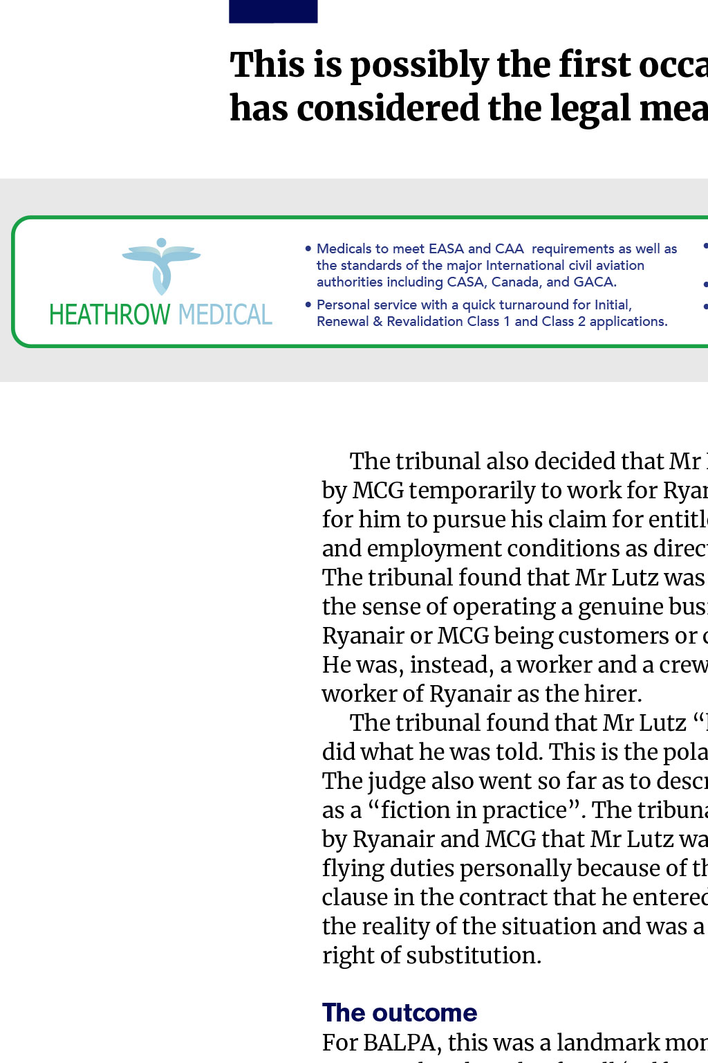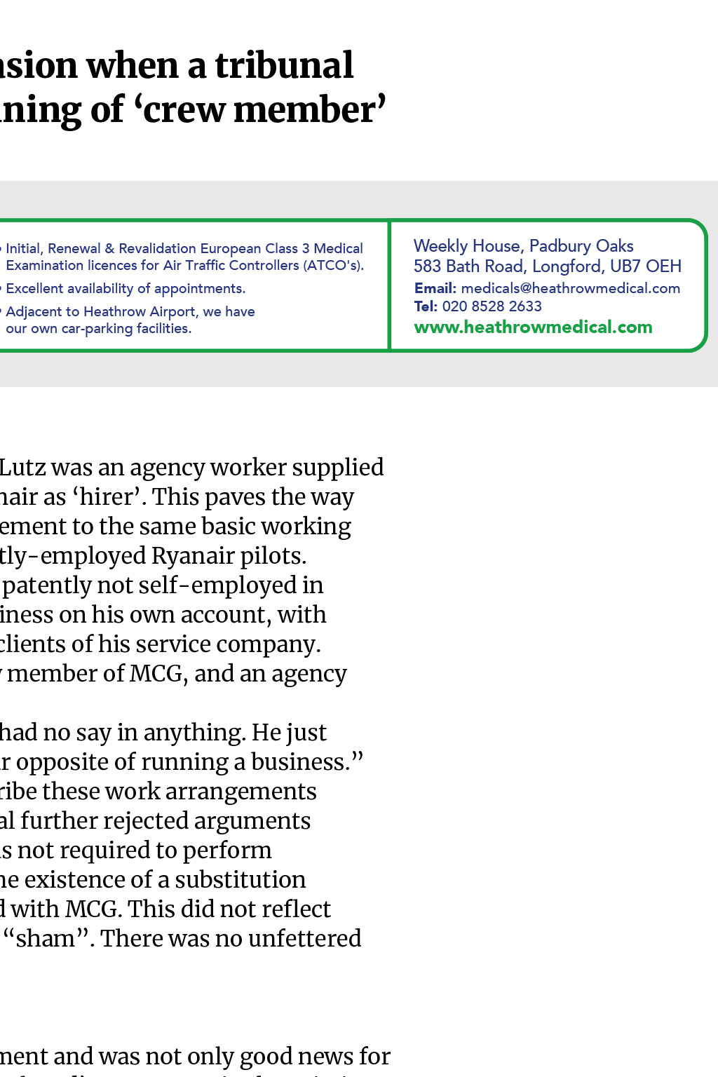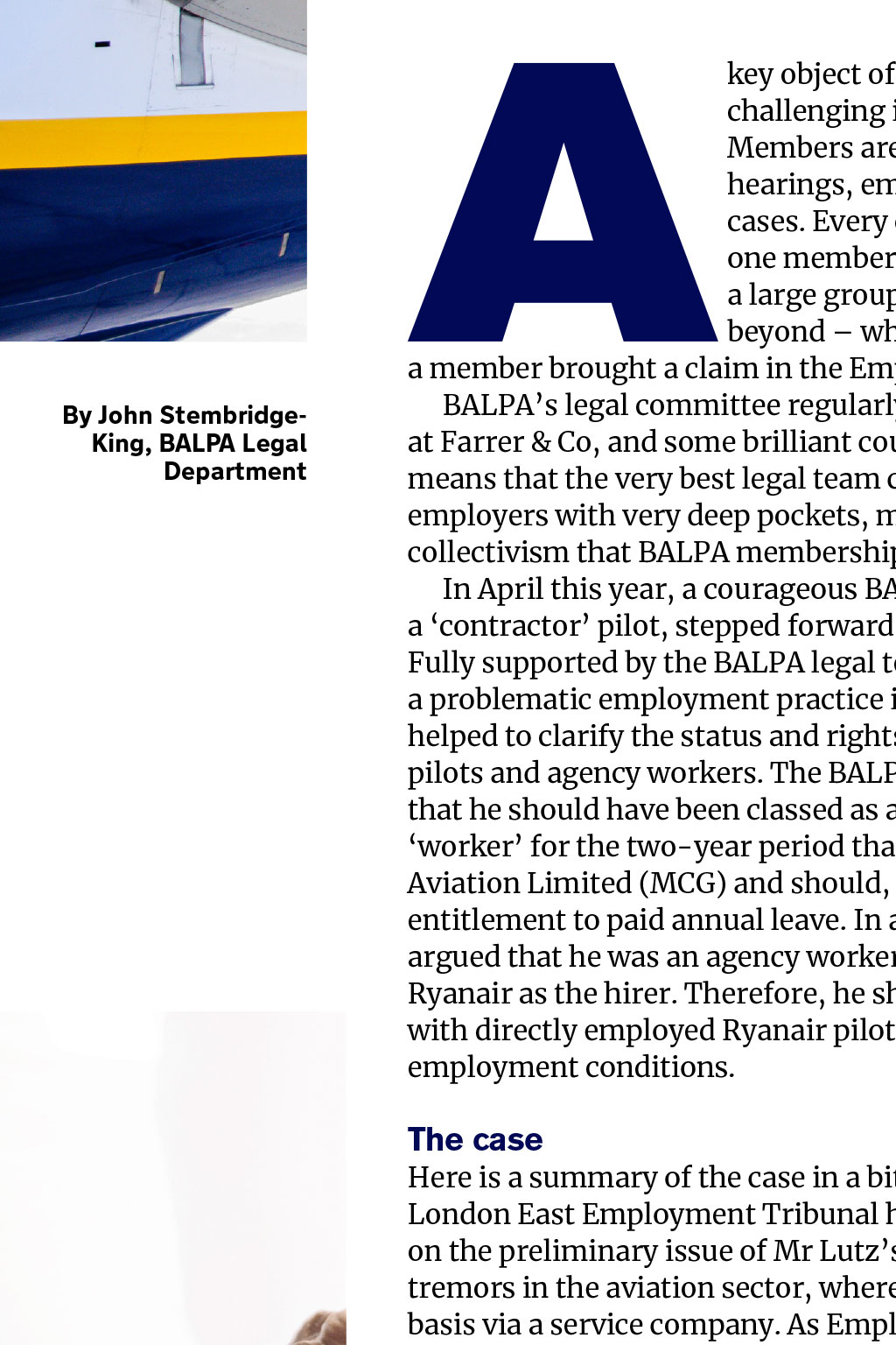LEGAL A BALPA win in the employment tribunal brings a welcome step forward to end fictional self-employment in aviation Fiction in practice By John StembridgeKing, BALPA Legal Department key object of BALPA is to assist members facing challenging issues in the aviation workplace. Members are supported through disciplinary hearings, employment tribunals and court cases. Every case is different. Some affect just one member; others can have an impact on a large group of individuals, in aviation and beyond which is what happened recently when a member brought a claim in the Employment Tribunal. BALPAs legal committee regularly works with first-rate solicitors at Farrer & Co, and some brilliant counsel at Old Square Chambers. This means that the very best legal team can be deployed against intransigent employers with very deep pockets, making excellent use of the collectivism that BALPA membership affords. In April this year, a courageous BALPA member, Jason Lutz, a contractor pilot, stepped forward in an employment tribunal. Fully supported by the BALPA legal team, he shone a spotlight on a problematic employment practice in the aviation industry, which helped to clarify the status and rights of so-called self-employed pilots and agency workers. The BALPA-appointed lawyers argued that he should have been classed as a crew member as well as a worker for the two-year period that he was engaged by McGinley Aviation Limited (MCG) and should, therefore, have received a basic entitlement to paid annual leave. In addition, it was successfully argued that he was an agency worker supplied by MCG to its client Ryanair as the hirer. Therefore, he should also have been afforded parity with directly employed Ryanair pilots in respect of basic working and employment conditions. The case Here is a summary of the case in a bit more detail. On 5 April 2022, the London East Employment Tribunal handed down judgment in a ruling on the preliminary issue of Mr Lutzs employment status that will cause tremors in the aviation sector, where pilots are engaged on a contractor basis via a service company. As Employment Judge Housego noted in the opening paragraph of the judgment, while this was a hearing to decide about Mr Lutzs status in his role as a pilot it has, of course, a far greater significance than Mr Lutzs personal claim, as there are many pilots in precisely the same position as Mr Lutz. The claim was for holiday pay under the UK Civil Aviation (Working Time Regulations) 2004 (CAWR), and for parity in respect of basic working conditions under the Agency Workers Regulations 2010 (AWR). In brief, the background to the case was that Mr Lutz applied to become a pilot at Ryanair. He attended a selection interview at Ryanairs headquarters in Dublin. He was subsequently contacted Sim sessions have been by adjusted to suit the pilots on the day a third party, MCG, and told that he had passed the selection process and was to be engaged by MCG as a contractor pilot, to be supplied to its client, Ryanair. MCG dictated that he needed to set up a service company. Thereafter, Mr Lutz entered a five-year fixed term contract as a named party with MCG and the service company to undertake flying duties for Ryanair. He was paid for each scheduled hour of block flying and his payments were channelled by MCG via the service company, which, in turn, paid Mr Lutz. He never received any holiday pay. Mr Lutz brought a claim against MCG for holiday pay. The tribunal decided, as a preliminary issue, that he was both a worker and crew member engaged by MCG, signalling that he was therefore entitled to holiday pay. This is possibly the first occasion when a tribunal has considered the legal meaning of crew member, which has a significant impact on the aviation industry. The tribunal found that he was engaged under a contract by MCG and that he was a crew member. The tribunal further commented: More fundamentally, it would be extraordinary if the CAWR did not apply to Mr Lutz. This is a health and safety regulation. The need for such regulation for those flying passenger aeroplanes is obvious. It cannot be that a salaried pilot is subject to the CAWR, but his/her contracted counterpart is not. It is impossible to contemplate that it is a proper construction of CAWR that these regulations, put in place to make sure that the pilots who fly passenger planes are not impaired by being overtired, apply to neither Airlines are gradually easing their staff back in pilot of a passenger jet carrying hundreds of people. This is possibly the first occasion when a tribunal has considered the legal meaning of crew member Examination licences for Air Trafc Controllers (ATCO s). Weekly House, Padbury Oaks 583 Bath Road, Longford, UB7 OEH our own car-parking facilities. www.heathrowmedical.com Medicals to meet EASA and CAA requirements as well as Initial, Renewal & Revalidation European Class 3 Medical Personal service with a quick turnaround for Initial, Excellent availability of appointments. Adjacent to Heathrow Airport, we have the standards of the major International civil aviation authorities including CASA, Canada, and GACA. Renewal & Revalidation Class 1 and Class 2 applications. The tribunal also decided that Mr Lutz was an agency worker supplied by MCG temporarily to work for Ryanair as hirer. This paves the way for him to pursue his claim for entitlement to the same basic working and employment conditions as directly-employed Ryanair pilots. The tribunal found that Mr Lutz was patently not self-employed in the sense of operating a genuine business on his own account, with Ryanair or MCG being customers or clients of his service company. He was, instead, a worker and a crew member of MCG, and an agency worker of Ryanair as the hirer. The tribunal found that Mr Lutz had no say in anything. He just did what he was told. This is the polar opposite of running a business. The judge also went so far as to describe these work arrangements as a fictio