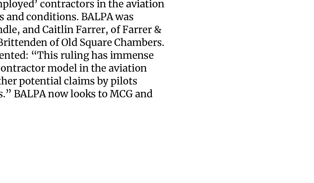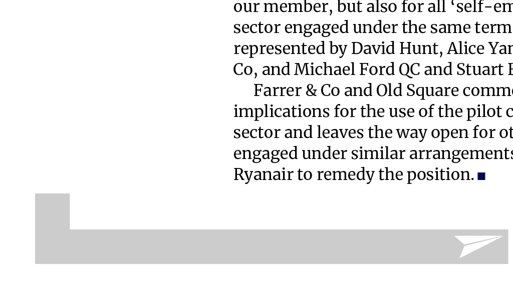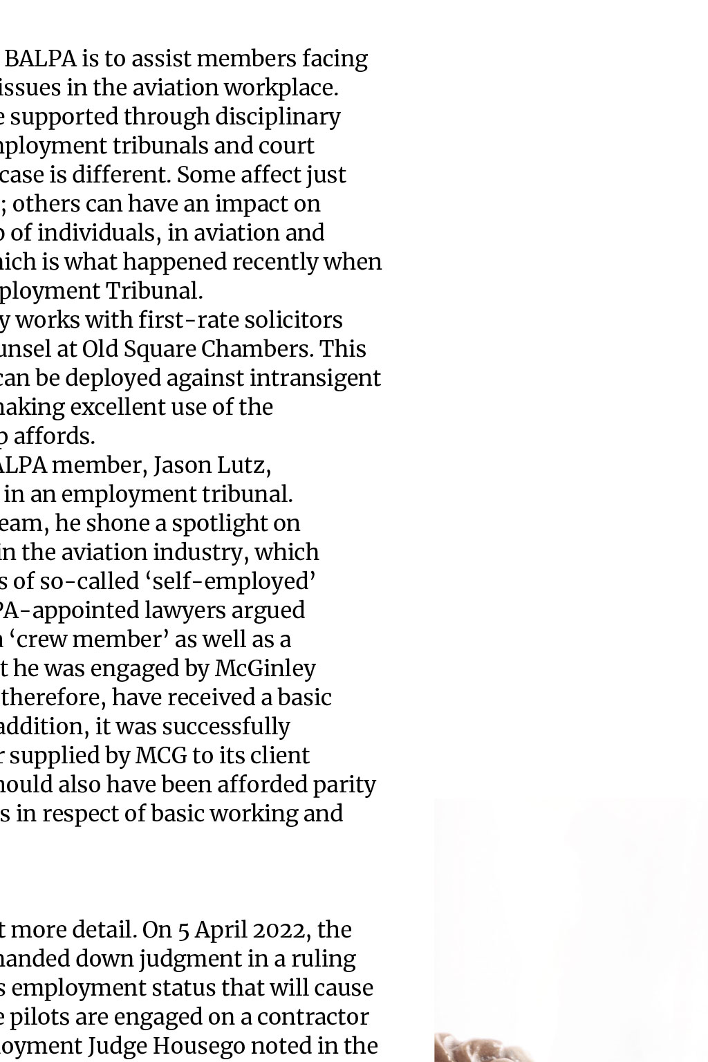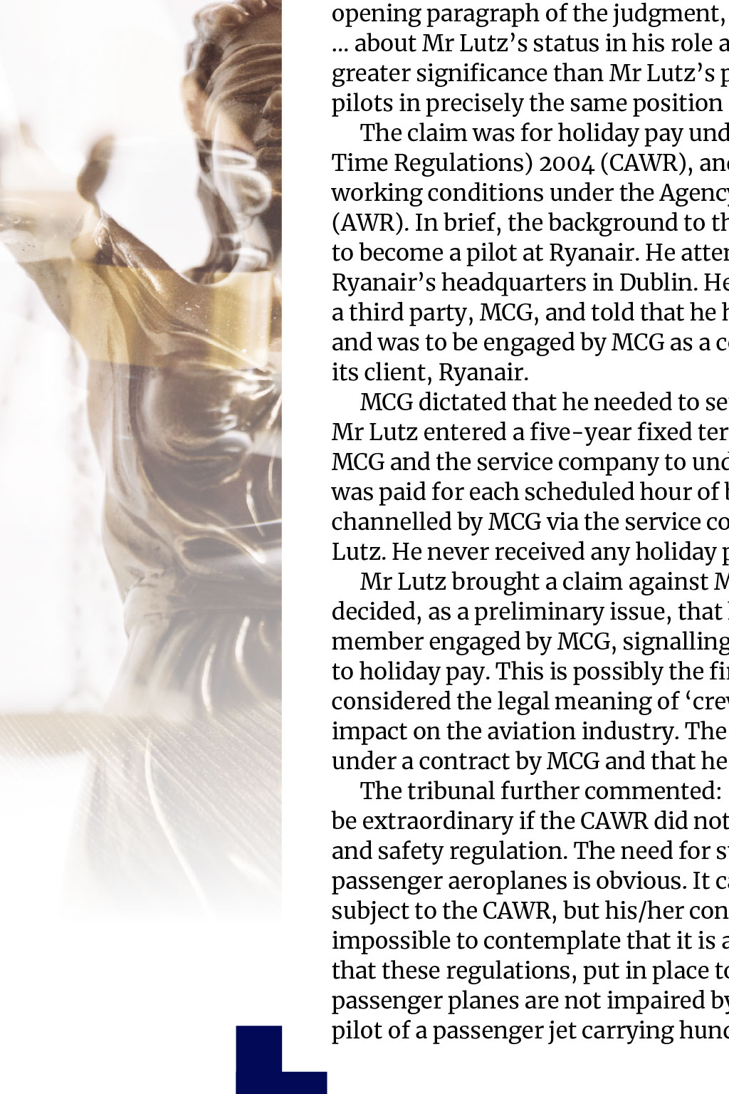 LEGAL A BALPA win in the employment tribunal brings a welcome step forward to end fictional self-employment in aviation Fiction in practice By John StembridgeKing, BALPA Legal Department key object of BALPA is to assist members facing challenging issues in the aviation workplace. Members are supported through disciplinary hearings, employment tribunals and court cases. Every case is different. Some affect just one member; others can have an impact on a large group of individuals, in aviation and beyond which is what happened recently when a member brought a claim in the Employment Tribunal. BALPAs legal committee regularly works with first-rate solicitors at Farrer & Co, and some brilliant counsel at Old Square Chambers. This means that the very best legal team can be deployed against intransigent employers with very deep pockets, making excellent use of the collectivism that BALPA membership affords. In April this year, a courageous BALPA member, Jason Lutz, a contractor pilot, stepped forward in an employment tribunal. Fully supported by the BALPA legal team, he shone a spotlight on a problematic employment practice in the aviation industry, which helped to clarify the status and rights of so-called self-employed pilots and agency workers. The BALPA-appointed lawyers argued that he should have been classed as a crew member as well as a worker for the two-year period that he was engaged by McGinley Aviation Limited (MCG) and should, therefore, have received a basic entitlement to paid annual leave. In addition, it was successfully argued that he was an agency worker supplied by MCG to its client Ryanair as the hirer. Therefore, he should also have been afforded parity with directly employed Ryanair pilots in respect of basic working and employment conditions. The case Here is a summary of the case in a bit more detail. On 5 April 2022, the London East Employment Tribunal handed down judgment in a ruling on the preliminary issue of Mr Lutzs employment status that will cause tremors in the aviation sector, where pilots are engaged on a contractor basis via a service company. As Employment Judge Housego noted in the opening paragraph of the judgment, while this was a hearing to decide about Mr Lutzs status in his role as a pilot it has, of course, a far greater significance than Mr Lutzs personal claim, as there are many pilots in precisely the same position as Mr Lutz. The claim was for holiday pay under the UK Civil Aviation (Working Time Regulations) 2004 (CAWR), and for parity in respect of basic working conditions under the Agency Workers Regulations 2010 (AWR). In brief, the background to the case was that Mr Lutz applied to become a pilot at Ryanair. He attended a selection interview at Ryanairs headquarters in Dublin. He was subsequently contacted Sim sessions have been by adjusted to suit the pilots on the day a third party, MCG, and told that he had passed the selection process and was to be engaged by MCG as a contractor pilot, to be supplied to its client, Ryanair. MCG dictated that he needed to set up a service company. Thereafter, Mr Lutz entered a five-year fixed term contract as a named party with MCG and the service company to undertake flying duties for Ryanair. He was paid for each scheduled hour of block flying and his payments were channelled by MCG via the service company, which, in turn, paid Mr Lutz. He never received any holiday pay. Mr Lutz brought a claim against MCG for holiday pay. The tribunal decided, as a preliminary issue, that he was both a worker and crew member engaged by MCG, signalling that he was therefore entitled to holiday pay. This is possibly the first occasion when a tribunal has considered the legal meaning of crew member, which has a significant impact on the aviation industry. The tribunal found that he was engaged under a contract by MCG and that he was a crew member. The tribunal further commented: More fundamentally, it would be extraordinary if the CAWR did not apply to Mr Lutz. This is a health and safety regulation. The need for such regulation for those flying passenger aeroplanes is obvious. It cannot be that a salaried pilot is subject to the CAWR, but his/her contracted counterpart is not. It is impossible to contemplate that it is a proper construction of CAWR that these regulations, put in place to make sure that the pilots who fly passenger planes are not impaired by being overtired, apply to neither Airlines are gradually easing their staff back in pilot of a passenger jet carrying hundreds of people. This is possibly the first occasion when a tribunal has considered the legal meaning of crew member Examination licences for Air Trafc Controllers (ATCO s). Weekly House, Padbury Oaks 583 Bath Road, Longford, UB7 OEH our own car-parking facilities. www.heathrowmedical.com Medicals to meet EASA and CAA requirements as well as Initial, Renewal & Revalidation European Class 3 Medical Personal service with a quick turnaround for Initial, Excellent availability of appointments. Adjacent to Heathrow Airport, we have the standards of the major International civil aviation authorities including CASA, Canada, and GACA. Renewal & Revalidation Class 1 and Class 2 applications. The tribunal also decided that Mr Lutz was an agency worker supplied by MCG temporarily to work for Ryanair as hirer. This paves the way for him to pursue his claim for entitlement to the same basic working and employment conditions as directly-employed Ryanair pilots. The tribunal found that Mr Lutz was patently not self-employed in the sense of operating a genuine business on his own account, with Ryanair or MCG being customers or clients of his service company. He was, instead, a worker and a crew member of MCG, and an agency worker of Ryanair as the hirer. The tribunal found that Mr Lutz had no say in anything. He just did what he was told. This is the polar opposite of running a business. The judge also went so far as to describe these work arrangements as a fictio