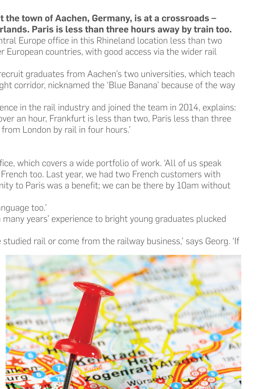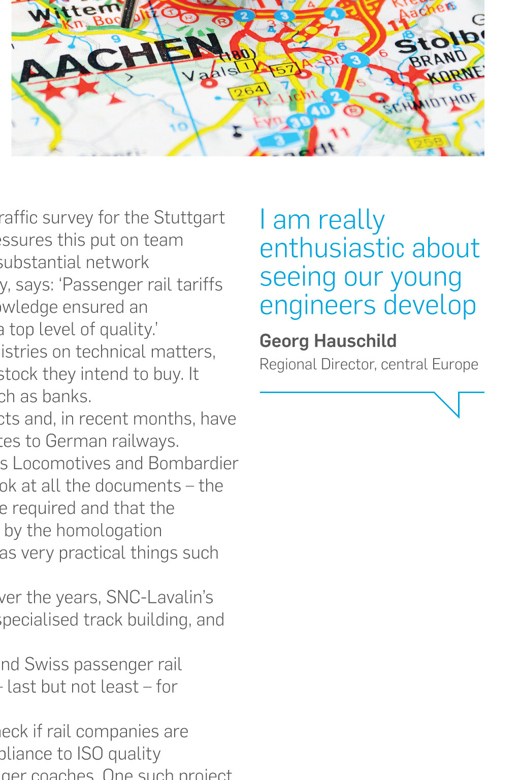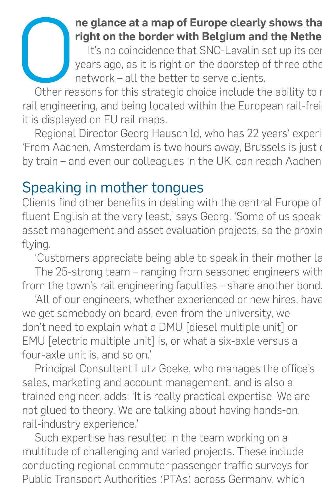 Centre of attention SNC-Lavalin’s Rail & Transit central European team is based in Germany, but it covers a much wider geographical area with its strong railway engineering skills. Viewpoint finds out why all the team members share a strong passion for working in rail Words ANdREw BENNETT One glance at a map of Europe clearly shows that the town of Aachen, Germany, is at a crossroads – right on the border with Belgium and the Netherlands. Paris is less than three hours away by train too. It’s no coincidence that SNC-Lavalin set up its central Europe office in this Rhineland location less than two years ago, as it is right on the doorstep of three other European countries, with good access via the wider rail network – all the better to serve clients. Other reasons for this strategic choice include the ability to recruit graduates from Aachen’s two universities, which teach rail engineering, and being located within the European rail-freight corridor, nicknamed the ‘Blue Banana’ because of the way it is displayed on EU rail maps. Regional director Georg Hauschild, who has 22 years‘ experience in the rail industry and joined the team in 2014, explains: ‘From Aachen, Amsterdam is two hours away, Brussels is just over an hour, Frankfurt is less than two, Paris less than three by train – and even our colleagues in the UK, can reach Aachen from London by rail in four hours.’ Speaking in mother tongues Clients find other benefits in dealing with the central Europe office, which covers a wide portfolio of work. ‘All of us speak fluent English at the very least,’ says Georg. ‘Some of us speak French too. Last year, we had two French customers with asset management and asset evaluation projects, so the proximity to Paris was a benefit; we can be there by 10am without flying. ‘Customers appreciate being able to speak in their mother language too.’ The 25-strong team – ranging from seasoned engineers with many years’ experience to bright young graduates plucked from the town’s rail engineering faculties – share another bond. ‘All of our engineers, whether experienced or new hires, have studied rail or come from the railway business,’ says Georg. ‘If we get somebody on board, even from the university, we don’t need to explain what a dMU [diesel multiple unit] or EMU [electric multiple unit] is, or what a six-axle versus a four-axle unit is, and so on.’ Principal Consultant Lutz Goeke, who manages the office’s sales, marketing and account management, and is also a trained engineer, adds: ‘It is really practical expertise. we are not glued to theory. we are talking about having hands-on, rail-industry experience.’ Such expertise has resulted in the team working on a multitude of challenging and varied projects. These include conducting regional commuter passenger traffic surveys for Public Transport Authorities (PTAs) across Germany, which have accounted for around half of the team’s workload recently. Across the various German federal states – known as Bundesländer – income from passenger fares does not cover the full costs of regional rail services, so the PTAs look for up-to-date figures on income flows to make decisions about where taxpayers’ money should be allocated. Adding to the pressures Last year, Baden-württemberg required a regional passenger traffic survey for the Stuttgart region, with an immediate start date. despite the additional pressures this put on team members, SNC-Lavalin was able to deliver the project for this substantial network successfully. Alexander Kirfel, Team Leader, Transport Advisory, says: ‘Passenger rail tariffs in Germany are still somewhat complicated, but our expert knowledge ensured an instantaneous solution to gather the requested information at a top level of quality.’ The Aachen-based team also advises German PTAs and ministries on technical matters, such as reviewing the specifications for new passenger rolling stock they intend to buy. It performs a similar service for rolling stock asset managers, such as banks. The engineers also prove their worth on homologation projects and, in recent months, have helped introduce two vehicles that originated in the United States to German railways. Lutz, who worked in senior commercial roles for Alpha Trains Locomotives and Bombardier Transportation before joining SNC-Lavalin in 2014, says: ‘we look at all the documents – the implementations – and confirm the technical standards that are required and that the documentation reflects the actual design, and can be accepted by the homologation authority. This includes the co-ordination of assessors, as well as very practical things such as test rides.’ Germany has a substantial number of tram operators and, over the years, SNC-Lavalin’s expertise has contributed substantially to the design of highly specialised track building, and to the maintenance of way vehicles. Other client work has included consultancy for the Belgian and Swiss passenger rail operators, for a Poland-based rolling stock manufacturer, and – last but not least – for German railway company, deutsche Bahn. SNC-Lavalin also provides a workshop-auditing service to check if rail companies are following technical, state-of-the art processes – including compliance to ISO quality standards – correctly, and assesses the maintenance of passenger coaches. One such project was described by Lutz as: ‘Very interesting, complex and technical.’ whatever the projects and their particular demands, however, there is one thing, above all else, that gives Georg – whose previous roles have included being on the infrastructure (fastening systems) and vehicle (diesel locomotives) sides at Vossloh and Alpha Trains – enormous satisfaction. ‘I am really enthusiastic about seeing our young engineers develop,’ he says. ‘These people are transferring lessons learned and professional skills, and adapting methods from our senior engineer