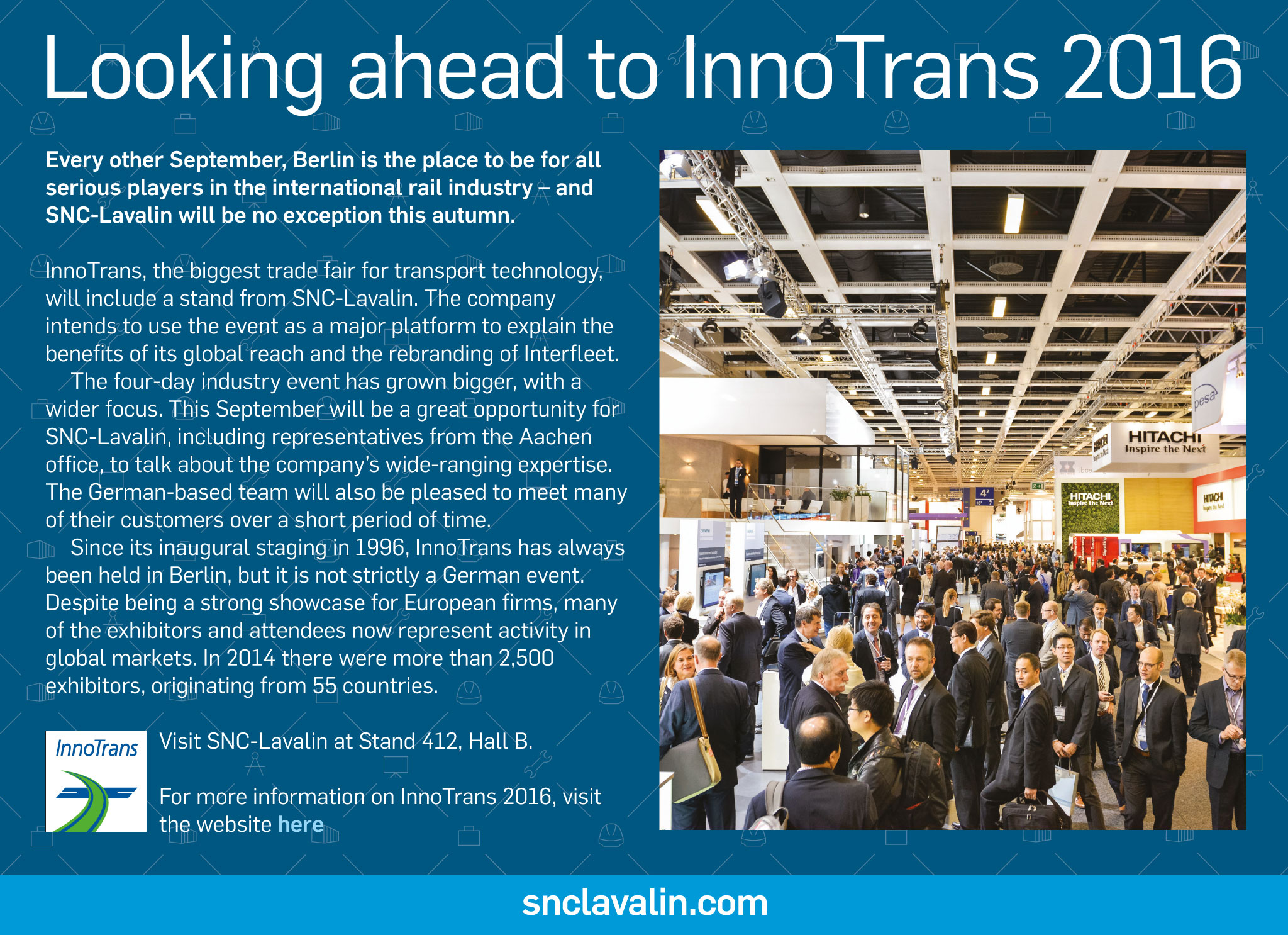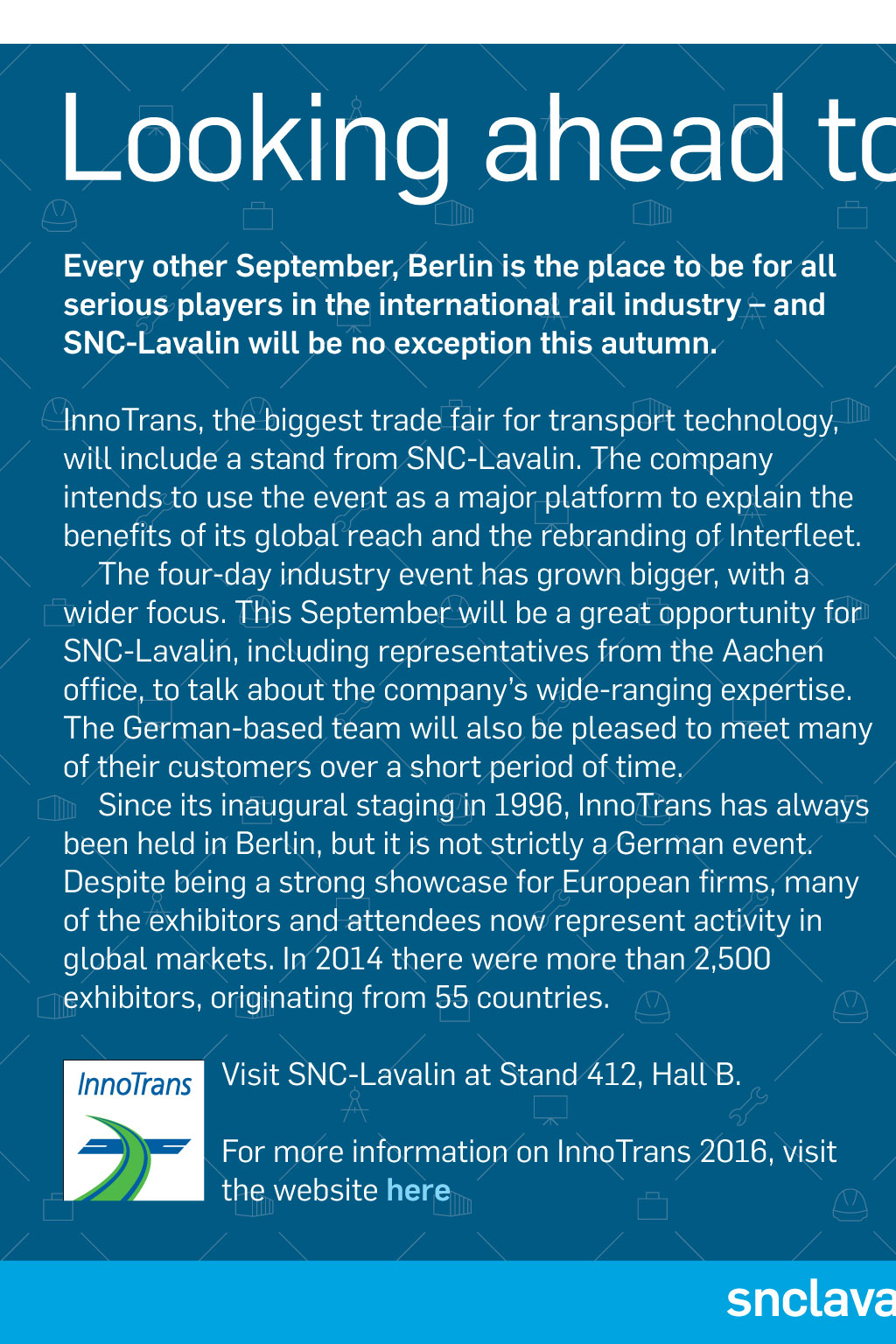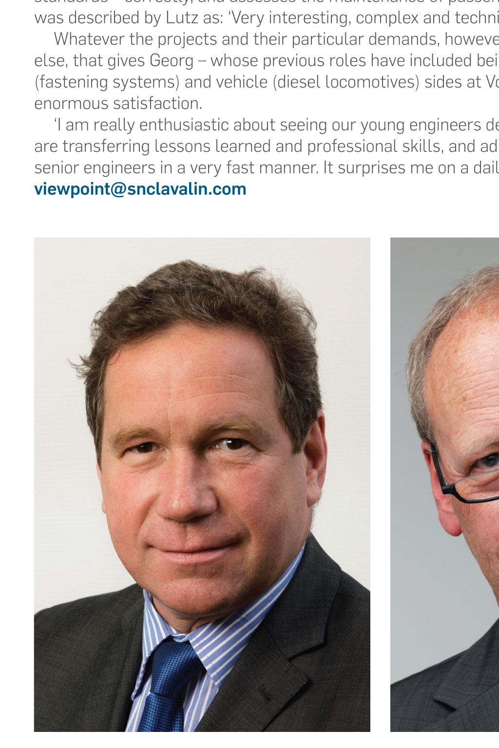 Centre of attention SNC-Lavalin’s Rail & Transit central European team is based in Germany, but it covers a much wider geographical area with its strong railway engineering skills. Viewpoint finds out why all the team members share a strong passion for working in rail Words ANdREw BENNETT One glance at a map of Europe clearly shows that the town of Aachen, Germany, is at a crossroads – right on the border with Belgium and the Netherlands. Paris is less than three hours away by train too. It’s no coincidence that SNC-Lavalin set up its central Europe office in this Rhineland location less than two years ago, as it is right on the doorstep of three other European countries, with good access via the wider rail network – all the better to serve clients. Other reasons for this strategic choice include the ability to recruit graduates from Aachen’s two universities, which teach rail engineering, and being located within the European rail-freight corridor, nicknamed the ‘Blue Banana’ because of the way it is displayed on EU rail maps. Regional director Georg Hauschild, who has 22 years‘ experience in the rail industry and joined the team in 2014, explains: ‘From Aachen, Amsterdam is two hours away, Brussels is just over an hour, Frankfurt is less than two, Paris less than three by train – and even our colleagues in the UK, can reach Aachen from London by rail in four hours.’ Speaking in mother tongues Clients find other benefits in dealing with the central Europe office, which covers a wide portfolio of work. ‘All of us speak fluent English at the very least,’ says Georg. ‘Some of us speak French too. Last year, we had two French customers with asset management and asset evaluation projects, so the proximity to Paris was a benefit; we can be there by 10am without flying. ‘Customers appreciate being able to speak in their mother language too.’ The 25-strong team – ranging from seasoned engineers with many years’ experience to bright young graduates plucked from the town’s rail engineering faculties – share another bond. ‘All of our engineers, whether experienced or new hires, have studied rail or come from the railway business,’ says Georg. ‘If we get somebody on board, even from the university, we don’t need to explain what a dMU [diesel multiple unit] or EMU [electric multiple unit] is, or what a six-axle versus a four-axle unit is, and so on.’ Principal Consultant Lutz Goeke, who manages the office’s sales, marketing and account management, and is also a trained engineer, adds: ‘It is really practical expertise. we are not glued to theory. we are talking about having hands-on, rail-industry experience.’ Such expertise has resulted in the team working on a multitude of challenging and varied projects. These include conducting regional commuter passenger traffic surveys for Public Transport Authorities (PTAs) across Germany, which have accounted for around half of the team’s workload recently. Across the various German federal states – known as Bundesländer – income from passenger fares does not cover the full costs of regional rail services, so the PTAs look for up-to-date figures on income flows to make decisions about where taxpayers’ money should be allocated. Adding to the pressures Last year, Baden-württemberg required a regional passenger traffic survey for the Stuttgart region, with an immediate start date. despite the additional pressures this put on team members, SNC-Lavalin was able to deliver the project for this substantial network successfully. Alexander Kirfel, Team Leader, Transport Advisory, says: ‘Passenger rail tariffs in Germany are still somewhat complicated, but our expert knowledge ensured an instantaneous solution to gather the requested information at a top level of quality.’ The Aachen-based team also advises German PTAs and ministries on technical matters, such as reviewing the specifications for new passenger rolling stock they intend to buy. It performs a similar service for rolling stock asset managers, such as banks. The engineers also prove their worth on homologation projects and, in recent months, have helped introduce two vehicles that originated in the United States to German railways. Lutz, who worked in senior commercial roles for Alpha Trains Locomotives and Bombardier Transportation before joining SNC-Lavalin in 2014, says: ‘we look at all the documents – the implementations – and confirm the technical standards that are required and that the documentation reflects the actual design, and can be accepted by the homologation authority. This includes the co-ordination of assessors, as well as very practical things such as test rides.’ Germany has a substantial number of tram operators and, over the years, SNC-Lavalin’s expertise has contributed substantially to the design of highly specialised track building, and to the maintenance of way vehicles. Other client work has included consultancy for the Belgian and Swiss passenger rail operators, for a Poland-based rolling stock manufacturer, and – last but not least – for German railway company, deutsche Bahn. SNC-Lavalin also provides a workshop-auditing service to check if rail companies are following technical, state-of-the art processes – including compliance to ISO quality standards – correctly, and assesses the maintenance of passenger coaches. One such project was described by Lutz as: ‘Very interesting, complex and technical.’ whatever the projects and their particular demands, however, there is one thing, above all else, that gives Georg – whose previous roles have included being on the infrastructure (fastening systems) and vehicle (diesel locomotives) sides at Vossloh and Alpha Trains – enormous satisfaction. ‘I am really enthusiastic about seeing our young engineers develop,’ he says. ‘These people are transferring lessons learned and professional skills, and adapting methods from our senior engineer