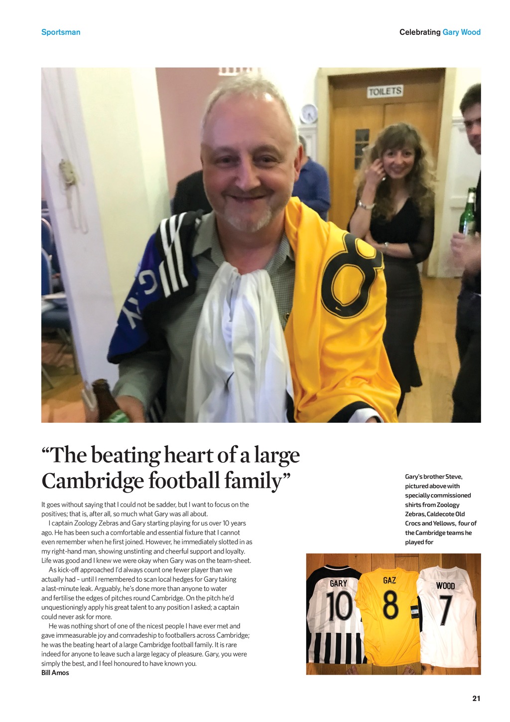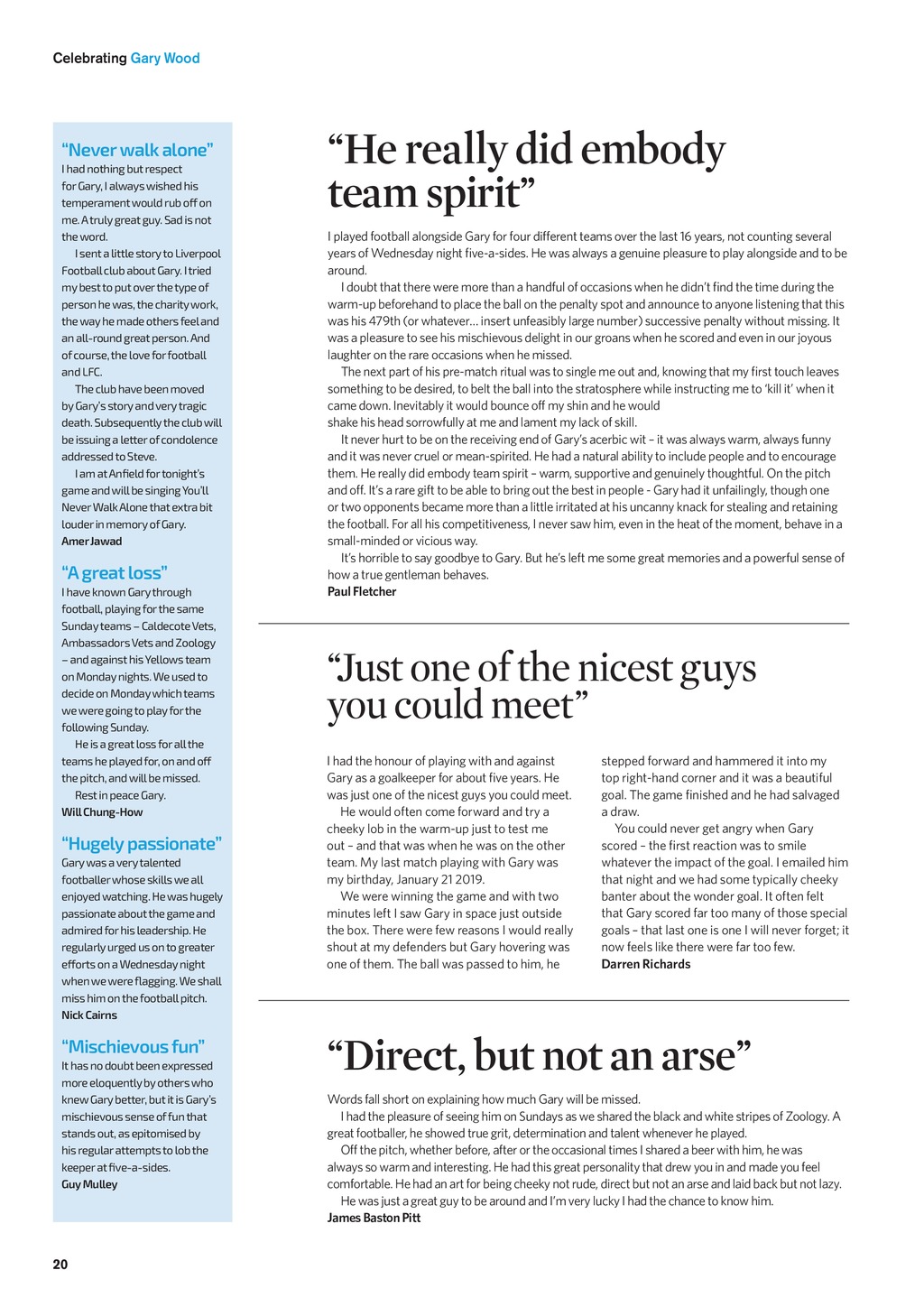 Celebrating Gary Wood Never walk alone I had nothing but respect for Gary, I always wished his temperament would rub off on me. A truly great guy. Sad is not the word. I sent a little story to Liverpool Football club about Gary. I tried my best to put over the type of person he was, the charity work, the way he made others feel and an all-round great person. And of course, the love for football and LFC. The club have been moved by Garys story and very tragic death. Subsequently the club will be issuing a letter of condolence addressed to Steve. I am at Anfield for tonights game and will be singing Youll Never Walk Alone that extra bit louder in memory of Gary. Amer Jawad A great loss I have known Gary through football, playing for the same Sunday teams Caldecote Vets, Ambassadors Vets and Zoology and against his Yellows team on Monday nights. We used to decide on Monday which teams we were going to play for the following Sunday. He is a great loss for all the teams he played for, on and off the pitch, and will be missed. Rest in peace Gary. Will Chung-How Hugely passionate Gary was a very talented footballer whose skills we all enjoyed watching. He was hugely passionate about the game and admired for his leadership. He regularly urged us on to greater efforts on a Wednesday night when we were flagging. We shall miss him on the football pitch. Nick Cairns Mischievous fun It has no doubt been expressed more eloquently by others who knew Gary better, but it is Garys mischievous sense of fun that stands out, as epitomised by his regular attempts to lob the keeper at five-a-sides. Guy Mulley He really did embody team spirit I played football alongside Gary for four different teams over the last 16 years, not counting several years of Wednesday night five-a-sides. He was always a genuine pleasure to play alongside and to be around. I doubt that there were more than a handful of occasions when he didnt find the time during the warm-up beforehand to place the ball on the penalty spot and announce to anyone listening that this was his 479th (or whatever insert unfeasibly large number) successive penalty without missing. It was a pleasure to see his mischievous delight in our groans when he scored and even in our joyous laughter on the rare occasions when he missed. The next part of his pre-match ritual was to single me out and, knowing that my first touch leaves something to be desired, to belt the ball into the stratosphere while instructing me to kill it when it came down. Inevitably it would bounce off my shin and he would shake his head sorrowfully at me and lament my lack of skill. It never hurt to be on the receiving end of Garys acerbic wit it was always warm, always funny and it was never cruel or mean-spirited. He had a natural ability to include people and to encourage them. He really did embody team spirit warm, supportive and genuinely thoughtful. On the pitch and off. Its a rare gift to be able to bring out the best in people - Gary had it unfailingly, though one or two opponents became more than a little irritated at his uncanny knack for stealing and retaining the football. For all his competitiveness, I never saw him, even in the heat of the moment, behave in a small-minded or vicious way. Its horrible to say goodbye to Gary. But hes left me some great memories and a powerful sense of how a true gentleman behaves. Paul Fletcher Just one of the nicest guys you could meet I had the honour of playing with and against Gary as a goalkeeper for about five years. He was just one of the nicest guys you could meet. He would often come forward and try a cheeky lob in the warm-up just to test me out and that was when he was on the other team. My last match playing with Gary was my birthday, January 21 2019. We were winning the game and with two minutes left I saw Gary in space just outside the box. There were few reasons I would really shout at my defenders but Gary hovering was one of them. The ball was passed to him, he stepped forward and hammered it into my top right-hand corner and it was a beautiful goal. The game finished and he had salvaged a draw. You could never get angry when Gary scored the first reaction was to smile whatever the impact of the goal. I emailed him that night and we had some typically cheeky banter about the wonder goal. It often felt that Gary scored far too many of those special goals that last one is one I will never forget; it now feels like there were far too few. Darren Richards Direct, but not an arse Words fall short on explaining how much Gary will be missed. I had the pleasure of seeing him on Sundays as we shared the black and white stripes of Zoology. A great footballer, he showed true grit, determination and talent whenever he played. Off the pitch, whether before, after or the occasional times I shared a beer with him, he was always so warm and interesting. He had this great personality that drew you in and made you feel comfortable. He had an art for being cheeky not rude, direct but not an arse and laid back but not lazy. He was just a great guy to be around and Im very lucky I had the chance to know him. James Baston Pitt 20 Celebrating_Gary Wood.indd 20 01/04/2019 15:54