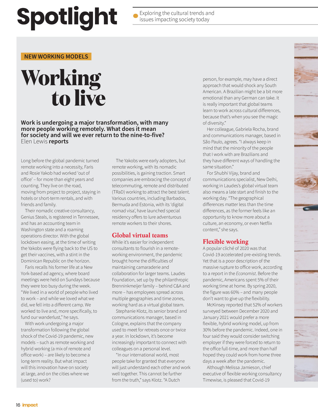 Spotlight Exploring the cultural trends and issues impacting society today NEW WORKING MODELS Working to live person, for example, may have a direct approach that would shock any South American. A Brazilian might be a bit more emotional than any German can take. It is really important that global teams Work is undergoing a major transformation, with many more people working remotely. What does it mean for society and will we ever return to the nine-to-five? Elen Lewis reports Long before the global pandemic turned remote working into a necessity, Faris and Rosie Yakob had worked out of counting. They live on the road, moving from project to project, staying in friends and family. Their nomadic creative consultancy, Genius Steals, is registered in Tennessee, and has an accounting team in Washington state and a roaming operations director. With the global lockdown easing, at the time of writing The Yakobs were early adopters, but remote working, with its nomadic possibilities, is gaining traction. Smart companies are embracing the concept of telecommuting, remote and distributed (TRaD) working to attract the best talent. Various countries, including Barbados, Bermuda and Estonia, with its digital nomad visa, have launched special because thats when you see the magic of diversity. Her colleague, Gabriela Rocha, brand and communications manager, based in So Paulo, agrees. I always keep in mind that the minority of the people that I work with are Brazilians and same situation. For Shubhi Vijay, brand and communications specialist, New Delhi, working in Laudess global virtual team working day. The geographical opportunity to know more about a remote workers to their shores. Global virtual teams While its easier for independent content, she says. Flexible working A popular clich of 2020 was that get their vaccines, with a stint in the Dominican Republic on the horizon. Faris recalls his former life at a New meetings were held on Sundays because they were too busy during the week. We lived in a world of people who lived to work and while we loved what we fund our wanderlust, he says. With work undergoing a major transformation following the global models such as remote working and hybrid working (a mix of remote and will this innovation have on society at large, and on the cities where we (used to) work? working environment, the pandemic Yet that is a poor description of the maintaining camaraderie and collaboration for larger teams. Laudes Foundation, set up by the philanthropic Brenninkmeijer family behind C&A and more has employees spread across multiple geographies and time zones, working hard as a virtual global team. Stephanie Klotz, its senior brand and communications manager, based in Cologne, explains that the company used to meet for retreats once or twice a year. In lockdown, its become increasingly important to connect with colleagues on a personal level. In our international world, most people take for granted that everyone will just understand each other and work well together. This cannot be further from the truth, says Klotz. A Dutch to a report in the Economist. Before the pandemic, Americans spent 5% of their working time at home. By spring 2020, McKinsey reported that 52% of workers surveyed between December 2020 and 30% before the pandemic. Indeed, one in four said they would consider switching employer if they were forced to return to hoped they could work from home three Although Melissa Jamieson, chief 16 Impact ISSUE 34 2021_pp16-19_Spot .indd 16 18/06/2021 13:05
