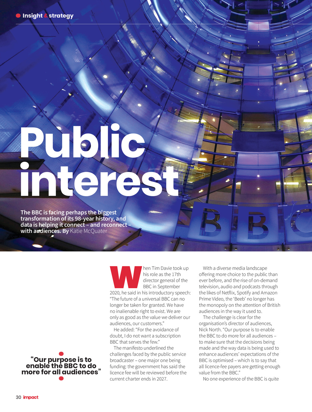 Insight & strategy Public interest The BBC is facing perhaps the biggest transformation of its 98-year history, and data is helping it connect and reconnect with audiences. By Katie McQuater W Our purpose is to enable the BBC to do more for all audiences hen Tim Davie took up his role as the 17th director general of the BBC in September 2020, he said in his introductory speech: The future of a universal BBC can no longer be taken for granted. We have no inalienable right to exist. We are only as good as the value we deliver our audiences, our customers. He added: For the avoidance of doubt, I do not want a subscription BBC that serves the few. The manifesto underlined the challenges faced by the public service broadcaster one major one being funding: the government has said the licence fee will be reviewed before the current charter ends in 2027. With a diverse media landscape ever before, and the rise of on-demand television, audio and podcasts through Prime Video, the Beeb no longer has the monopoly on the attention of British audiences in the way it used to. The challenge is clear for the organisations director of audiences, Nick North. Our purpose is to enable the BBC to do more for all audiences to make sure that the decisions being made and the way data is being used to enhance audiences expectations of the BBC is optimised which is to say that all licence-fee payers are getting enough value from the BBC. No one experience of the BBC is quite 30 Impact ISSUE 34 2021_pp30-33 I&S Beeb.indd 30 18/06/2021 13:45
