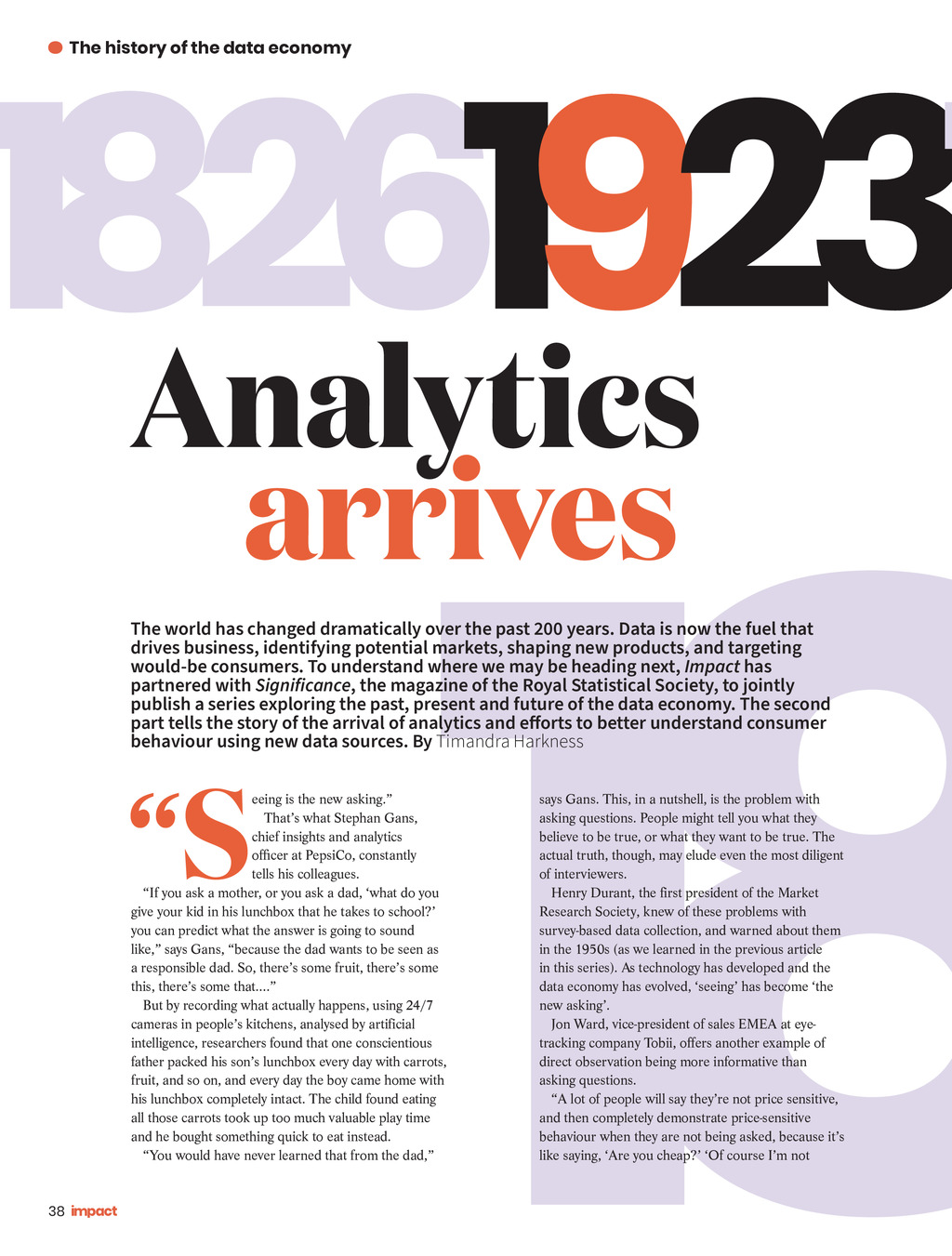 1826 1923 1 Analytics The history of the data economy 18 arrives The world has changed dramatically over the past 200 years. Data is now the fuel that drives business, identifying potential markets, shaping new products, and targeting would-be consumers. To understand where we may be heading next, Impact has partnered with Significance, the magazine of the Royal Statistical Society, to jointly publish a series exploring the past, present and future of the data economy. The second part tells the story of the arrival of analytics and efforts to better understand consumer behaviour using new data sources. By Timandra Harkness S eeing is the new asking. Thats what Stephan Gans, chief insights and analytics officer at PepsiCo, constantly tells his colleagues. If you ask a mother, or you ask a dad, what do you give your kid in his lunchbox that he takes to school? you can predict what the answer is going to sound like, says Gans, because the dad wants to be seen as a responsible dad. So, theres some fruit, theres some this, theres some that. But by recording what actually happens, using 24/7 cameras in peoples kitchens, analysed by artificial intelligence, researchers found that one conscientious father packed his sons lunchbox every day with carrots, fruit, and so on, and every day the boy came home with his lunchbox completely intact. The child found eating all those carrots took up too much valuable play time and he bought something quick to eat instead. You would have never learned that from the dad, 38 Impact ISSUE 34 2021_pp38-41_DataEconomy.indd 38 says Gans. This, in a nutshell, is the problem with asking questions. People might tell you what they believe to be true, or what they want to be true. The actual truth, though, may elude even the most diligent of interviewers. Henry Durant, the first president of the Market Research Society, knew of these problems with survey-based data collection, and warned about them in the 1950s (as we learned in the previous article in this series). As technology has developed and the data economy has evolved, seeing has become the new asking. Jon Ward, vice-president of sales EMEA at eyetracking company Tobii, offers another example of direct observation being more informative than asking questions. A lot of people will say theyre not price sensitive, and then completely demonstrate price-sensitive behaviour when they are not being asked, because its like saying, Are you cheap? Of course Im not 22/06/2021 16:08