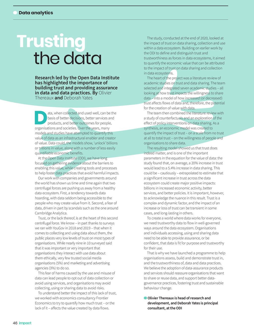 Data analytics Trusting the data Research led by the Open Data Institute has highlighted the importance of building trust and providing assurance in data and data practices. By Olivier Thereaux and Deborah Yates D ata, when collected and used well, can be the basis of better decisions, better services and products, and better outcomes for people, organisations and societies. Over the years, many models and studies have attempted to quantify this value of data as an infrastructural enabler and creator of value. Data could, the models show, unlock billions or trillions in value, along with a number of less easily At the Open Data Institute (ODI), we have long focused on gathering evidence about the barriers to enabling this value, while creating tools and processes to help foster data practices that avoid harmful impacts. Our work with companies and governments around the world has shown us time and time again that two centrifugal forces are pushing us away from a healthy data ecosystem. First, a tendency towards data hoarding, with data seldom being accessible to the people who may create value from it. Second, a fear of data, driven in part by scandals such as the one around Cambridge Analytica. Trust, or the lack thereof, is at the heart of this second centrifugal force. We know in part thanks to surveys we ran with YouGov in 2018 and 2019 that when it comes to collecting and using data about them, the public places very low levels of trust on most types of organisations. While nearly nine in 10 surveyed said that it was important or very important that organisations they interact with use data about them ethically, very few trusted social media organisations (5%) and marketing and advertising agencies (3%) to do so. This fear of harms caused by the use and misuse of data can lead people to opt out of data collection or avoid using services, and organisations may avoid collecting, using or sharing data to avoid risks. To understand better the impact of this lack of trust, we worked with economics consultancy Frontier Economics to try to quantify how much trust or the The study, conducted at the end of 2020, looked at the impact of trust on data sharing, collection and use within a data ecosystem. Building on earlier work by trustworthiness as forces in data ecosystems, it aimed to quantify the economic value that can be attributed to the impact of trust on data sharing and collection in data ecosystems. The heart of the project was a literature review of academic studies on trust and data sharing. The team selected and integrated seven academic studies all looking at how trust impacts the willingness to share data into a model of how increased (or decreased) for the creation of value with data. The team then combined the literature review with a study of counterfactuals and an exploration of the synthesis, an economic model was created to quantify the impact of trust on a scale from no trust at all to total trust on the willingness of people and organisations to share data. The resulting model showed us that trust does indeed matter, and is one of the important parameters in the equation for the value of data: the study found that, on average, a 20% increase in trust would lead to a 5.4% increase in data sharing. This could be cautiously extrapolated to estimate that ecosystem could create major positive impacts: billions in increased economic activity, better services, and better policies. It is important, however, to acknowledge the nuance in this result. Trust is a complex and dynamic factor, and the impact of an increase or loss of trust can be transient in some cases, and long-lasting in others. To create a world where data works for everyone, ways around the data ecosystem. Organisations and individuals accessing, using and sharing data need to be able to provide assurance, or be for their use. That is why we have launched a programme to help organisations assess, build and demonstrate trust in, and the trustworthiness of, data and data practices. We believe the adoption of data-assurance products and services should reassure organisations that want to share or reuse data, and support better datagovernance practices, fostering trust and sustainable behaviour change. Olivier Thereaux is head of research and development, and Deborah Yates is principal consultant, at the ODI 46 Impact ISSUE 34 2021_pp46 Data.indd 46 18/06/2021 13:59
