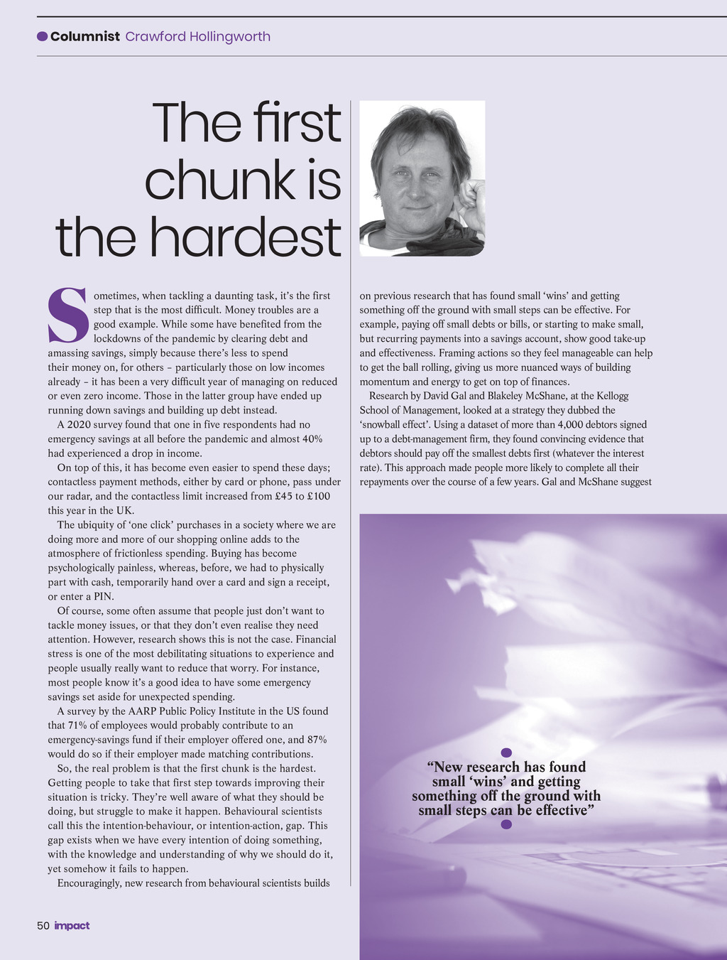 Columnist Crawford Hollingworth S ometimes, when tackling a daunting task, its the first doing more and more of our shopping online adds to the Of course, some often assume that people just dont want to New research has found small wins and getting 50 Impact ISSUE 34 2021_pp50-51_Crawford.indd 50 18/06/2021 14:04