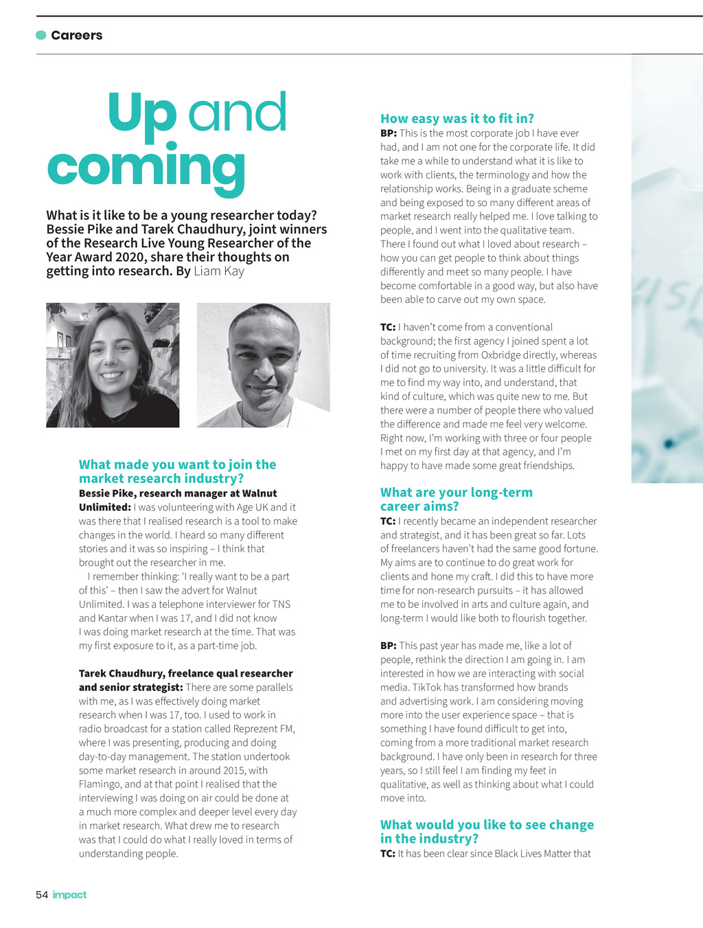 Careers Up and coming What is it like to be a young researcher today? Bessie Pike and Tarek Chaudhury, joint winners of the Research Live Young Researcher of the Year Award 2020, share their thoughts on getting into research. By Liam Kay What made you want to join the market research industry? Bessie Pike, research manager at Walnut Unlimited: I was volunteering with Age UK and it was there that I realised research is a tool to make changes in the world. I heard so many different stories and it was so inspiring I think that brought out the researcher in me. I remember thinking: I really want to be a part of this then I saw the advert for Walnut Unlimited. I was a telephone interviewer for TNS and Kantar when I was 17, and I did not know I was doing market research at the time. That was my first exposure to it, as a part-time job. Tarek Chaudhury, freelance qual researcher and senior strategist: There are some parallels with me, as I was effectively doing market research when I was 17, too. I used to work in radio broadcast for a station called Reprezent FM, where I was presenting, producing and doing day-to-day management. The station undertook some market research in around 2015, with Flamingo, and at that point I realised that the interviewing I was doing on air could be done at a much more complex and deeper level every day in market research. What drew me to research was that I could do what I really loved in terms of understanding people. How easy was it to fit in? BP: This is the most corporate job I have ever had, and I am not one for the corporate life. It did take me a while to understand what it is like to work with clients, the terminology and how the relationship works. Being in a graduate scheme and being exposed to so many different areas of market research really helped me. I love talking to people, and I went into the qualitative team. There I found out what I loved about research how you can get people to think about things differently and meet so many people. I have become comfortable in a good way, but also have been able to carve out my own space. TC: I havent come from a conventional background; the first agency I joined spent a lot of time recruiting from Oxbridge directly, whereas I did not go to university. It was a little difficult for me to find my way into, and understand, that kind of culture, which was quite new to me. But there were a number of people there who valued the difference and made me feel very welcome. Right now, Im working with three or four people I met on my first day at that agency, and Im happy to have made some great friendships. What are your long-term career aims? TC: I recently became an independent researcher and strategist, and it has been great so far. Lots of freelancers havent had the same good fortune. My aims are to continue to do great work for clients and hone my craft. I did this to have more time for non-research pursuits it has allowed me to be involved in arts and culture again, and long-term I would like both to flourish together. BP: This past year has made me, like a lot of people, rethink the direction I am going in. I am interested in how we are interacting with social media. TikTok has transformed how brands and advertising work. I am considering moving more into the user experience space that is something I have found difficult to get into, coming from a more traditional market research background. I have only been in research for three years, so I still feel I am finding my feet in qualitative, as well as thinking about what I could move into. What would you like to see change in the industry? TC: It has been clear since Black Lives Matter that 54 Impact ISSUE 34 2021_pp54-55_Careers.indd 54 18/06/2021 14:11