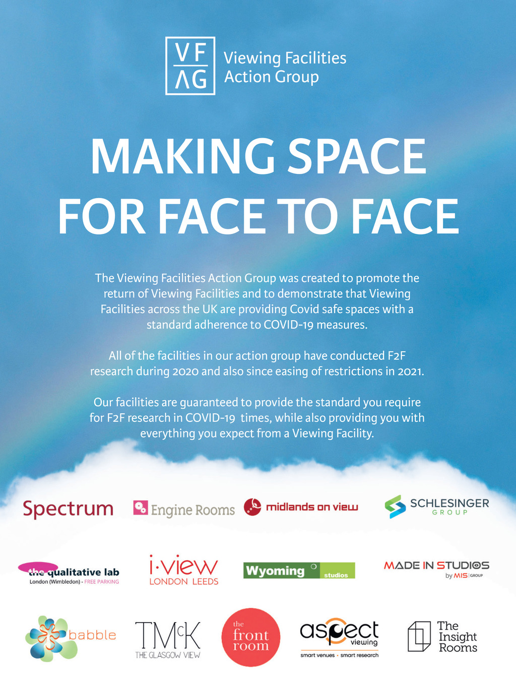 MAKING SPACE FOR FACE TO FACE The Viewing Facilities Action Group was created to promote the return of Viewing Facilities and to demonstrate that Viewing Facilities across the UK are providing Covid safe spaces with a standard adherence to COVID-19 measures. All of the facilities in our action group have conducted F2F research during 2020 and also since easing of restrictions in 2021. Our facilities are guaranteed to provide the standard you require for F2F research in COVID-19 times, while also providing you with everything you expect from a Viewing Facility. Impact ISSUE 34 2021_pp58-61_MRS.indd 58 18/06/2021 14:16