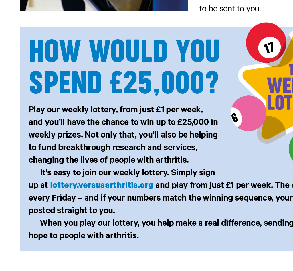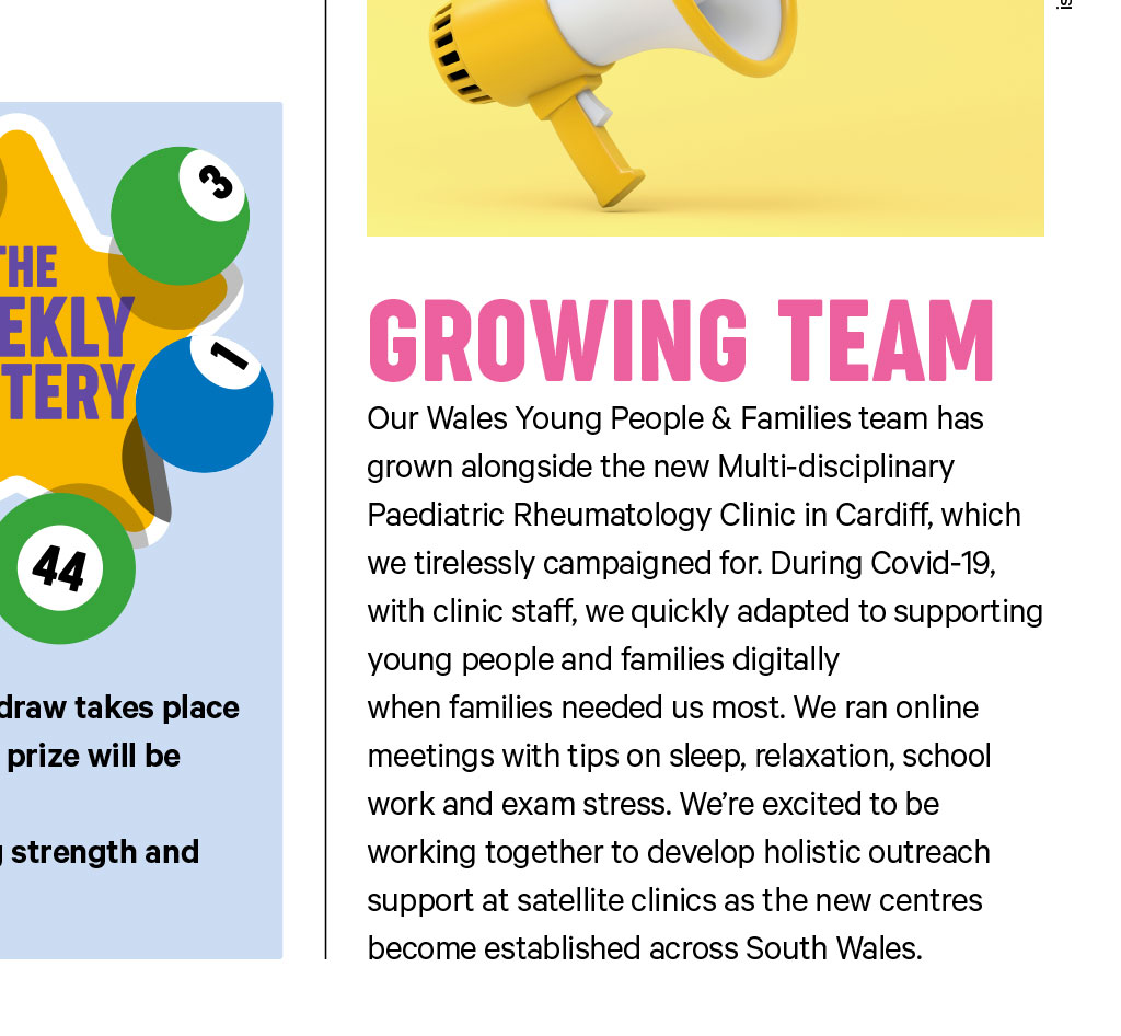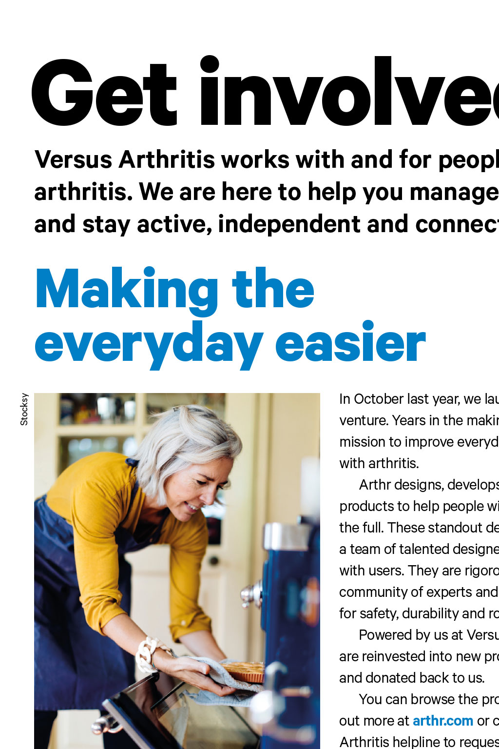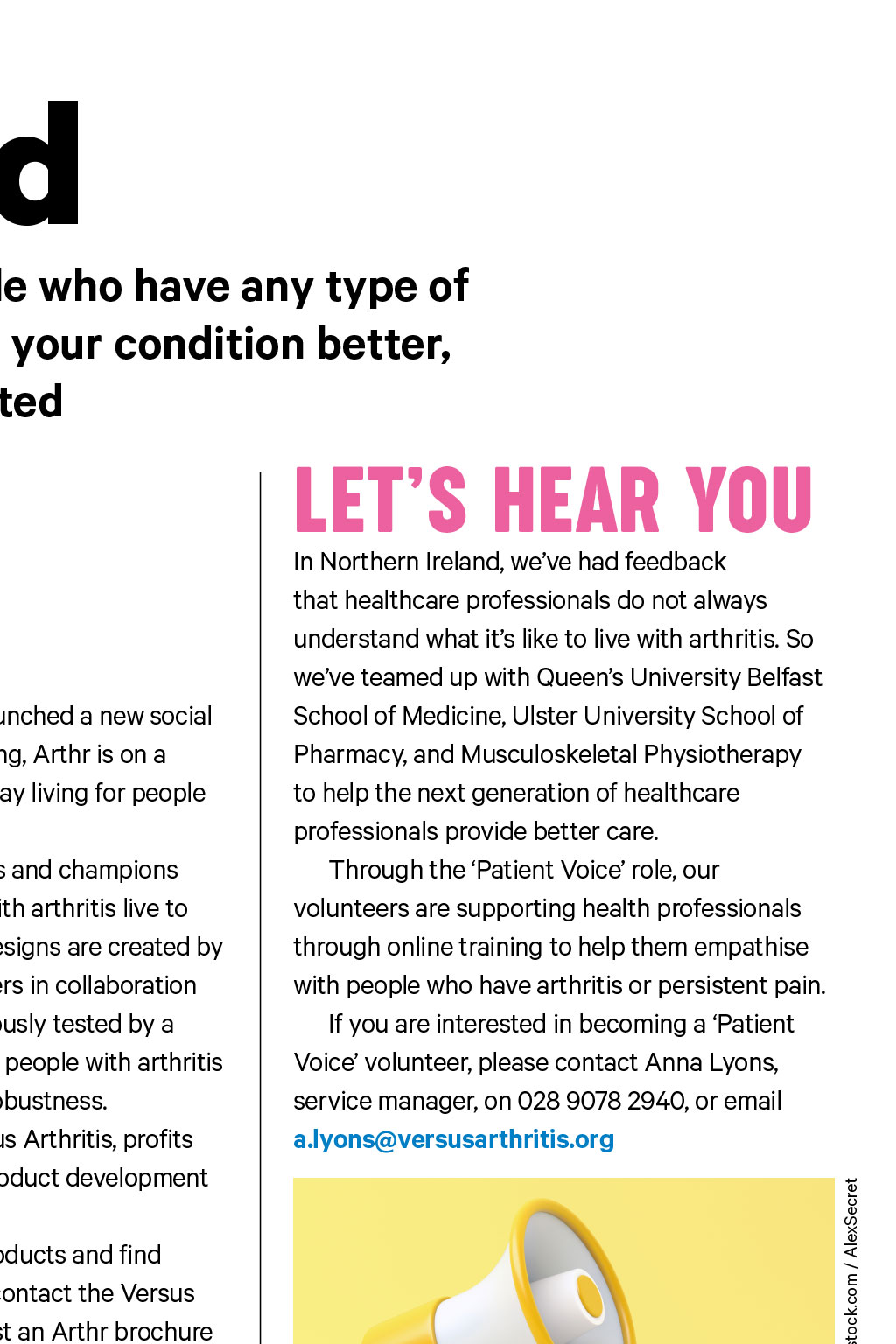 Get involved Versus Arthritis works with and for people who have any type of arthritis. We are here to help you manage your condition better, and stay active, independent and connected In October last year, we launched a new social venture. Years in the making, Arthr is on a mission to improve everyday living for people with arthritis. Arthr designs, develops and champions products to help people with arthritis live to the full. These standout designs are created by a team of talented designers in collaboration with users. They are rigorously tested by a community of experts and people with arthritis for safety, durability and robustness. Powered by us at Versus Arthritis, profits are reinvested into new product development and donated back to us. You can browse the products and find out more at arthr.com or contact the Versus Arthritis helpline to request an Arthr brochure to be sent to you. How would you spend 25,000? Play our weekly lottery, from just 1 per week, and youll have the chance to win up to 25,000 in weekly prizes. Not only that, youll also be helping to fund breakthrough research and services, changing the lives of people with arthritis. Its easy to join our weekly lottery. Simply sign up at lottery.versusarthritis.org and play from just 1 per week. The draw takes place every Friday and if your numbers match the winning sequence, your prize will be posted straight to you. When you play our lottery, you help make a real difference, sending strength and hope to people with arthritis. In Northern Ireland, weve had feedback that healthcare professionals do not always understand what its like to live with arthritis. So weve teamed up with Queens University Belfast School of Medicine, Ulster University School of Pharmacy, and Musculoskeletal Physiotherapy to help the next generation of healthcare professionals provide better care. Through the Patient Voice role, our volunteers are supporting health professionals through online training to help them empathise with people who have arthritis or persistent pain. If you are interested in becoming a Patient Voice volunteer, please contact Anna Lyons, service manager, on 028 9078 2940, or email a.lyons@versusarthritis.org istock.com / AlexSecret Stocksy Making the everyday easier Lets hear you Growing team Our Wales Young People & Families team has grown alongside the new Multi-disciplinary Paediatric Rheumatology Clinic in Cardiff, which we tirelessly campaigned for. During Covid-19, with clinic staff, we quickly adapted to supporting young people and families digitally when families needed us most. We ran online meetings with tips on sleep, relaxation, school work and exam stress. Were excited to be working together to develop holistic outreach support at satellite clinics as the new centres become established across South Wales.