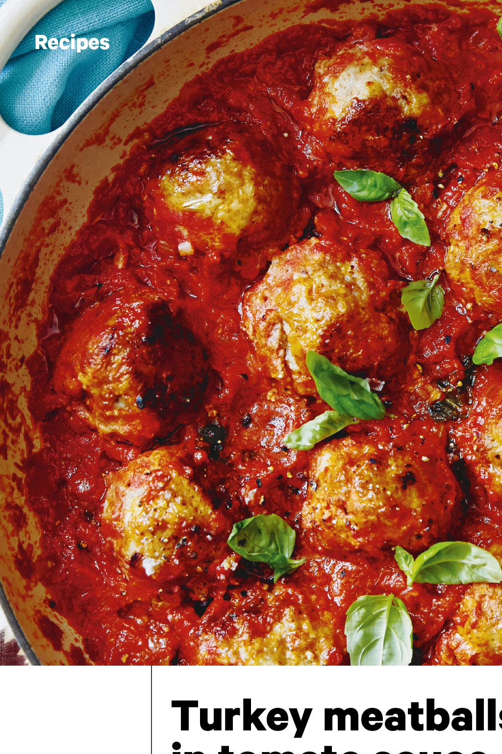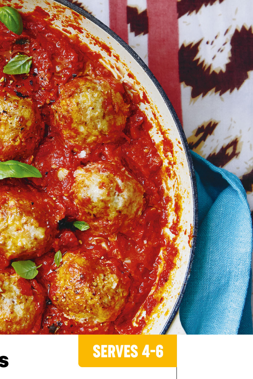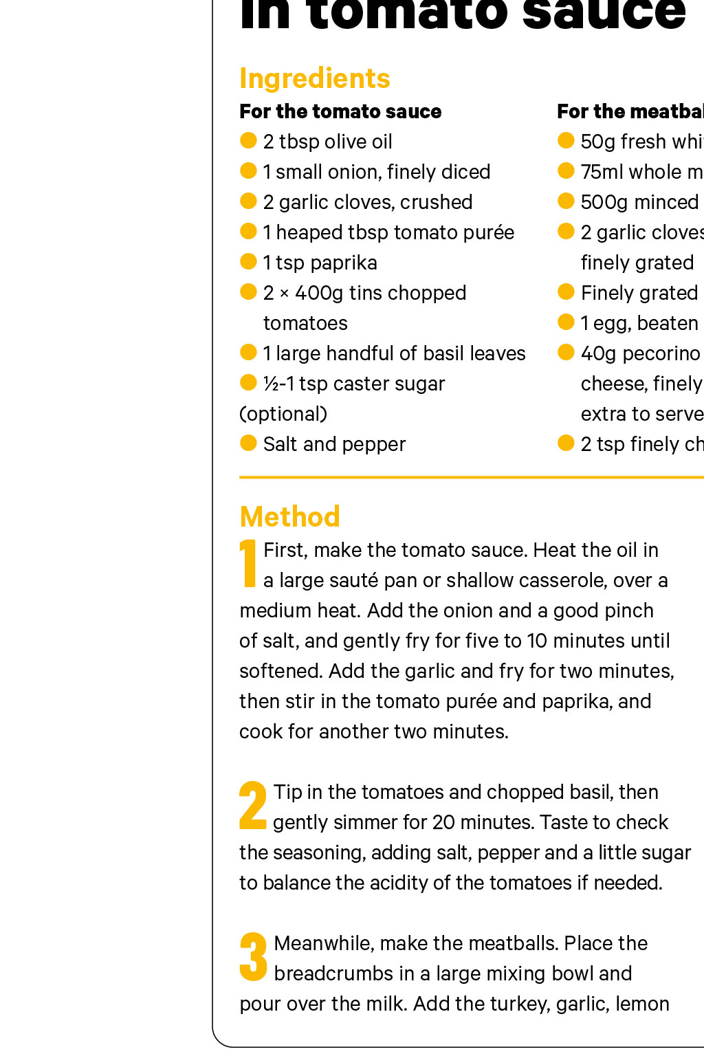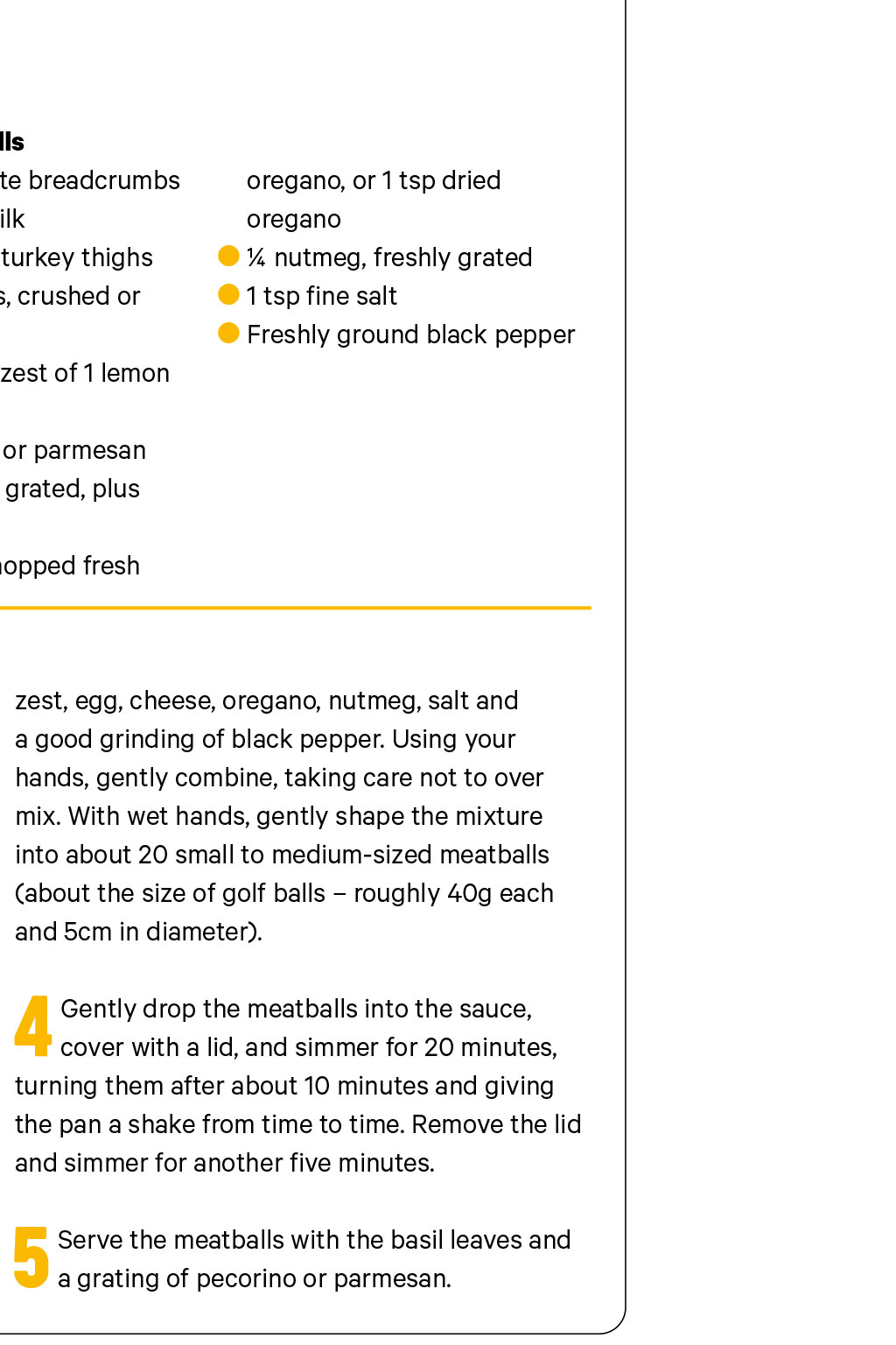 Recipes serves 4-6 Ingredients For the tomato sauce 2 tbsp olive oil 1 small onion, finely diced 2 garlic cloves, crushed 1 heaped tbsp tomato puree 1 tsp paprika 2 400g tins chopped tomatoes 1 large handful of basil leaves -1 tsp caster sugar (optional) Salt and pepper For the meatballs 5 0g fresh white breadcrumbs 7 5ml whole milk 5 00g minced turkey thighs 2 garlic cloves, crushed or finely grated F inely grated zest of 1 lemon 1 egg, beaten 4 0g pecorino or parmesan cheese, finely grated, plus extra to serve 2 tsp finely chopped fresh oregano, or 1 tsp dried oregano nutmeg, freshly grated 1 tsp fine salt Freshly ground black pepper Method First, make the tomato sauce. Heat the oil in a large saute pan or shallow casserole, over a medium heat. Add the onion and a good pinch of salt, and gently fry for five to 10 minutes until softened. Add the garlic and fry for two minutes, then stir in the tomato puree and paprika, and cook for another two minutes. 1 zest, egg, cheese, oregano, nutmeg, salt and a good grinding of black pepper. Using your hands, gently combine, taking care not to over mix. With wet hands, gently shape the mixture into about 20 small to medium-sized meatballs (about the size of golf balls roughly 40g each and 5cm in diameter). 2 4 3 5 Tip in the tomatoes and chopped basil, then gently simmer for 20 minutes. Taste to check the seasoning, adding salt, pepper and a little sugar to balance the acidity of the tomatoes if needed. Meanwhile, make the meatballs. Place the breadcrumbs in a large mixing bowl and pour over the milk. Add the turkey, garlic, lemon Gently drop the meatballs into the sauce, cover with a lid, and simmer for 20 minutes, turning them after about 10 minutes and giving the pan a shake from time to time. Remove the lid and simmer for another five minutes. Serve the meatballs with the basil leaves and a grating of pecorino or parmesan.