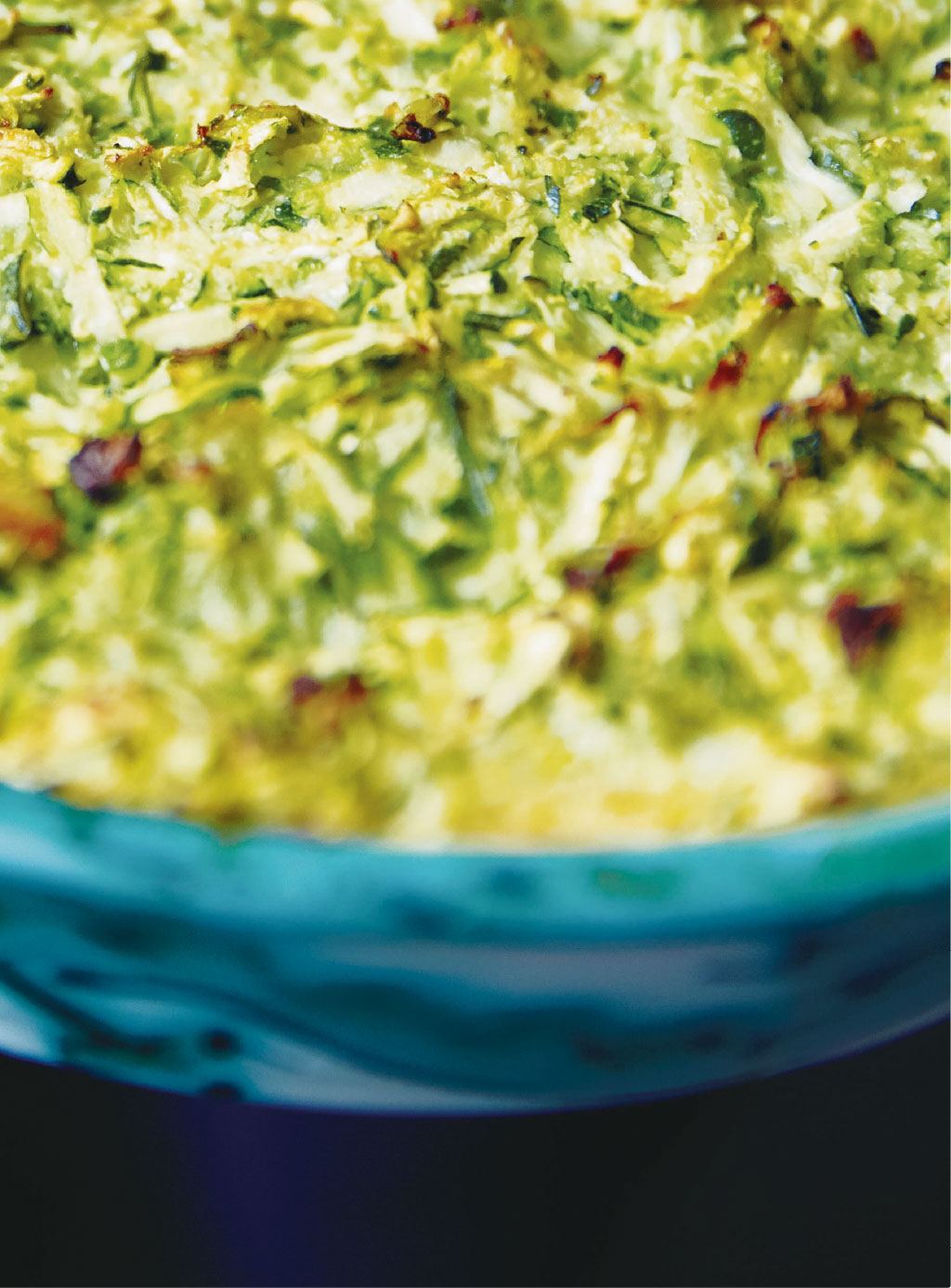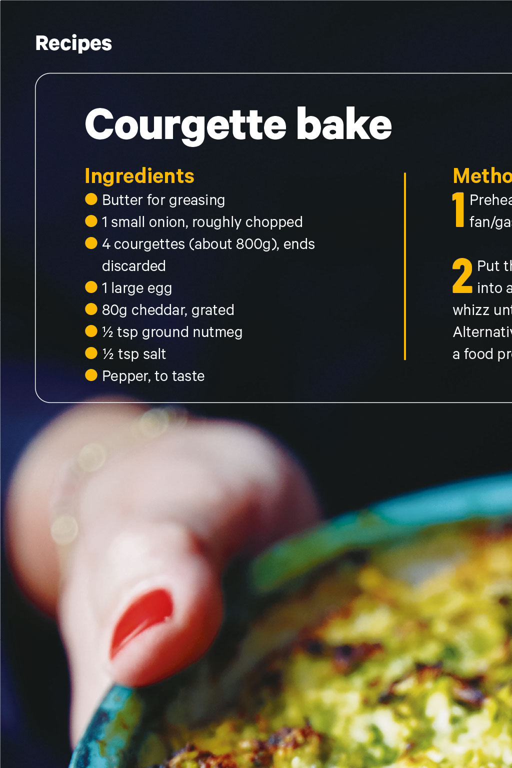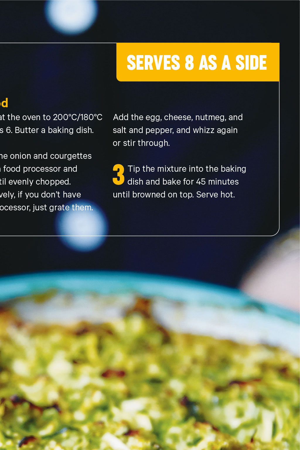 Recipes Serves 8 as a side Ingredients Butter for greasing 1 small onion, roughly chopped 4 courgettes (about 800g), ends discarded 1 large egg 80g cheddar, grated tsp ground nutmeg tsp salt Pepper, to taste Method 1 2 Preheat the oven to 200C/180C fan/gas 6. Butter a baking dish. Put the onion and courgettes into a food processor and whizz until evenly chopped. Alternatively, if you dont have a food processor, just grate them. Add the egg, cheese, nutmeg, and salt and pepper, and whizz again or stir through. 3 Tip the mixture into the baking dish and bake for 45 minutes until browned on top. Serve hot.
