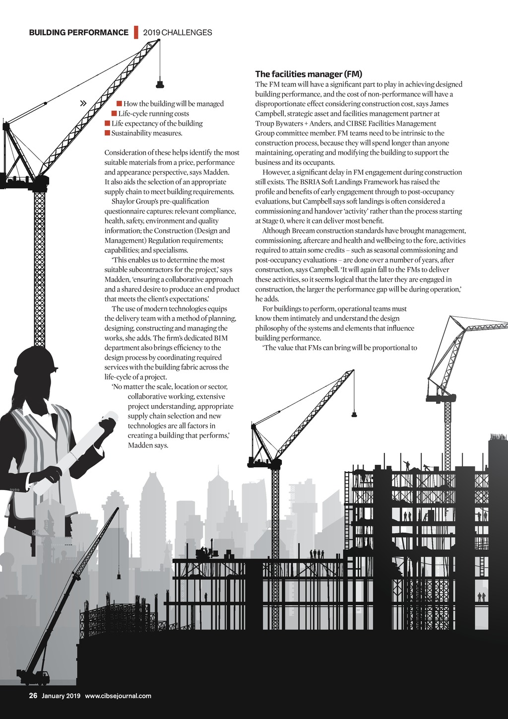 building performance | 2019 challenges The facilities manager (FM) How the building will be managed Life-cycle running costs Life expectancy of the building Sustainability measures. Consideration of these helps identify the most suitable materials from a price, performance and appearance perspective, says Madden. It also aids the selection of an appropriate supply chain to meet building requirements. Shaylor Groups pre-qualification questionnaire captures: relevant compliance, health, safety, environment and quality information; the Construction (Design and Management) Regulation requirements; capabilities; and specialisms. This enables us to determine the most suitable subcontractors for the project, says Madden, ensuring a collaborative approach and a shared desire toproduce an end product that meets the clients expectations. The use of modern technologies equips the delivery team with a method of planning, designing, constructing and managing the works, she adds. The firms dedicated BIM department also brings efficiency to the design process by coordinating required services with the building fabric across the life-cycle of a project. No matter the scale, location or sector, collaborative working, extensive project understanding, appropriate supply chain selection and new technologies are all factorsin creating a building that performs, Madden says. The FM team will have a significant part to play in achieving designed building performance, and the cost of non-performance will have a disproportionate effect considering construction cost, says James Campbell, strategic asset and facilities management partner at Troup Bywaters + Anders, and CIBSE Facilities Management Group committee member. FM teams need to be intrinsic to the construction process, because they will spend longer than anyone maintaining, operating and modifying the building to support the business and its occupants. However, a significant delay in FM engagement during construction still exists. The BSRIA Soft Landings Framework has raised the profile and benefits of early engagement through to post-occupancy evaluations, but Campbell says soft landings is often considered a commissioning and handover activity rather than the process starting at Stage 0, where it can deliver most benefit. Although Breeam construction standards have brought management, commissioning, aftercare and health and wellbeing to the fore, activities required to attain some credits such as seasonal commissioning and post-occupancy evaluations are done over a number of years, after construction, says Campbell. It will again fall to the FMs to deliver these activities, so it seems logical that the later they are engaged in construction, the larger the performance gap will be during operation, he adds. For buildings to perform, operational teams must know them intimately and understand the design philosophy of the systems and elements that influence building performance. The value that FMs can bring will be proportional to 26 January 2019 www.cibsejournal.com CIBSE Jan19 pp24-27 2019 Preview.indd 26 21/12/2018 16:56