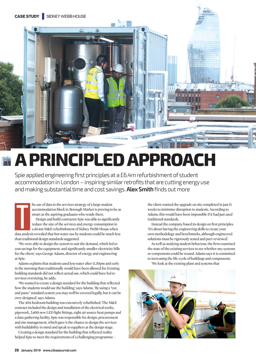 Case study | Sidney Webb House A principled approach Spie applied engineering first principles at a 6.4m refurbishment of student accommodation in London inspiring similar retrofits that are cutting energy use and making substantial time and cost savings. Alex Smith finds out more T he use of data in the services strategy of a large student accommodation block in Borough Market is proving to be as smart as the aspiring graduates who reside there. Design and build contractor Spie was able to significantly reduce the size of the services and energy consumption in a 6.4m M&E refurbishment of Sidney Webb House when data analysis revealed that hot-water use by students could be much less than traditional design standards suggested. We were able to design the system to suit the demand, which led to cost savings for the equipment, and significantly smaller electricity bills for the client, says George Adams, director of energy and engineering at Spie. Adams explains that students used less water after 11.30pm and early in the morning than traditionally would have been allowed for. Existing building standards did not reflect actual use, which could have led to services oversizing, he adds. We wanted to create a design standard for the building that reflected how the students would use the building, says Adams. By using a cut and paste standard system you may well be covered legally, but it can be over-designed, says Adams. The 454-bedroom building was extensively refurbished. The M&E contract included the design and installation of the electrical works, pipework, 2,400 new LED light fittings, eight air source heat pumps and a data-gathering facility. Spie was responsible for design, procurement and site management, which gave it the chance to design the services with buildability in mind and speak to suppliers at the design stage. Creating a design standard for the building that reflected reality helped Spie to meet the requirements of a challenging programme the client wanted the upgrade on site completed in just 11 weeks to minimise disruption to students. According to Adams, this would have been impossible if it had just used traditional standards. Instead the company based its design on first principles. Its about having the engineering skills to create your own methodology and benchmarks, although engineered solutions must be rigorously tested and peer reviewed. As well as studying student behaviour, the firm examined the state of the existing services to see whether any systems or components could be reused. Adams says it is committed to increasing the life-cycle of buildings and components. We look at the existing plant and systems that 28 January 2019 www.cibsejournal.com CIBSE Jan19 pp28-29 Spie heat pumps.indd 28 21/12/2018 15:01