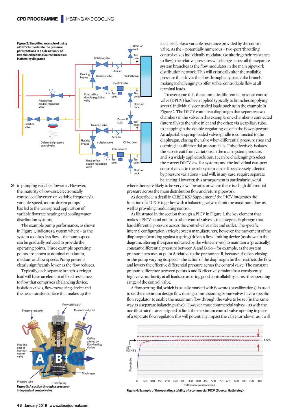 CPD PROGRAMME | HEATING AND COOLING load itself, plus a variable resistance provided by the control valve. As the potentially numerous two-port throttling Test control valves individually modulate (so altering their resistance Isolation valve point to flow), the relative pressures will change across all the separate system branches as the flow modulates in the main pipework Strainer distribution network. This will erratically alter the available Flushing Chilled beam Isolation valve bypass pressure that drives the flow through any particular branch, Control valve making it challenging to offer stable, controllable flow at all terminal loads. Test Test Fixed orifice To overcome this, the automatic differential pressure control point point double-regulatiing valve Fixed orifice valve (DPCV) has been applied typically to branches supplying double-regulating Drain-off several individually controlled loads, such as in the example in valve cock Figure 2. The DPCV contains a diaphragm that separates two chambers in the valve; in this example, one chamber is connected Drain-off Test cock (internally) to the valve inlet and the other, via a capillary tube, Isolation point Isolation valve valve to a tapping in the double-regulating valve in the flow pipework. An adjustable spring-loaded valve spindle is connected to the Strainer diaphragm, closing the valve when differential pressure rises and Flushing Chilled beam Differential pressure Isolation valve bypass control valve opening it as differential pressure falls. This effectively isolates Control valve the sub-circuit from variations in the main system pressure, and is a widely applied solution. It can be challenging to select Test Test Fixed orifice point point the correct DPCV size for systems, and the individual two-port double-regulatiing valve control valves in the sub-system can still be adversely affected Drain-off cock by pressure variations and will, in any case, require separate balancing. However, this arrangement is particularly useful in pumping variable flowrates. However, where there are likely to be very low flowrates or where there is a high differential thematurity of low-cost, electronically pressure across the main distribution flow and return pipework. controlled (inverter or variable frequency), As described in detail in CIBSE KS7 Supplement,2 the PICV integrates the function of a DPCV together with a balancing valve to limit the maximum flow, as variable-speed, motor-driven pumps well as providing modulating control. has led to the widespread application of As illustrated in the section through a PICV in Figure 3, the key element that variable flowrate heating and cooling water makes a PICV stand out from other control valves is the integral diaphragm that distribution systems. has differential pressure across the control-valve inlet and outlet. The specific The example pump performance, as shown internal configuration varies between manufacturers; however, the movement of the in Figure 1, indicates a system where as the diaphragm (working against a spring) drives a flow-limiting device (as shown in the system requires less flow the pump speed diagram, altering the space indicated by the white arrows) to maintain a (practically) can be gradually reduced to provide the constant differential pressure between A and B. So for example, as the system operating points. Three example operating pressure increases at point A relative to the pressure at B, because of valves closing points are shown at nominal maximum, or the pump varying its speed the action of the diaphragm further restricts the flow medium and low speeds. Pump power is and lowers the effective differential pressure across the control valve. The constant clearly significantly lower as the flow reduces. pressure difference between points A and B effectively maintains a consistently Typically, each separate branch serving a high valve authority at all loads, so assuring good controllability across the operating load will have an element of fixed resistance range of the control valve. to flow that comprises a balancing device, A flow-setting dial, which is usually marked with flowrate (or calibrations), is used isolation valves, flow-measuring device and to set the maximum design flow during commissioning. Some valves have a specific the heat-transfer surface that makes up the flow regulator to enable the maximum flow through the valve to be set (in the same Flow-setting dial way as a separate balancing valve). However, most commercial valves as with the Pressure test point Pressure test point one illustrated are designed to limit the maximum control valve opening in place of a separate flow regulator; this will potentially impact the valve turndown, as it will Figure 2: Simplified example of using a DPCV to moderate the pressure perturbations in a sub-network of two chilled beams (Source: based on Hattersley diagram) Orifice altered by flow-limiting device A B 10% SET POINT 5 Flowrate I/s Plug and seat of two-port control valve Drain-off cock Diaphragm Pressure tube Fixed spring Figure 3: A section through a pressureindependent control valve 0 50 100 150 200 250 300 350 400 450 500 550 600 650 700 750 800 Differential pressure (kPa) Figure 4: Example of the operating stability of a commercial PICV (Source: Hattersley) 48 January 2019 www.cibsejournal.com CIBSE Jan19 pp47-50 CPD 4.indd 48 21/12/2018 15:13