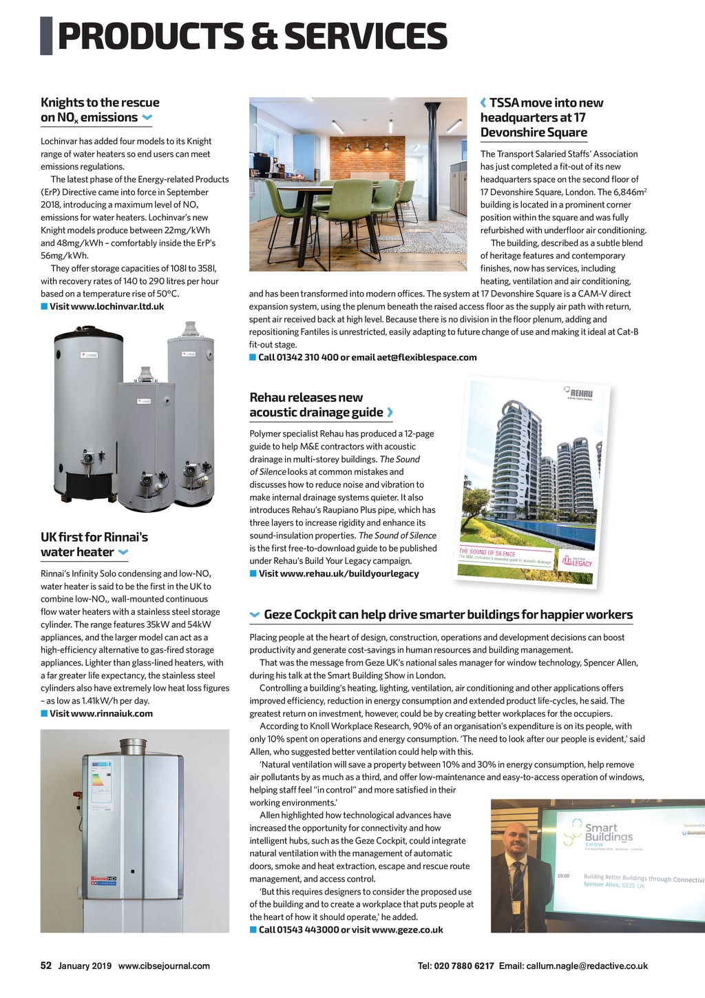 PRODUCTS & SERVICES Knights to the rescue on NOx emissions Lochinvar has added four models to its Knight range of water heaters so end users can meet emissions regulations. The latest phase of the Energy-related Products (ErP) Directive came into force in September 2018, introducing a maximum level of NOx emissions for water heaters. Lochinvars new Knight models produce between 22mg/kWh and 48mg/kWh comfortably inside the ErPs 56mg/kWh. They offer storage capacities of 108l to 358l, with recovery rates of 140 to 290 litres per hour based on a temperature rise of 50C. Visit www.lochinvar.ltd.uk TSSA move into new headquarters at 17 Devonshire Square The Transport Salaried Staffs Association has just completed a fit-out of its new headquarters space on the second floor of 17 Devonshire Square, London. The 6,846m2 building is located in a prominent corner position within the square and was fully refurbished with underfloor air conditioning. The building, described as a subtle blend of heritage features and contemporary finishes, now has services, including heating, ventilation and air conditioning, and has been transformed into modern offices. The system at 17 Devonshire Square is a CAM-V direct expansion system, using the plenum beneath the raised access floor as the supply air path with return, spent air received back at high level. Because there is no division in the floor plenum, adding and repositioning Fantiles is unrestricted, easily adapting to future change of use and making it ideal at Cat-B fit-out stage. Call 01342 310 400 or email aet@flexiblespace.com Rehau releases new acoustic drainage guide UK first for Rinnais water heater Rinnais Infinity Solo condensing and low-NOx water heater is said to be the first in the UK to combine low-NOx, wall-mounted continuous flow water heaters with a stainless steel storage cylinder. The range features 35kW and 54kW appliances, and the larger model can act as a high-efficiency alternative to gas-fired storage appliances. Lighter than glass-lined heaters, with a far greater life expectancy, the stainless steel cylinders also have extremely low heat loss figures as low as 1.41kW/h per day. Visit www.rinnaiuk.com 52 January 2019 www.cibsejournal.com CIBSE Jan19 pp52-55 Products.indd 52 Polymer specialist Rehau has produced a 12-page guide to help M&E contractors with acoustic drainage in multi-storey buildings. The Sound of Silence looks at common mistakes and discusses how to reduce noise and vibration to make internal drainage systems quieter. It also introduces Rehaus Raupiano Plus pipe, which has three layers to increase rigidity and enhance its sound-insulation properties. The Sound of Silence is the first free-to-download guide to be published under Rehaus Build Your Legacy campaign. Visit www.rehau.uk/buildyourlegacy Geze Cockpit can help drive smarter buildings for happier workers Placing people at the heart of design, construction, operations and development decisions can boost productivity and generate cost-savings in human resources and building management. That was the message from Geze UKs national sales manager for window technology, Spencer Allen, during his talk at the Smart Building Show in London. Controlling a buildings heating, lighting, ventilation, air conditioning and other applications offers improved efficiency, reduction in energy consumption and extended product life-cycles, he said. The greatest return on investment, however, could be by creating better workplaces for the occupiers. According to Knoll Workplace Research, 90% of an organisations expenditure is on its people, with only 10% spent on operations and energy consumption. The need to look after our people is evident, said Allen, who suggested better ventilation could help with this. Natural ventilation will save a property between 10% and 30% in energy consumption, help remove air pollutants by as much as a third, and offer low-maintenance and easy-to-access operation of windows, helping staff feel in control and more satisfied in their working environments. Allen highlighted how technological advances have increased the opportunity for connectivity and how intelligent hubs, such as the Geze Cockpit, could integrate natural ventilation with the management of automatic doors, smoke and heat extraction, escape and rescue route management, and access control. But this requires designers to consider the proposed use of the building and to create a workplace that puts people at the heart of how it should operate, he added. Call 01543 443000 or visit www.geze.co.uk Tel: 020 7880 6217 Email: callum.nagle@redactive.co.uk 21/12/2018 15:16