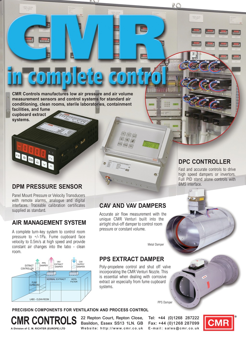 CMR Controls manufactures low air pressure and air volume measurement sensors and control systems for standard air conditioning, clean rooms, sterile laboratories, containment facilities, and fume cupboard extract systems. DPC CONTROLLER Fast and accurate controls to drive high speed dampers or invertors. Full PID stand alone controls with BMS interface. DPM PRESSURE SENSOR Panel Mount Pressure or Velocity Transducers with remote alarms, analogue and digital interfaces. Traceable calibration certificates supplied as standard. AIR MANAGEMENT SYSTEM A complete turn-key system to control room pressure to +/-1Pa. Fume cupboard face velocity to 0.5m/s at high speed and provide constant air changes into the labo - clean room. EXTRACT CONTROLLER PPS DAMPER VAV EXTRACT DAMPER NORMAL EXTRACT FUME CUPBOARD CAV SUPPLY DAMPER HEPA FILTER CAV AND VAV DAMPERS Accurate air flow measurement with the unique CMR Venturi built into the airtight shut-off damper to control room pressure or constant volume. Metal Damper PPS EXTRACT DAMPER Poly-propelene control and shut off valve incorporating the CMR Venturi Nozzle. This is essential when dealing with corrosive extract air especially from fume cupboard systems. LABO - CLEAN ROOM PPS Damper PRECISION COMPONENTS FOR VENTILATION AND PROCESS CONTROL CMR CONTROLS 22 Repton Court, Repton Close, Basildon, Essex SS13 1LN. GB Tel: +44 (0)1268 287222 Fax: +44 (0)1268 287099 A Division of C. M. RICHTER (EUROPE) LTD W e b s i t e : h t t p : / / w w w. c m r . c o . u k E - m a i l : s a l e s @ c m r. c o. u k 60 January 2019 www.cibsejournal.com p60_CIBSEMagJan19.indd 60 18/12/2018 09:06