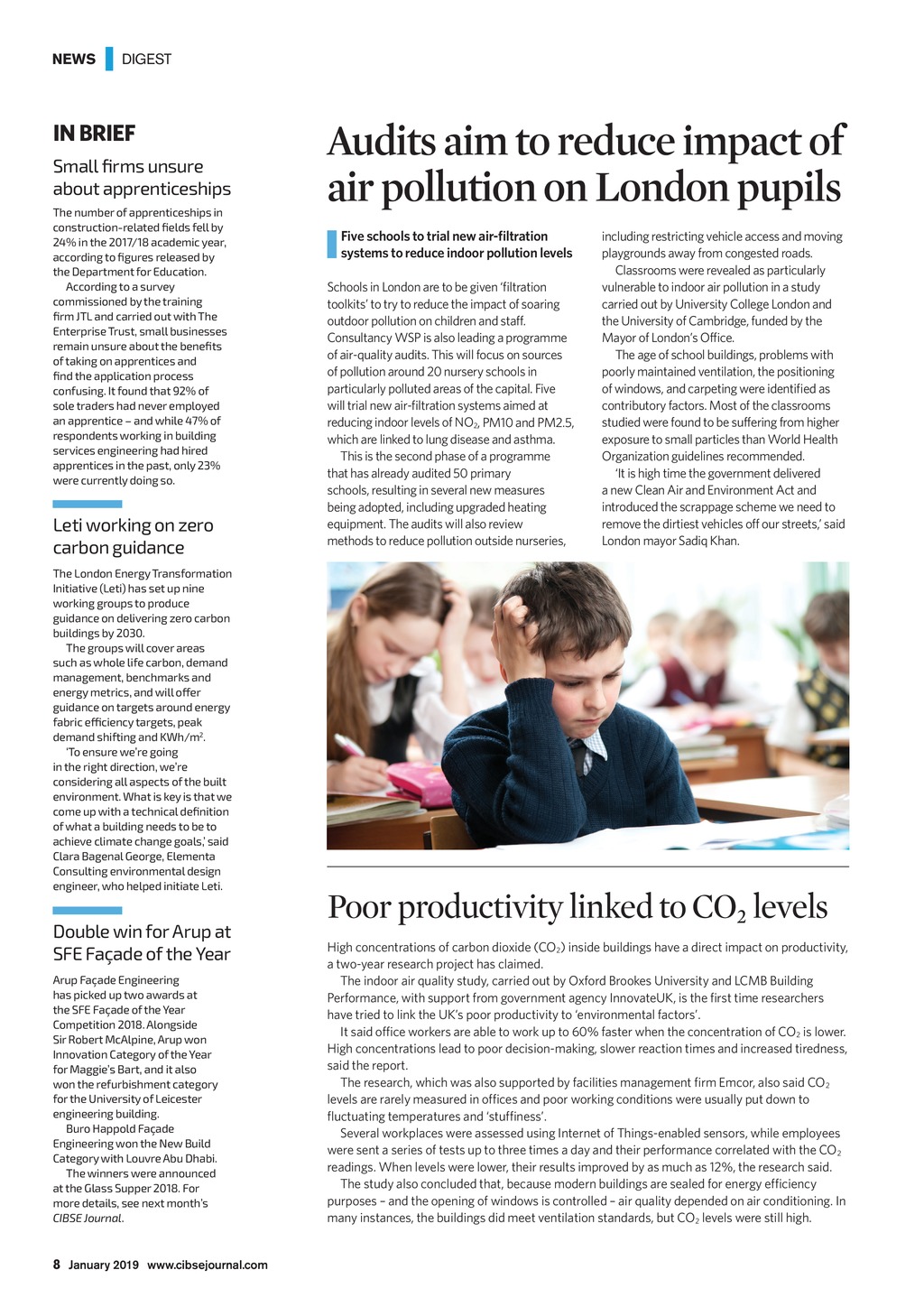 NEWS | DIGEST IN BRIEF Small firms unsure about apprenticeships The number of apprenticeships in construction-related fields fell by 24% in the 2017/18 academic year, according to figures released by the Department for Education. According to a survey commissioned by the training firm JTL and carried out with The Enterprise Trust, small businesses remain unsure about the benefits of taking on apprentices and find the application process confusing. It found that 92% of sole traders had never employed an apprentice and while 47% of respondents working in building services engineering had hired apprentices in the past, only 23% were currently doing so. Leti working on zero carbon guidance The London Energy Transformation Initiative (Leti) has set up nine working groups to produce guidance on delivering zero carbon buildings by 2030. The groups will cover areas such as whole life carbon, demand management, benchmarks and energy metrics, and will offer guidance on targets around energy fabric efficiency targets, peak demand shifting and KWh/m2. To ensure were going in the right direction, were considering all aspects of the built environment. What is key is that we come up with a technical definition of what a building needs to be to achieve climate change goals, said Clara Bagenal George, Elementa Consulting environmental design engineer, who helped initiate Leti. Double win for Arup at SFE Faade of the Year Arup Faade Engineering has picked up two awards at the SFE Faade of the Year Competition 2018. Alongside Sir Robert McAlpine, Arup won Innovation Category of the Year for Maggies Bart, and it also won the refurbishment category for the University of Leicester engineeringbuilding. Buro Happold Faade Engineering won the New Build Category with Louvre Abu Dhabi. The winners were announced at the Glass Supper 2018. For more details, see next months CIBSEJournal. Audits aim to reduce impact of air pollution on London pupils Five schools to trial new air-filtration systems to reduce indoor pollution levels Schools in London are to be given filtration toolkits to try to reduce the impact of soaring outdoor pollution on children and staff. Consultancy WSP is also leading a programme of air-quality audits. This will focus on sources of pollution around 20 nursery schools in particularly polluted areas of the capital. Five will trial new air-filtration systems aimed at reducing indoor levels of NO2, PM10 and PM2.5, which are linked to lung disease and asthma. This is the second phase of a programme that has already audited 50 primary schools, resulting in several new measures being adopted, including upgraded heating equipment. The audits will also review methods to reduce pollution outside nurseries, including restricting vehicle access and moving playgrounds away from congested roads. Classrooms were revealed as particularly vulnerable to indoor air pollution in a study carried out by University College London and the University of Cambridge, funded by the Mayor of Londons Office. The age of school buildings, problems with poorly maintained ventilation, the positioning of windows, and carpeting were identified as contributory factors. Most of the classrooms studied were found to be suffering from higher exposure to small particles than World Health Organization guidelines recommended. It is high time the government delivered a new Clean Air and Environment Act and introduced the scrappage scheme we need to remove the dirtiest vehicles off our streets, said London mayor Sadiq Khan. Poor productivity linked to CO2 levels High concentrations of carbon dioxide (CO2) inside buildings have a direct impact on productivity, a two-year research project has claimed. The indoor air quality study, carried out by Oxford Brookes University and LCMB Building Performance, with support from government agency InnovateUK, is the first time researchers have tried to link the UKs poor productivity to environmental factors. It said office workers are able to work up to 60% faster when the concentration of CO2 islower. High concentrations lead to poor decision-making, slower reaction times and increased tiredness, said the report. The research, which was also supported by facilities management firm Emcor, also said CO2 levels are rarely measured in offices and poor working conditions were usually put down to fluctuating temperatures and stuffiness. Several workplaces were assessed using Internet of Things-enabled sensors, while employees were sent a series of tests up to three times a day and their performance correlated with the CO2 readings. When levels were lower, their results improved by as much as 12%, the research said. The study also concluded that, because modern buildings are sealed for energy efficiency purposes and the opening of windows is controlled air quality depended on air conditioning. In many instances, the buildings did meet ventilation standards, but CO2 levels were still high. 8 January 2019 www.cibsejournal.com CIBSE Jan19 pp08-09 News.indd 8 21/12/2018 16:54