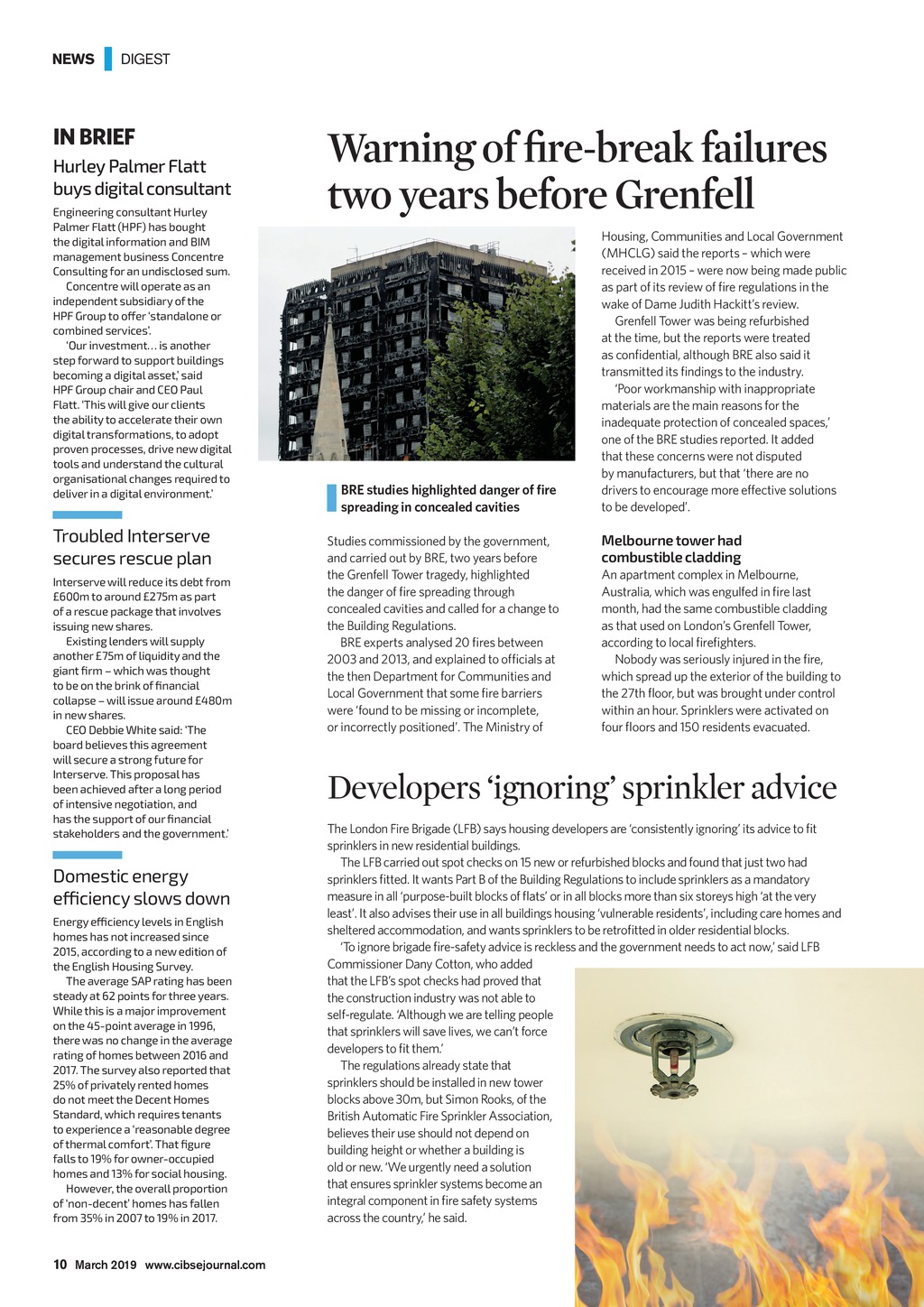 NEWS | DIGEST IN BRIEF Hurley Palmer Flatt buys digital consultant Engineering consultant Hurley Palmer Flatt (HPF) has bought the digital information and BIM management business Concentre Consulting for an undisclosed sum. Concentre will operate as an independent subsidiary of the HPF Group to offer standalone or combined services. Our investment is another step forward to support buildings becoming a digital asset, said HPF Group chair and CEO Paul Flatt. This will give our clients the ability to accelerate their own digital transformations, to adopt proven processes, drive new digital tools and understand the cultural organisational changes required to deliver in a digital environment. Troubled Interserve secures rescue plan Interserve will reduce its debt from 600m to around 275m as part of a rescue package that involves issuing new shares. Existing lenders will supply another 75m of liquidity and the giant firm which was thought tobe on the brink of financial collapse will issue around 480m in new shares. CEO Debbie White said: The board believes this agreement will secure a strong future for Interserve. This proposal has been achieved after a long period of intensive negotiation, and has the support of our financial stakeholders and the government. Domestic energy efficiency slows down Energy efficiency levels in English homes has not increased since 2015, according to a new edition of the English Housing Survey. The average SAP rating has been steady at 62 points for three years. While this is a major improvement on the 45-point average in 1996, there was no change in the average rating of homes between 2016 and 2017. The survey also reported that 25% of privately rented homes do not meet the Decent Homes Standard, which requires tenants to experience a reasonable degree of thermal comfort. That figure falls to 19% for owner-occupied homes and 13% for social housing. However, the overall proportion of non-decent homes has fallen from 35% in 2007 to 19% in 2017. Warning of fire-break failures two years before Grenfell BRE studies highlighted danger of fire spreading in concealed cavities Studies commissioned by the government, and carried out by BRE, two years before the Grenfell Tower tragedy, highlighted thedangerof fire spreading through concealedcavities and called for a change to the Building Regulations. BRE experts analysed 20 fires between 2003 and 2013, and explained to officials at the then Department for Communities and Local Government that some fire barriers were found to be missing or incomplete, or incorrectly positioned. The Ministry of Housing, Communities and Local Government (MHCLG) said the reports which were received in 2015 were now being made public as part of its review of fire regulations in the wake of Dame Judith Hackitts review. Grenfell Tower was being refurbished at the time, but the reports were treated as confidential, although BRE also said it transmitted its findings to the industry. Poor workmanship with inappropriate materials are the main reasons for the inadequate protection of concealed spaces, one of the BRE studies reported. It added that these concerns were not disputed by manufacturers, but that there are no driverstoencourage more effective solutions to be developed. Melbourne tower had combustible cladding An apartment complex in Melbourne, Australia, which was engulfed in fire last month, had the same combustible cladding as thatused on Londons Grenfell Tower, according to local firefighters. Nobody was seriously injured in the fire, which spread up the exterior of the building to the 27th floor, but was brought under control within an hour. Sprinklers were activated on four floors and 150 residents evacuated. Developers ignoring sprinkler advice The London Fire Brigade (LFB) says housing developers are consistently ignoring its advice to fit sprinklers in new residential buildings. The LFB carried out spot checks on 15 new or refurbished blocks and found that just two had sprinklers fitted. It wants Part B of the Building Regulations to include sprinklers as a mandatory measure in all purpose-built blocks of flats or in all blocks more than six storeys high at the very least. It also advises their use in all buildings housing vulnerable residents, including care homes and sheltered accommodation, and wants sprinklers to be retrofitted in older residential blocks. To ignore brigade fire-safety advice is reckless and the government needs to act now, said LFB Commissioner Dany Cotton, who added that the LFBs spot checks had proved that the construction industry was not able to self-regulate. Although we are telling people that sprinklers will save lives, we cant force developers to fit them. The regulations already state that sprinklers should be installed in new tower blocks above 30m, but Simon Rooks, of the British Automatic Fire Sprinkler Association, believes their use should not depend on building height or whether a building is old or new. We urgently need a solution that ensures sprinkler systems become an integral component in fire safety systems across the country, he said. 10 March 2019 www.cibsejournal.com CIBSE Mar19 pp10 News v2.indd 10 22/02/2019 16:28