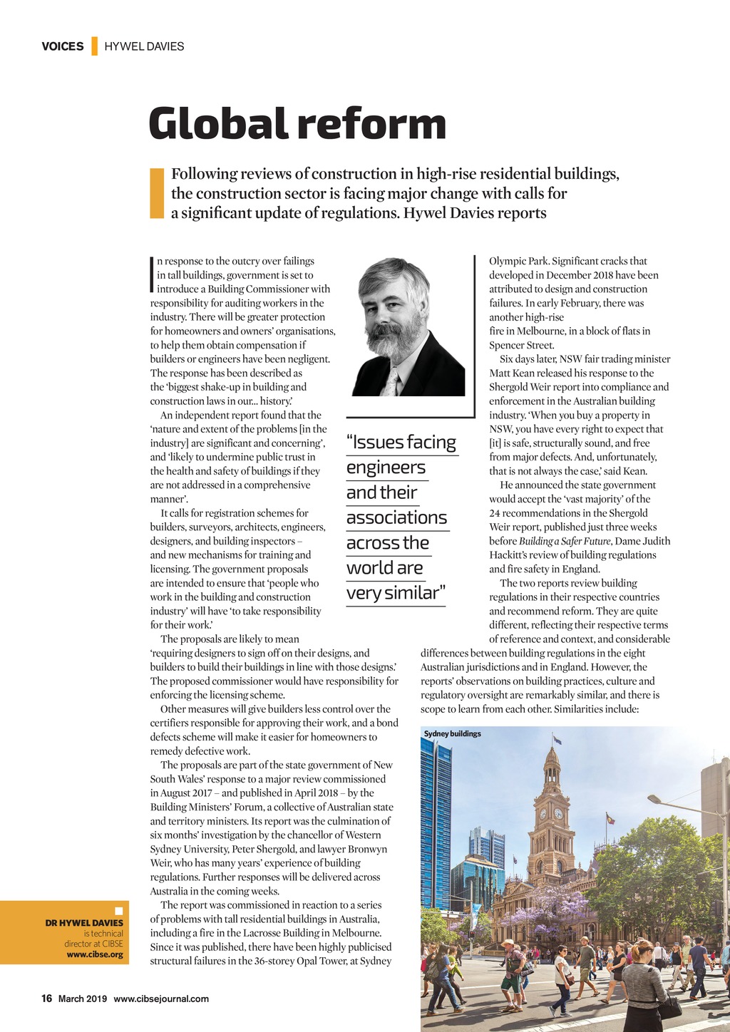 VOICES | HYWEL DAVIES Global reform Following reviews of construction in high-rise residential buildings, the construction sector is facing major change with calls for a significant update of regulations. Hywel Davies reports I n response to the outcry over failings in tall buildings, government is set to introduce a Building Commissioner with responsibility for auditing workers in the industry. There will be greater protection for homeowners and owners organisations, to help them obtain compensation if builders or engineers have been negligent. The response has been described as the biggest shake-up in building and construction laws in our history. An independent report found that the nature and extent of the problems [in the industry] are significant and concerning, and likely to undermine public trust in the health and safety of buildings if they are not addressed in a comprehensive manner. It calls for registration schemes for builders, surveyors, architects, engineers, designers, and building inspectors and new mechanisms for training and licensing. The government proposals are intended to ensure that people who work in the building and construction industry will have to take responsibility for theirwork. The proposals are likely to mean requiring designers to sign off on their designs, and builders to build their buildings in line with those designs. The proposed commissioner would have responsibility for enforcing the licensing scheme. Other measures will give builders less control over the certifiers responsible for approving their work, and a bond defects scheme will make it easier for homeowners to remedy defective work. The proposals are part of the state government of New South Wales response to a major review commissioned in August 2017 and published in April 2018 by the Building Ministers Forum, a collective of Australian state and territory ministers. Its report was the culmination of six months investigation by the chancellor of Western Sydney University, Peter Shergold, and lawyer Bronwyn Weir, who has many years experience of building regulations. Further responses will be delivered across Australia in the coming weeks. The report was commissioned in reaction to a series of problems with tall residential buildings in Australia, including a fire in the Lacrosse Building in Melbourne. Since it was published, there have been highly publicised structural failures in the 36-storey Opal Tower, at Sydney Olympic Park. Significant cracks that developed in December 2018 have been attributed to design and construction failures. In early February, there was another high-rise fire in Melbourne, in a block of flats in Spencer Street. Six days later, NSW fair trading minister Matt Kean released his response to the Shergold Weir report into compliance and enforcement in the Australian building industry. When you buy a property in NSW, you have every right to expect that [it] is safe, structurally sound, and free from major defects. And, unfortunately, that is not always the case, said Kean. He announced the state government would accept the vast majority of the 24 recommendations in the Shergold Weir report, published just three weeks before Building a Safer Future, Dame Judith Hackitts review of building regulations and fire safety in England. The two reports review building regulations in their respective countries and recommend reform. They are quite different, reflecting their respective terms of reference and context, and considerable differences between building regulations in the eight Australian jurisdictions and in England. However, the reports observations on building practices, culture and regulatory oversight are remarkably similar, and there is scope to learn from each other. Similarities include: Issues facing engineers and their associations across the world are verysimilar DR HYWEL DAVIES is technical director at CIBSE www.cibse.org Sydney buildings 16 March 2019 www.cibsejournal.com CIBSE Mar19 pp16-17 Hywel Davies v2.indd 16 22/02/2019 18:20
