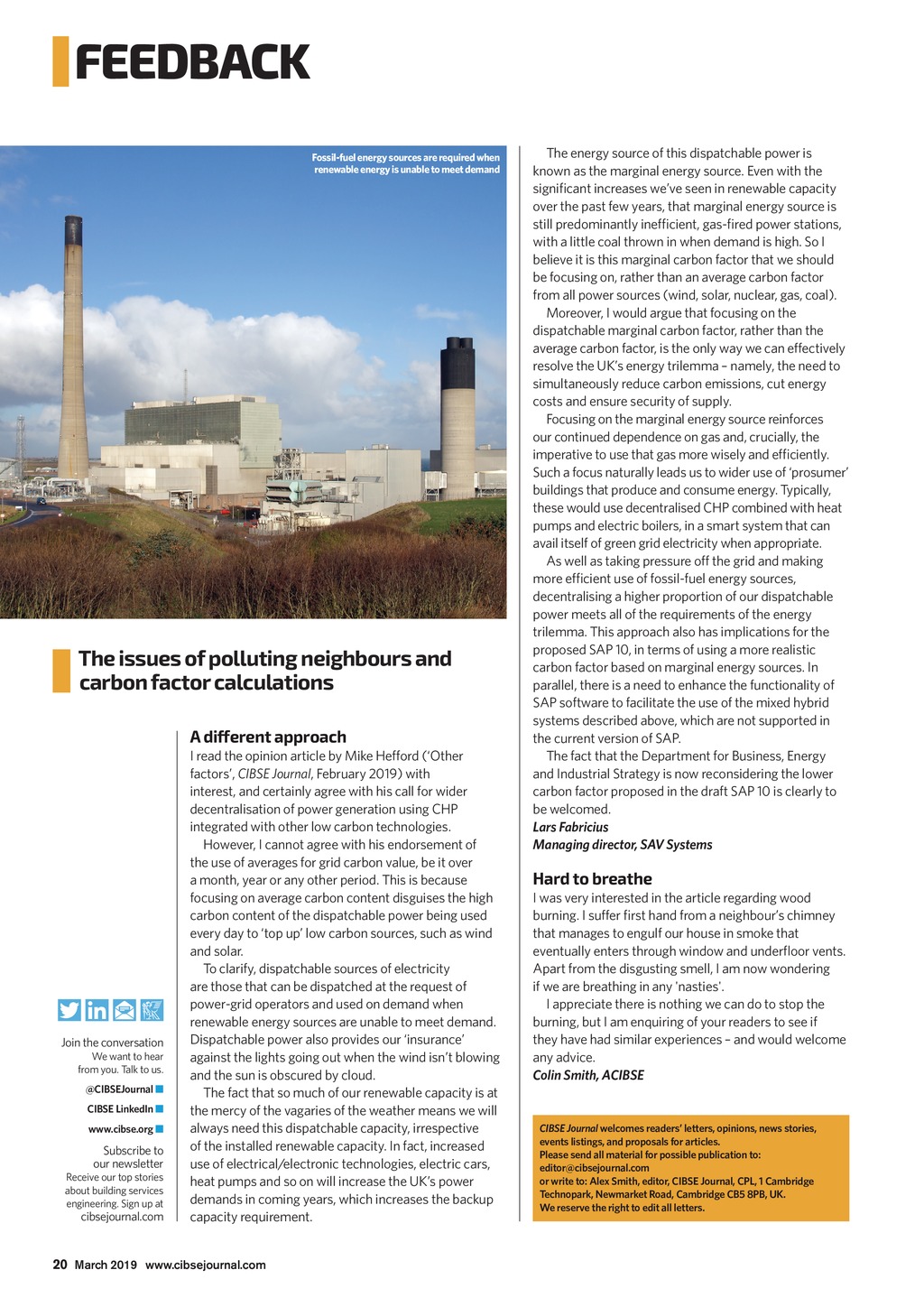 FEEDBACK Fossil-fuel energy sources are required when renewable energy is unable to meet demand The issues of polluting neighbours and carbon factor calculations A different approach Join the conversation We want to hear from you. Talk to us. @CIBSEJournal CIBSE LinkedIn www.cibse.org Subscribe to our newsletter Receive our top stories about building services engineering. Sign up at cibsejournal.com I read the opinion article by Mike Hefford (Other factors, CIBSE Journal, February 2019) with interest, and certainly agree with his call for wider decentralisation of power generation using CHP integrated with other low carbon technologies. However, I cannot agree with his endorsement of the use of averages for grid carbon value, be it over a month, year or any other period. This is because focusing on average carbon content disguises the high carbon content of the dispatchable power being used every day to top up low carbon sources, such as wind and solar. To clarify, dispatchable sources of electricity are thosethat can be dispatched at the request of power-grid operators and used on demand when renewable energy sources are unable to meet demand. Dispatchable power also provides our insurance againstthe lights going out when the wind isnt blowing and the sun is obscured by cloud. The fact that so much of our renewable capacity is at the mercy of the vagaries of the weather means we will always need this dispatchable capacity, irrespective of the installed renewable capacity. In fact, increased useofelectrical/electronic technologies, electric cars, heat pumps and so on will increase the UKs power demands in coming years, which increases the backup capacity requirement. The energy source of this dispatchable power is known as the marginal energy source. Even with the significant increases weve seen in renewable capacity over the past few years, that marginal energy source is still predominantly inefficient, gas-fired power stations, with a little coal thrown in when demand is high. So I believe it is this marginal carbon factor that we should be focusing on, rather than an average carbon factor from all power sources (wind, solar, nuclear, gas, coal). Moreover, I would argue that focusing on the dispatchable marginal carbon factor, rather than the average carbon factor, is the only way we can effectively resolve the UKs energy trilemma namely, the need to simultaneously reduce carbon emissions, cut energy costs and ensure security of supply. Focusing on the marginal energy source reinforces our continued dependence on gas and, crucially, the imperative to use that gas more wisely and efficiently. Such a focus naturally leads us to wider use of prosumer buildings that produce and consume energy. Typically, these would use decentralised CHP combined with heat pumps and electric boilers, in a smart system that can avail itself of green grid electricity when appropriate. As well as taking pressure off the grid and making more efficient use of fossil-fuel energy sources, decentralising a higher proportion of our dispatchable power meets all of the requirements of the energy trilemma. This approach also has implications for the proposed SAP 10, in terms of using a more realistic carbon factor based on marginal energy sources. In parallel, there is a need to enhance the functionality of SAP software tofacilitate the use of the mixed hybrid systems described above, which are not supported in the current version of SAP. The fact that the Department for Business, Energy and Industrial Strategy is now reconsidering the lower carbon factor proposed in the draft SAP 10 is clearly to be welcomed. Lars Fabricius Managing director, SAV Systems Hard to breathe I was very interested in the article regarding wood burning. I suffer first hand from a neighbours chimney that manages to engulf our house in smoke that eventually enters through window and underfloor vents. Apart from the disgusting smell, I am now wondering ifwe are breathing in any nasties . I appreciate there is nothing we can do to stop the burning, but I am enquiring of your readers to see if theyhave had similar experiences and would welcome any advice. Colin Smith, ACIBSE CIBSE Journal welcomes readers letters, opinions, news stories, events listings, and proposals for articles. Please send all material for possible publication to: editor@cibsejournal.com or write to: Alex Smith, editor, CIBSE Journal, CPL, 1 Cambridge Technopark, Newmarket Road, Cambridge CB5 8PB, UK. We reserve the right to edit all letters. 20 March 2019 www.cibsejournal.com CIBSE Mar19 pp20 Letters.indd 20 22/02/2019 16:33
