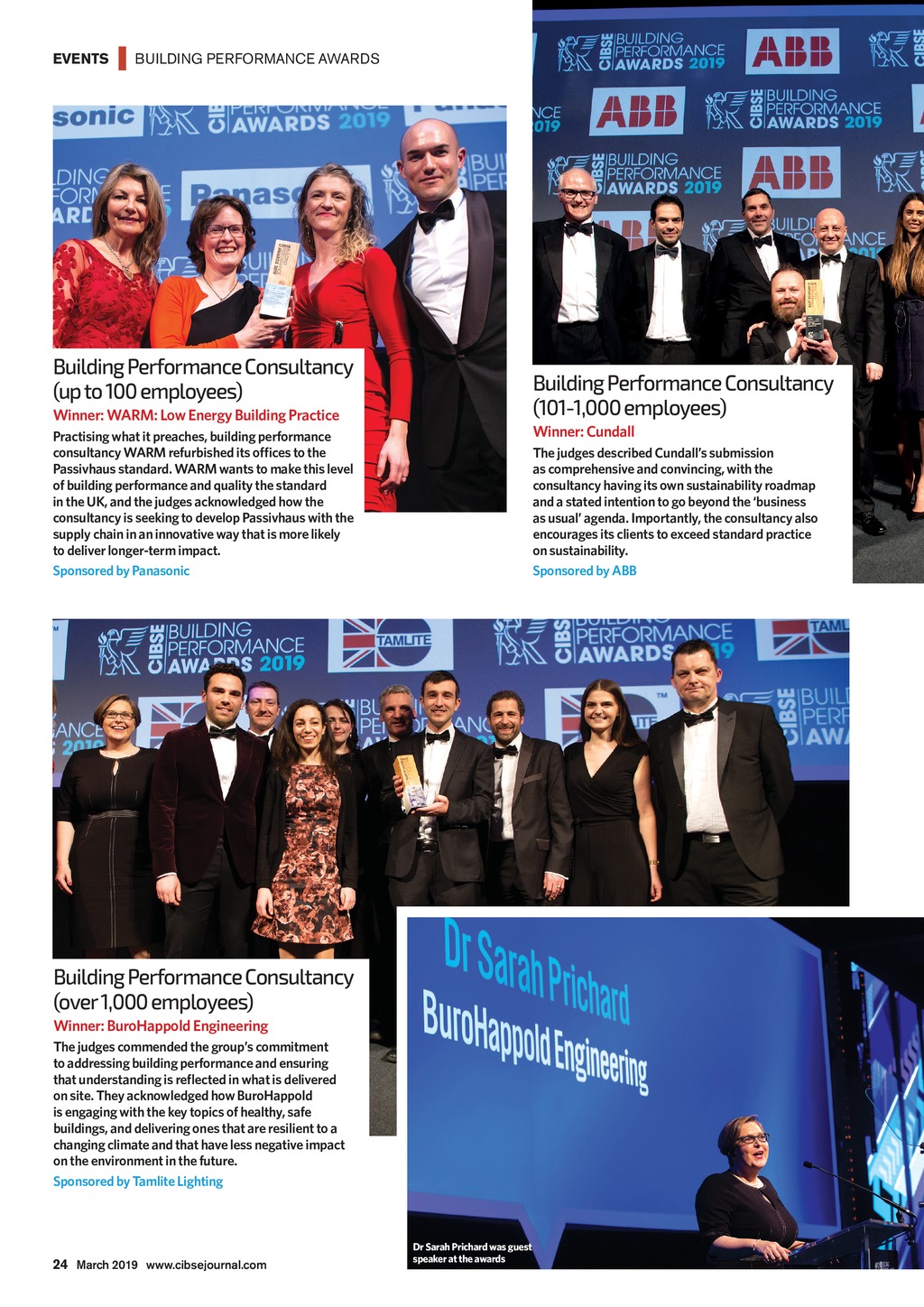 EVENTS | BUILDING PERFORMANCE AWARDS Building Performance Consultancy (up to 100 employees) Winner: WARM: Low Energy Building Practice Building Performance Consultancy (101-1,000 employees) Practising what it preaches, building performance consultancy WARM refurbished its offices to the Passivhaus standard. WARM wants to make this level of building performance and quality the standard in the UK, and the judges acknowledged how the consultancy is seeking to develop Passivhaus with the supply chain in an innovative way that is more likely to deliver longer-term impact. Sponsored by Panasonic The judges described Cundalls submission as comprehensive and convincing, with the consultancyhaving its own sustainability roadmap and a stated intention to go beyond the business as usual agenda. Importantly, the consultancy also encourages its clients to exceed standard practice onsustainability. Sponsored by ABB Winner: Cundall Building Performance Consultancy (over 1,000 employees) Winner: BuroHappold Engineering The judges commended the groups commitment to addressing building performance and ensuring thatunderstanding is reflected in what is delivered on site. They acknowledged how BuroHappold is engaging with the key topics of healthy, safe buildings, and delivering ones that are resilient to a changing climate and that have less negative impact on the environment in the future. Sponsored by Tamlite Lighting 24 March 2019 www.cibsejournal.com CIBSE Mar19 pp22-26, 28,29 CIBSE Awards.indd 24 Dr Sarah Prichard was guest speaker at the awards 22/02/2019 16:35