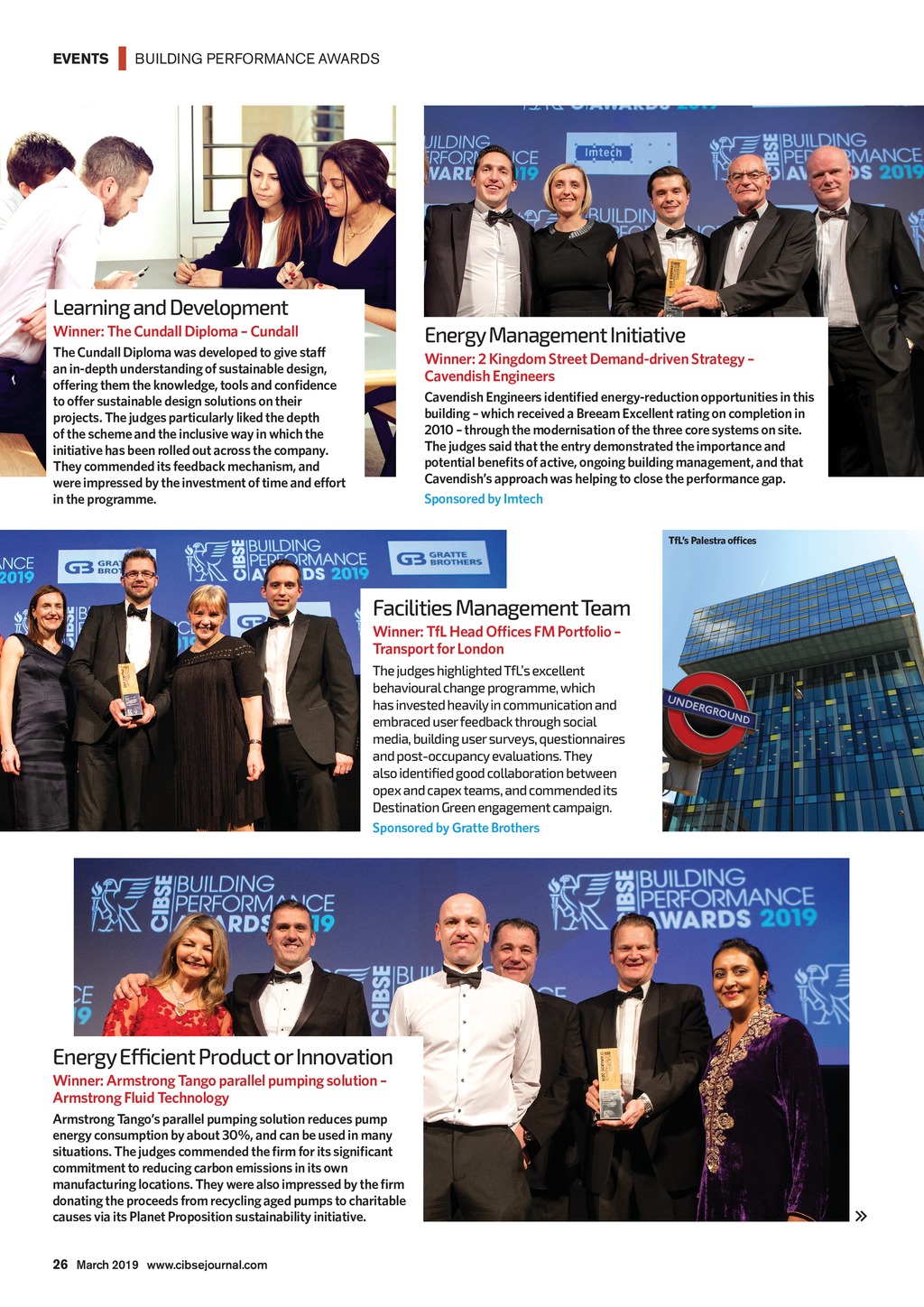 EVENTS | BUILDING PERFORMANCE AWARDS Learning and Development Winner: The Cundall Diploma Cundall Energy Management Initiative The Cundall Diploma was developed to give staff an in-depth understanding of sustainable design, offering them the knowledge, tools and confidence tooffer sustainable design solutions on their projects. The judges particularly liked the depth of the schemeand the inclusive way in which the initiative has been rolled out across the company. They commended its feedback mechanism, and wereimpressed by the investment of time and effort in the programme. Winner: 2 Kingdom Street Demand-driven Strategy CavendishEngineers Cavendish Engineers identified energy-reduction opportunities in this building which received a Breeam Excellent rating on completion in 2010 through the modernisation of the three core systems on site. The judges said that the entry demonstrated the importance and potential benefits of active, ongoing building management, and that Cavendishs approach was helping to close the performance gap. Sponsored by Imtech TfLs Palestra offices Facilities Management Team Winner: TfL Head Offices FM Portfolio Transport for London The judges highlighted TfLs excellent behavioural change programme, which has invested heavily in communication and embraced user feedback through social media, building user surveys, questionnaires and post-occupancy evaluations. They also identified good collaboration between opex and capex teams, and commended its Destination Green engagement campaign. Sponsored by Gratte Brothers Energy Efficient Product or Innovation Winner: Armstrong Tango parallel pumping solution Armstrong Fluid Technology Armstrong Tangos parallel pumping solution reduces pump energy consumption by about 30%, and can be used in many situations. The judges commended the firm for its significant commitment to reducing carbon emissions in its own manufacturing locations. They were also impressed by the firm donating the proceeds from recycling aged pumps to charitable causes via its Planet Proposition sustainability initiative. 26 March 2019 www.cibsejournal.com CIBSE Mar19 pp22-26, 28,29 CIBSE Awards.indd 26 22/02/2019 16:35