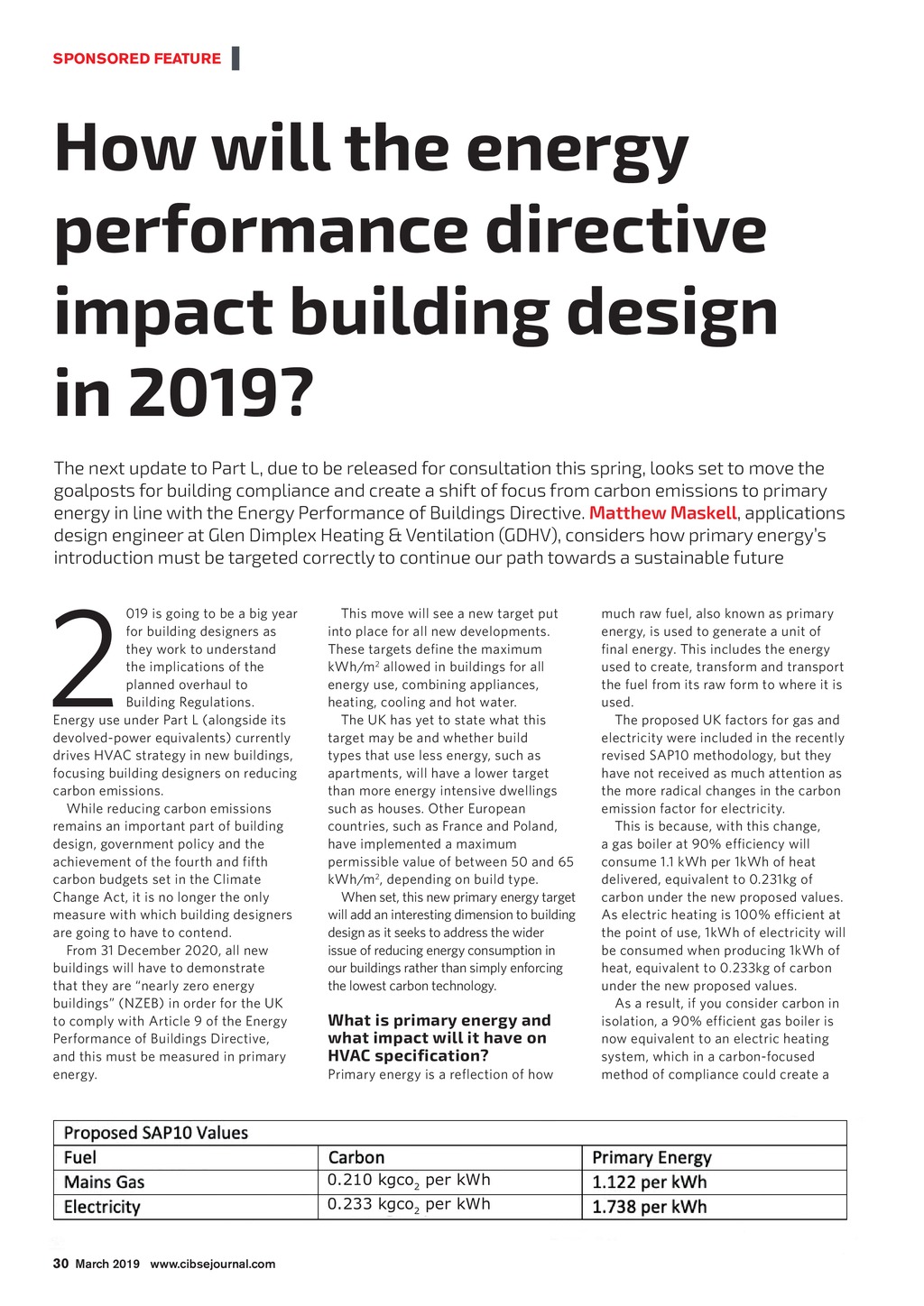 SPONSORED FEATURE | How will the energy performance directive impact building design in 2019? The next update to Part L, due to be released for consultation this spring, looks set to move the goalposts for building compliance and create a shift of focus from carbon emissions to primary energy in line with the Energy Performance of Buildings Directive. Matthew Maskell, applications design engineer at Glen Dimplex Heating & Ventilation (GDHV), considers how primary energys introduction must be targeted correctly to continue our path towards a sustainable future 2 019 is going to be a big year for building designers as they work to understand the implications of the planned overhaul to Building Regulations. Energy use under Part L (alongside its devolved-power equivalents) currently drives HVAC strategy in new buildings, focusing building designers on reducing carbon emissions. While reducing carbon emissions remains an important part of building design, government policy and the achievement of the fourth and fifth carbon budgets set in the Climate Change Act, it is no longer the only measure with which building designers are going to have to contend. From 31 December 2020, all new buildings will have to demonstrate that they are nearly zero energy buildings (NZEB) in order for the UK to comply with Article 9 of the Energy Performance of Buildings Directive, and this must be measured in primary energy. This move will see a new target put into place for all new developments. These targets define the maximum kWh/m2 allowed in buildings for all energy use, combining appliances, heating, cooling and hot water. The UK has yet to state what this target may be and whether build types that use less energy, such as apartments, will have a lower target than more energy intensive dwellings such as houses. Other European countries, such as France and Poland, have implemented a maximum permissible value of between 50 and 65 kWh/m 2, depending on build type. When set, this new primary energy target will add an interesting dimension to building design as it seeks to address the wider issue of reducing energy consumption in our buildings rather than simply enforcing the lowest carbon technology. What is primary energy and what impact will it have on HVAC specification? Primary energy is a reflection of how much raw fuel, also known as primary energy, is used to generate a unit of final energy. This includes the energy used to create, transform and transport the fuel from its raw form to where it is used. The proposed UK factors for gas and electricity were included in the recently revised SAP10 methodology, but they have not received as much attention as the more radical changes in the carbon emission factor for electricity. This is because, with this change, a gas boiler at 90% efficiency will consume 1.1 kWh per 1kWh of heat delivered, equivalent to 0.231kg of carbon under the new proposed values. As electric heating is 100% efficient at the point of use, 1kWh of electricity will be consumed when producing 1kWh of heat, equivalent to 0.233kg of carbon under the new proposed values. As a result, if you consider carbon in isolation, a 90% efficient gas boiler is now equivalent to an electric heating system, which in a carbon-focused method of compliance could create a 0.210 kgco2 per kWh 0.233 kgco2 per kWh 30 March 2019 www.cibsejournal.com GDC DPS Adv.indd 30 21/02/2019 14:19