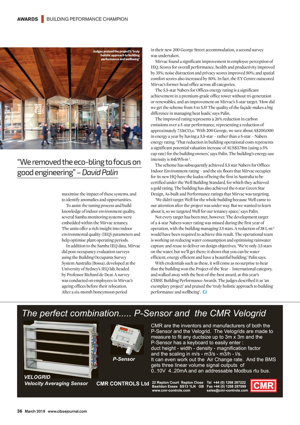 AWARDS | BUILDING PEFORMANCE CHAMPION Judges praised the projects truly holistic approach to building performance and wellbeing We removed the eco-bling to focus on good engineering David Palin maximise the impact of these systems, and toidentify anomalies and opportunities. To assist the tuning process and build knowledge of indoor environment quality, several Samba monitoring systems were embedded within the Mirvac tenancy. The units offer a rich insight into indoor environmental quality (IEQ) parameters and help optimise plant operating periods. In addition to the Samba IEQ data, Mirvac did post-occupancy evaluation surveys using the Building Occupants Survey System Australia (Bossa), developed at the University of Sydneys IEQ lab, headed by Professor Richard de Dear. A survey was conducted on employees in Mirvacs ageing offices before their relocation. After a six-month honeymoon period in their new200GeorgeStreet accommodation, a second survey wasundertaken. Mirvac found a significant improvement in employee perception of IEQ. Scores for overall performance, health and productivity improved by 35%; noise distraction and privacy scores improved 50%; and spatial comfort scores also increased by 50%. In fact, the EY Centre outscored Mirvacs former head office across all categories. The 5.5-star Nabers for Offices energy rating is a significant achievement in a premium-grade office tower without tri-generation or renewables, and an improvement on Mirvacs 5-star target. How did we get the scheme from 5 to 5.5? The quality of the faade makes a big difference in managing heat loads, says Palin. The improved rating represents a 26% reduction in carbon emissions over a 5-star performance, representing a reduction of approximately 733tCO2e. With 200 George, we save about A$200,000 in energy ayear by having a 5.5-star rather than a 5-star Nabers energy rating. That reduction in building operational costs represents a significant potential valuation increase of AUS$3.78m (using a 5% cap rate) for thebuilding owners, says Palin. The buildings energy-use intensity is84kWh.m-2. The scheme has subsequently achieved 5.5 star Nabers for Offices Indoor Environment rating and the six floors that Mirvac occupies for its new HQ have the kudos of being the first in Australia to be certified under the Well Building Standard, for which they achieved a gold rating. The building has also achieved the 6 star Green Star Design, As-built and Performance ratings that Mirvac was targeting. We didnt target Well for the whole building because Well came to our attention after the project was under way. But we wanted to learn about it, so we targeted Well for our tenancy space, says Palin. Not every target has been met, however. The development target of a 4-star Nabers water rating was missed during the first year of operation, with the building managing 3.5 stars. A reduction of 38L.m-2 would have been required to achieve this result. The operational team is working on reducing water consumption and optimising rainwater capture and reuse to deliver on design objectives. Were only 3.5stars on the water, but well get there; it shows that you can be water efficient, energy efficient and have a beautiful building, Palin says. With credentials such as these, it will come as no surprise to hear that the building won the Project of the Year International category, and walked away with the best-of-the-best award, at this years CIBSE Building Performance Awards. The judges described it as an exemplary project and praised the truly holistic approach to building performance and wellbeing. CJ 36 March 2019 www.cibsejournal.com CIBSE Mar19 pp32-34, 36 Mirvac v2.indd 36 25/02/2019 09:29