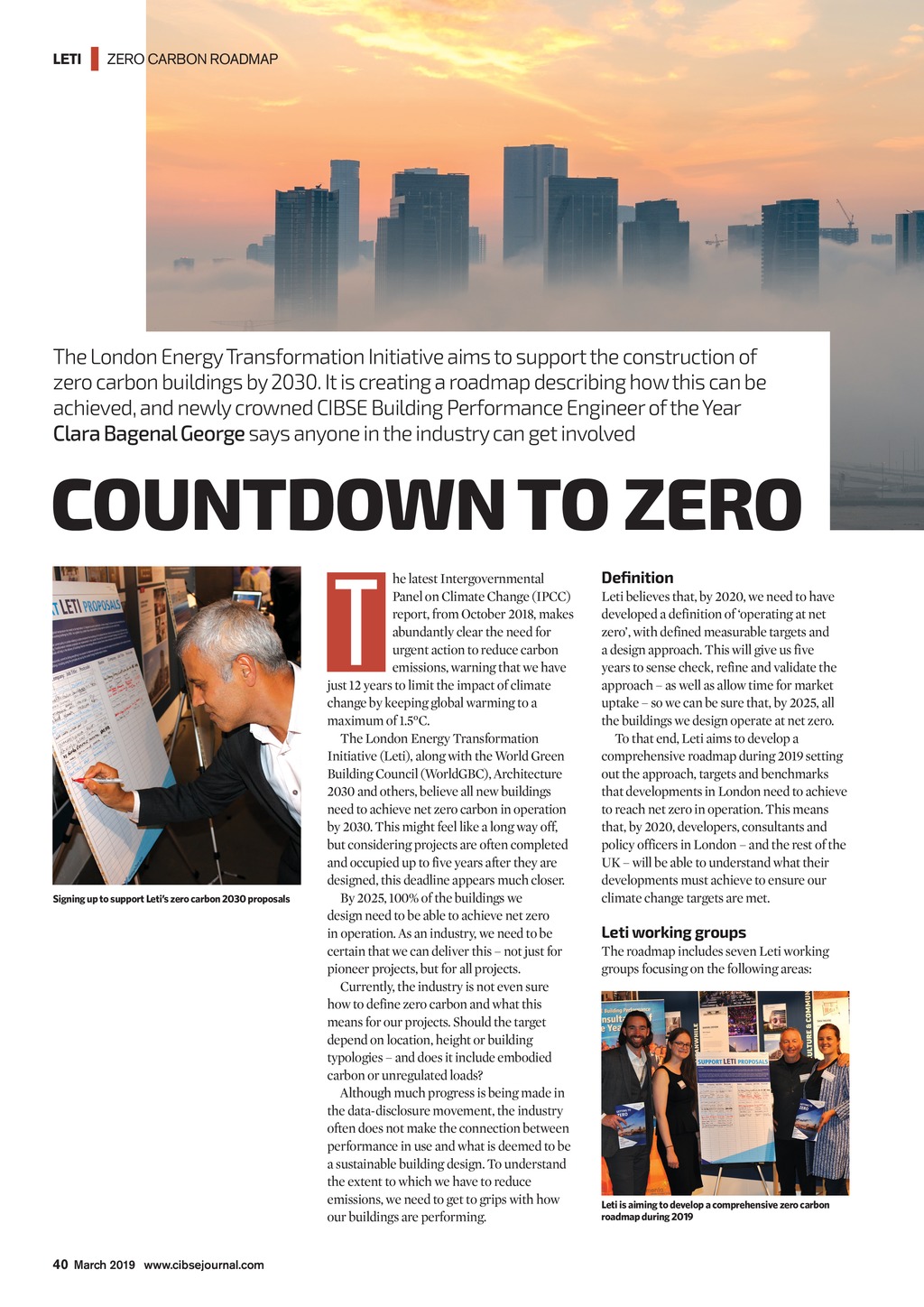 LETI | ZERO CARBON ROADMAP The London Energy Transformation Initiative aims to support the construction of zero carbon buildings by 2030. It is creating a roadmap describing how this can be achieved, and newly crowned CIBSE Building Performance Engineer of the Year ClaraBagenal George says anyone in the industry can get involved COUNTDOWN TO ZERO T Signing up to support Letis zero carbon 2030 proposals he latest Intergovernmental Panel on Climate Change (IPCC) report, from October 2018, makes abundantly clear the need for urgent action to reduce carbon emissions, warning that we have just 12 years to limit the impact of climate change by keeping global warming to a maximum of 1.5C. The London Energy Transformation Initiative (Leti), along with the World Green Building Council (WorldGBC), Architecture 2030 and others, believe all new buildings need to achieve net zero carbon in operation by 2030. This might feel like a long way off, but considering projects are often completed and occupied up to five years after they are designed, this deadline appears much closer. By 2025, 100% of the buildings we design need to be able to achieve net zero in operation. As an industry, we need to be certain that we can deliver this not just for pioneer projects, but for all projects. Currently, the industry is not even sure howto define zero carbon and what this means for our projects. Should the target depend on location, height or building typologies and does it include embodied carbon or unregulated loads? Although much progress is being made in the data-disclosure movement, the industry often does not make the connection between performance in use and what is deemed to be a sustainable building design. To understand the extent to which we have to reduce emissions, we need to get to grips with how our buildings are performing. Definition Leti believes that, by 2020, we need to have developed a definition of operating at net zero, with defined measurable targets and a design approach. This will give us five years to sense check, refine and validate the approach as well as allow time for market uptake so we can be sure that, by 2025, all the buildings we design operate at net zero. To that end, Leti aims to develop a comprehensive roadmap during 2019 setting out the approach, targets and benchmarks that developments in London need to achieve to reach net zero in operation. This means that, by 2020, developers, consultants and policy officers in London and the rest of the UK will be able to understand what their developments must achieve to ensure our climate change targets are met. Leti working groups The roadmap includes seven Leti working groups focusing on the following areas: Leti is aiming to develop a comprehensive zero carbon roadmap during 2019 40 March 2019 www.cibsejournal.com CIBSE Mar19 pp40-42 Leti roadmap.indd 40 22/02/2019 18:22