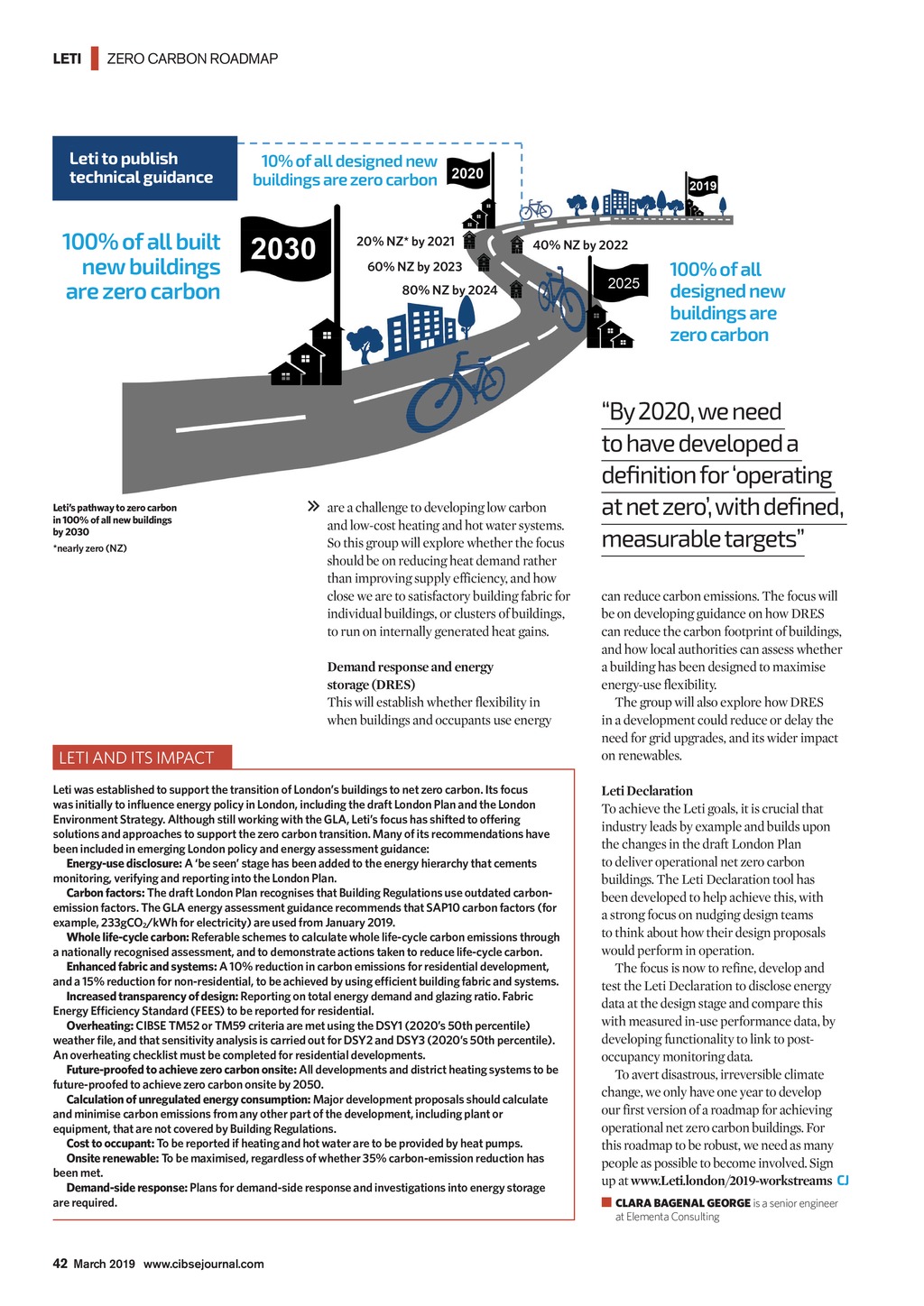 LETI | ZERO CARBON ROADMAP Leti to publish technical guidance 10% of all designed new buildings are zero carbon 100% of all built new buildings are zero carbon Letis pathway to zero carbon in 100% of all new buildings by 2030 *nearly zero (NZ) 20% NZ* by 2021 40% NZ by 2022 60% NZ by 2023 80% NZ by 2024 are a challenge to developing low carbon and low-cost heating and hot water systems. So this group will explore whether the focus should be on reducing heat demand rather than improvingsupply efficiency, and how close we are to satisfactory building fabric for individual buildings, or clusters of buildings, to run on internally generated heat gains. Demand response and energy storage(DRES) This will establish whether flexibility in when buildings and occupants use energy LETI AND ITS IMPACT Leti was established to support the transition of Londons buildings to net zero carbon. Its focus was initially to influence energy policy in London, including the draft London Plan and the London Environment Strategy. Although still working with the GLA, Letis focus has shifted to offering solutions and approaches to support the zero carbon transition. Many of its recommendations have been included in emerging London policy and energy assessment guidance: Energy-use disclosure: A be seen stage has been added to the energy hierarchy that cements monitoring, verifying and reporting into the London Plan. Carbon factors: The draft London Plan recognises that Building Regulations use outdated carbonemission factors. The GLA energy assessment guidance recommends that SAP10 carbon factors (for example, 233gCO2/kWh for electricity) are used from January 2019. Whole life-cycle carbon: Referable schemes to calculate whole life-cycle carbon emissions through a nationally recognised assessment, and to demonstrate actions taken to reduce life-cycle carbon. Enhanced fabric and systems: A 10% reduction in carbon emissions for residential development, and a 15% reduction for non-residential, to be achieved by using efficient building fabric and systems. Increased transparency of design: Reporting on total energy demand and glazing ratio. Fabric Energy Efficiency Standard (FEES) to be reported for residential. Overheating: CIBSE TM52 or TM59 criteria are met using the DSY1 (2020s 50th percentile) weather file, and that sensitivity analysis is carried out for DSY2 and DSY3 (2020s 50th percentile). An overheating checklist must be completed for residential developments. Future-proofed to achieve zero carbon onsite: All developments and district heating systems to be future-proofed to achieve zero carbon onsite by 2050. Calculation of unregulated energy consumption: Major development proposals should calculate and minimise carbon emissions from any other part of the development, including plant or equipment, that are not covered by Building Regulations. Cost to occupant: To be reported if heating and hot water are to be provided by heat pumps. Onsite renewable: To be maximised, regardless of whether 35% carbon-emission reduction has been met. Demand-side response: Plans for demand-side response and investigations into energy storage are required. 100% of all designed new buildings are zero carbon By 2020, we need to have developed a definition for operating at net zero, with defined, measurable targets can reduce carbon emissions. The focus will be on developing guidance on how DRES can reduce the carbon footprint of buildings, and how local authorities can assess whether a building has been designed to maximise energy-use flexibility. The group will also explore how DRES in adevelopment could reduce or delay the need for grid upgrades, and its wider impact on renewables. Leti Declaration To achieve the Leti goals, it is crucial that industry leads by example and builds upon the changes in the draft London Plan to deliver operational net zero carbon buildings. The Leti Declaration tool has been developedto help achieve this, with a strong focus on nudging design teams to think abouthow their design proposals wouldperform in operation. The focus is now to refine, develop and test the Leti Declaration to disclose energy data at the design stage and compare this with measured in-use performance data, by developing functionality to link to postoccupancy monitoring data. To avert disastrous, irreversible climate change, we only have one year to develop our first version of a roadmap for achieving operational net zero carbon buildings. For this roadmap to be robust, we need as many people as possible to become involved. Sign up at www.Leti.london/2019-workstreams CJ CLARA BAGENAL GEORGE is a senior engineer atElementa Consulting 42 March 2019 www.cibsejournal.com CIBSE Mar19 pp40-42 Leti roadmap.indd 42 22/02/2019 16:40