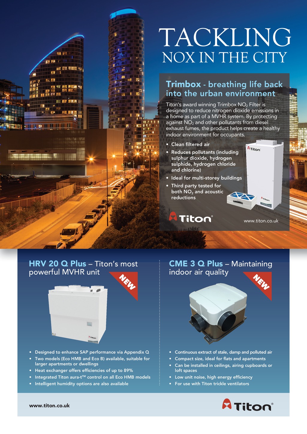 TACKLING NOX IN THE CITY Trimbox - breathing life back into the urban environment Titons award winning Trimbox NO2 Filter is designed to reduce nitrogen dioxide emissions in a home as part of a MVHR system. By protecting against NO2 and other pollutants from diesel exhaust fumes, the product helps create a healthy indoor environment for occupants. r %NGCPNVGTGFCKT Reduces pollutants (including sulphur dioxide, hydrogen sulphide, hydrogen chloride and chlorine) Ideal for multi-storey buildings Third party tested for both NO2 and acoustic reductions www.titon.co.uk HRV 20 Q Plus Pl Tit Titons mostt powerful MVHR unit CME 3 Q Plus Pl M Maintaining i t i i indoor air quality EW N EW N Designed to enhance SAP performance via Appendix Q Continuous extract of stale, damp and polluted air Two models (Eco HMB and Eco B) available, suitable for larger apartments or dwellings r %QORCEVUK\GKFGCNHQTCVUCPFCRCTVOGPVU r *GCVGZEJCPIGTQHHGTUGHEKGPEKGUQHWRVQ Can be installed in ceilings, airing cupboards or loft spaces Integrated Titon aura-tTM control on all Eco HMB models r .QYWPKVPQKUGJKIJGPGTI[GHEKGPE[ Intelligent humidity options are also available For use with Titon trickle ventilators www.titon.co.uk 62 March 2019 www.cibsejournal.com p62_CIBSEMagMar19.indd 62 20/02/2019 09:18