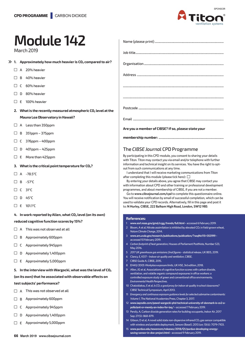 SPONSOR CPD PROGRAMME | CARBON DIOXIDE Module 142 Name (please print).......................................................................................... March 2019 Job title................................................................................................................... 1.Approximately how much heavier is CO2 compared to air? Organisation........................................................................................................ A 20% heavier B 40% heavier C 60% heavier D 80% heavier Address ................................................................................................................. .................................................................................................................................. .................................................................................................................................. E 100% heavier 2.What is the recently measured atmospheric CO2 level at the Mauna Loa Observatory in Hawaii? A Less than 350ppm B 351ppm 375ppm C 376ppm 400ppm Postcode ............................................................................................................... Email ...................................................................................................................... Are you a member of CIBSE? If so, please state your membership number: ..................................................................................... D 401ppm 425ppm The CIBSE Journal CPD Programme E More than 425ppm By participating in this CPD module, you consent to sharing your details with Titon. Titon may contact you via email and/or telephone with further information and technical insight on its services. You have the right to optout from such communications at any time. I understand that I will receive marketing communications from Titon after completing this module (please tick here): By entering your details above, you agree that CIBSE may contact you with information about CPD and other training or professional development programmes, and about membership of CIBSE, if you are not a member. Go to www.cibsejournal.com/cpd to complete this questionnaire online. You will receive notification by email of successful completion, which can be used to validate your CPD records. Alternatively, fill in this page and post it to: N Hurley, CIBSE, 222 Balham High Road, London, SW12 9BS 3.What is the critical point temperature for CO2? A -78.5C B -57C C 31C D 45C E 101.1C 4. In work reported by Allen, what CO2 level (on its own) reduced cognitive function scores by 15%? A This was not observed at all B Approximately 600ppm C Approximately 945ppm D Approximately 1,400ppm E Approximately 5,000ppm 5. In the interview with Wargocki, what was the level of CO2 (on its own) that he associated with observable effects on test subjects performance? A This was not observed at all B Approximately 600ppm C Approximately 945ppm D Approximately 1,400ppm E Approximately 5,000ppm 66 March 2019 www.cibsejournal.com CIBSE Mar19 pp63-66 CPD.indd 66 References: 1 www.esrl.noaa.gov/gmd/ccgg/trends/full.html accessed 6 February 2019. 2 Bloom, A et al, Nitrate assimilation is inhibited by elevated CO2 in field-grown wheat, Nature Climate Change, 2014. 3 www.ars.usda.gov/research/publications/publication/?seqNo115=353199 accessed 10 February 2019. 4 Carbon footprint of heat generation, Houses of Parliament PostNote, Number 523, May2016. 5 2017 UK greenhouse gas emissions: final figures statistical release, UK BEIS, 2019. 6 Clancy, E, KS17 Indoor air quality and ventilation, CIBSE. 7 CIBSE Guide A, CIBSE, 2015. 8 EH40/2005 Workplace exposure limits, UK HSE, 3rd edition, 2018. 9 Allen, JG et al, Associations of cognitive function scores with carbon dioxide, ventilation, and volatile organic compound exposures in office workers: a controlledexposure study of green and conventional office environments, Environmental Health Perspectives. 10 Chatzidiakou, E et al, Is CO2 a good proxy for indoor air quality in school classrooms? CIBSE Technical Symposium, April 2013. 11 Emergency and continuous exposure guidance levels for selected submarine contaminants: Volume 1, The National Academies Press, Chapter 3, 2017. 12 www.iaqradio.com/pawel-wargocki-phd-technical-university-of-denmark-is-co2-apollutant-or-merely-an-index-for-iaq/ accessed 7 February 2019. 13 Persily, A, Carbon dioxide generation rates for building occupants, Indoor Air, 2017 Sep; 27(5): 868879. 14 Gibson, D et al, A novel solid state non-dispersive infrared CO2 gas sensor compatible with wireless and portable deployment, Sensors (Basel). 2013 Jun; 13(6): 70797103. 15 www.purdue.edu/newsroom/releases/2018/Q1/purdue-developing-energysaving-sensor-in-doe-project.html accessed 9 February 2019. 22/02/2019 16:47