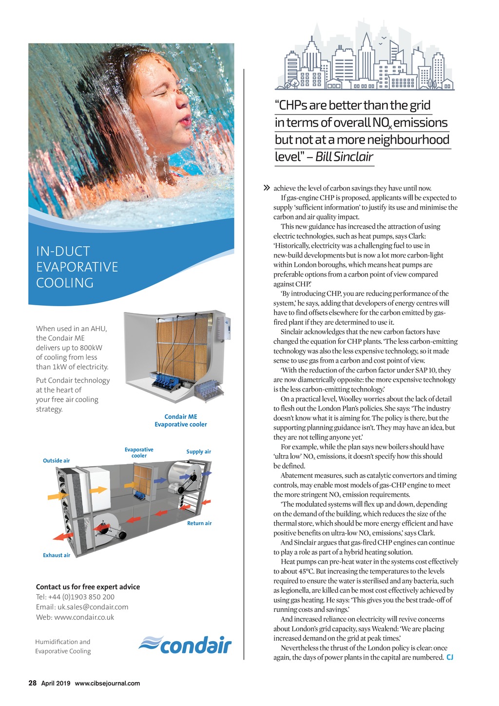 CHPs are better than the grid in terms of overall NO emissions but not at a more neighbourhood level Bill Sinclair IN-DUCT EVAPORATIVE COOLING When used in an AHU, the Condair ME delivers up to 800kW of cooling from less than 1kW of electricity. Put Condair technology at the heart of your free air cooling strategy. Outside air Condair ME Evaporative cooler Evaporative cooler Supply air Return air Exhaust air Contact us for free expert advice Tel: +44 (0)1903 850 200 Email: uk.sales@condair.com Web: www.condair.co.uk Humidification and Evaporative Cooling achieve the level of carbon savings they have until now. If gas-engine CHP is proposed, applicants will be expected to supply sufficient information to justify its use and minimise the carbon and air quality impact. This new guidance has increased the attraction of using electric technologies, such as heat pumps, says Clark: Historically, electricity was a challenging fuel to use in new-build developments but is now a lot more carbon-light withinLondon boroughs, which means heat pumps are preferable options from a carbon point of view compared against CHP. By introducing CHP, you are reducing performance of the system, he says, adding that developers of energy centres will have to find offsets elsewhere for the carbon emitted by gasfired plant if they are determined to use it. Sinclair acknowledges that the new carbon factors have changed the equation for CHP plants. The less carbon-emitting technology was also the less expensive technology, so it made sense to use gas from a carbon and cost point of view. With the reduction of the carbon factor under SAP 10, they are now diametrically opposite: the more expensive technology is the less carbon-emitting technology. On a practical level, Woolley worries about the lack of detail to flesh out the London Plans policies. She says: The industry doesnt know what it is aiming for. The policy is there, but the supporting planning guidance isnt. They may have an idea, but they are not telling anyone yet. For example, while the plan says new boilers should have ultra low NOx emissions, it doesnt specify how this should bedefined. Abatement measures, such as catalytic convertors and timing controls, may enable most models of gas-CHP engine to meet the more stringent NOx emission requirements. The modulated systems will flex up and down, depending on the demand of the building, which reduces the size of the thermal store, which should be more energy efficient and have positive benefits on ultra-low NOx emissions, says Clark. And Sinclair argues that gas-fired CHP engines can continue to play a role as part of a hybrid heating solution. Heat pumps can pre-heat water in the systems cost effectively to about 45C. But increasing the temperatures to the levels required to ensure the water is sterilised and any bacteria, such as legionella, are killed can be most cost effectively achieved by using gas heating. He says: This gives you the best trade-off of running costs and savings. And increased reliance on electricity will revive concerns about Londons grid capacity, says Wealend: We are placing increased demand on the grid at peak times. Nevertheless the thrust of the London policy is clear: once again, the days of power plants in the capital are numbered. CJ 28 April 2019 www.cibsejournal.com CIBSE Apr19 pp26-28 Air Quality.indd 28 22/03/2019 16:53
