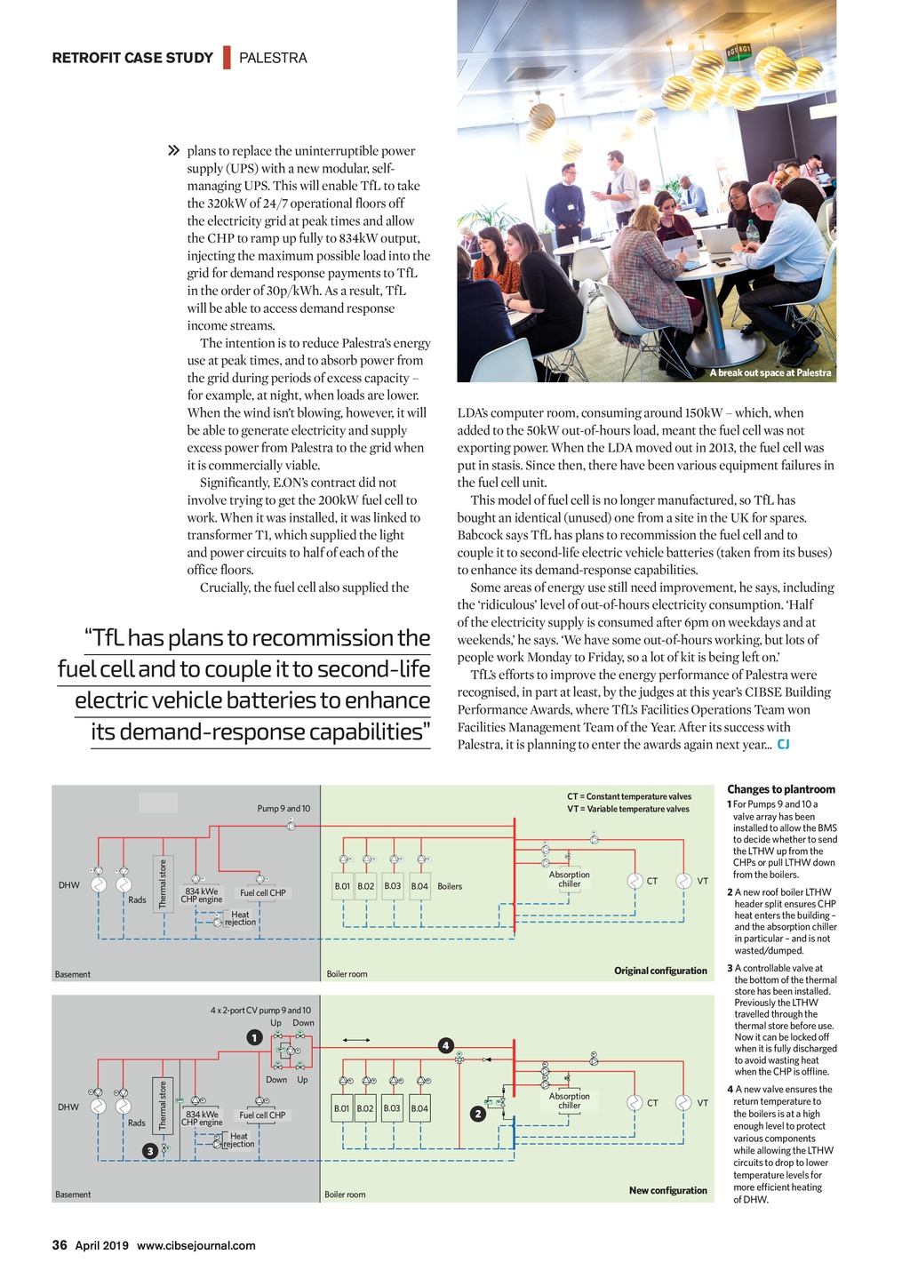 RETROFIT CASE STUDY | PALESTRA plans to replace the uninterruptible power supply (UPS) with a new modular, selfmanaging UPS. This will enable TfL to take the 320kW of 24/7 operational floors off the electricity grid at peak times and allow the CHP to ramp up fully to 834kW output, injecting the maximum possible load into the grid for demand response payments to TfL in the order of 30p/kWh. As a result, TfL will be able to access demand response income streams. The intention is to reduce Palestras energy use at peak times, and to absorb power from the grid during periods of excess capacity for example, at night, when loads are lower. When the wind isnt blowing, however, it will be able to generate electricity and supply excess power from Palestra to the grid when it is commercially viable. Significantly, E.ONs contract did not involve trying to get the 200kW fuel cell to work. When it was installed, it was linked to transformer T1, which supplied the light and power circuits to half of each of the office floors. Crucially, the fuel cell also supplied the A break out space at Palestra LDAs computer room, consuming around 150kW which, when added to the 50kW out-of-hours load, meant the fuel cell was not exporting power. When the LDA moved out in 2013, the fuel cell was putin stasis. Since then, there have been various equipment failures in the fuel cell unit. This model of fuel cell is no longer manufactured, so TfL has bought an identical (unused) one from a site in the UK for spares. Babcock says TfL has plans to recommission the fuel cell and to couple it to second-life electric vehicle batteries (taken from its buses) to enhance its demand-response capabilities. Some areas of energy use still need improvement, he says, including the ridiculous level of out-of-hours electricity consumption. Half of the electricity supply is consumed after 6pm on weekdays and at weekends, he says. We have some out-of-hours working, but lots of people work Monday to Friday, so a lot of kit is being left on. TfLs efforts to improve the energy performance of Palestra were recognised, in part at least, by the judges at this years CIBSE Building Performance Awards, where TfLs Facilities Operations Team won Facilities Management Team of the Year. After its success with Palestra, it is planning to enter the awards again next year... CJ TfL has plans to recommission the fuel cell and to couple it to second-life electric vehicle batteries to enhance its demand-response capabilities Thermal store DHW Rads 834 kWe CHP engine B.01 B.02 Fuel cell CHP Changes to plantroom CT = Constant temperature valves VT = Variable temperature valves Pump 9 and 10 B.03 B.04 Absorption chiller Boilers CT VT Heat rejection Original configuration Boiler room Basement 4 x 2-port CV pump 9 and 10 Up Down Thermal store 1 DHW Rads 3 4 Down 834 kWe CHP engine Fuel cell CHP Up B.01 B.02 B.03 B.04 2 Absorption chiller CT VT Heat rejection Basement Boiler room New configuration 1 For Pumps 9 and 10 a valve array has been installed to allow the BMS to decide whether to send the LTHW up from the CHPs or pull LTHW down from the boilers. 2A new roof boiler LTHW header split ensures CHP heat enters the building and the absorption chiller in particular and is not wasted/dumped. 3A controllable valve at the bottom of the thermal store has been installed. Previously the LTHW travelled through the thermal store before use. Now it can be locked off when it is fully discharged to avoid wasting heat when the CHP is offline. 4A new valve ensures the return temperature to the boilers is at a high enough level to protect various components while allowing the LTHW circuits to drop to lower temperature levels for more efficient heating of DHW. 36 April 2019 www.cibsejournal.com CIBSE Apr19 pp32-36 Palestra.indd 36 22/03/2019 16:55