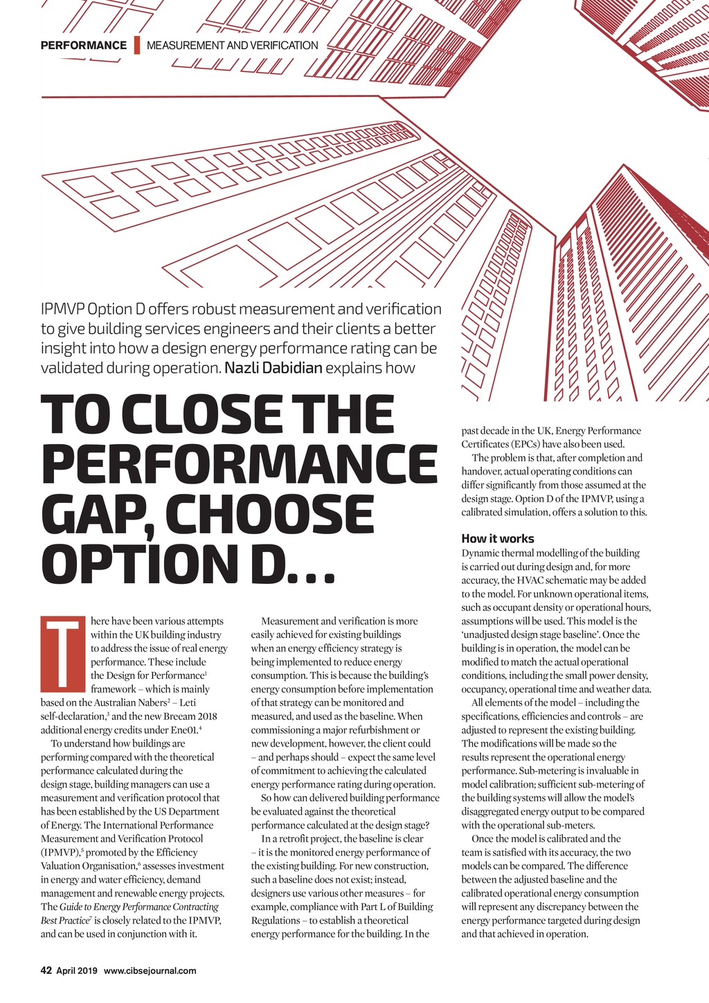 PERFORMANCE | MEASUREMENT AND VERIFICATION IPMVP Option D offers robust measurement and verification to give building services engineers and their clients a better insight into how a design energy performance rating can be validated during operation. Nazli Dabidian explains how TO CLOSE THE PERFORMANCE GAP, CHOOSE OPTION D T here have been various attempts within the UK building industry to address the issue of real energy performance. These include the Design for Performance1 framework which is mainly based on the Australian Nabers2 Leti self-declaration,3 and the new Breeam 2018 additional energy credits under Ene01.4 To understand how buildings are performing compared with the theoretical performance calculated during the design stage, building managers can use a measurement and verification protocol that has been established by the US Department of Energy. The International Performance Measurement and Verification Protocol (IPMVP),5 promoted by the Efficiency Valuation Organisation,6 assesses investment in energy and water efficiency, demand management and renewable energy projects. The Guide to Energy Performance Contracting Best Practice7 is closely related to the IPMVP, and can be used in conjunction with it. Measurement and verification is more easily achieved for existing buildings when an energy efficiency strategy is being implemented to reduce energy consumption. This is because the buildings energy consumption before implementation of that strategy can be monitored and measured, and used as the baseline. When commissioning a major refurbishment or new development, however, the client could and perhaps should expect the same level of commitment to achieving the calculated energy performance rating during operation. So how can delivered building performance be evaluated against the theoretical performance calculated at the design stage? In a retrofit project, the baseline is clear it is the monitored energy performance of the existing building. For new construction, such a baseline does not exist; instead, designers use various other measures for example, compliance with Part L of Building Regulations to establish a theoretical energy performance for the building. In the past decade in the UK, Energy Performance Certificates (EPCs) have also been used. The problem is that, after completion and handover, actual operating conditions can differ significantly from those assumed at the design stage. Option D of the IPMVP, using a calibrated simulation, offers a solution to this. How it works Dynamic thermal modelling of the building is carried out during design and, for more accuracy, the HVAC schematic may be added to the model. For unknown operational items, such as occupant density or operational hours, assumptions will be used. This model is the unadjusted design stage baseline. Once the building is in operation, the model can be modified to match the actual operational conditions, including the small power density, occupancy, operational time and weather data. All elements of the model including the specifications, efficiencies and controls are adjusted to represent the existing building. The modifications will be made so the results represent the operational energy performance. Sub-metering is invaluable in model calibration; sufficient sub-metering of the building systems will allow the models disaggregated energy output to be compared with the operational sub-meters. Once the model is calibrated and the team is satisfied with its accuracy, the two models can be compared. The difference between the adjusted baseline and the calibrated operational energy consumption will represent any discrepancy between the energy performance targeted during design and that achieved in operation. 42 April 2019 www.cibsejournal.com CIBSE Apr19 pp42-43 Measurement protocol.indd 42 22/03/2019 16:57