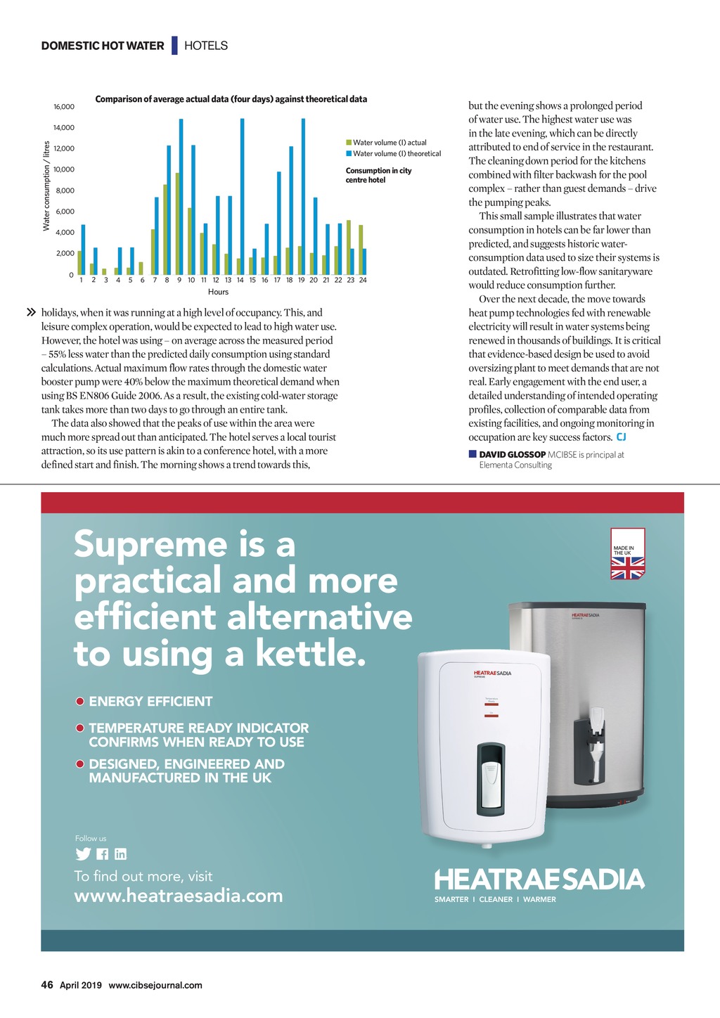 | HOTELS DOMESTIC HOT WATER Comparison of average actual data (four days) against theoretical data 16,000 Water consumption / litres 14,000 Water volume (I) actual Water volume (I) theoretical 12,000 10,000 Consumption in city centre hotel 8,000 6,000 4,000 2,000 0 1 2 3 4 5 6 7 8 9 10 11 12 13 14 15 16 17 18 19 20 21 22 23 24 Hours holidays, when it was running at a high level of occupancy. This, and leisure complex operation, would be expected to lead to high water use. However, the hotel was using on average across the measured period 55% less water than the predicted daily consumption using standard calculations. Actual maximum flow rates through the domestic water booster pump were 40% below the maximum theoretical demand when using BS EN806 Guide 2006. As a result, the existing cold-water storage tank takes more than two days to go through an entire tank. The data also showed that the peaks of use within the area were much more spread out than anticipated. The hotel serves a local tourist attraction, so its use pattern is akin to a conference hotel, with a more defined start and finish. The morning shows a trend towards this, but the evening shows a prolonged period of water use. The highest water use was in the late evening, which can be directly attributed to end of service in the restaurant. The cleaning down period for the kitchens combined with filter backwash for the pool complex rather than guest demands drive the pumping peaks. This small sample illustrates that water consumption in hotels can be far lower than predicted, and suggests historic waterconsumption data used to size their systems is outdated. Retrofitting low-flow sanitaryware would reduce consumption further. Over the next decade, the move towards heat pump technologies fed with renewable electricity will result in water systems being renewed in thousands of buildings. It is critical that evidence-based design be used to avoid oversizing plant to meet demands that are not real. Early engagement with the end user, a detailed understanding of intended operating profiles, collection of comparable data from existing facilities, and ongoing monitoring in occupation are key success factors. CJ DAVID GLOSSOP MCIBSE is principal at Elementa Consulting Supreme is a practical and more efficient alternative to using a kettle. ENERGY EFFICIENT TEMPERATURE READY INDICATOR CONFIRMS WHEN READY TO USE DESIGNED, ENGINEERED AND MANUFACTURED IN THE UK Follow us To find out more, visit www.heatraesadia.com DEPT_336619_HeatraeSadia_Supreme_HalfHoriz_CIBSEJournal_Apr19.indd 1 12/03/2019 09:05 46 April 2019 www.cibsejournal.com CIBSE Apr19 pp45-46 Hot water hotels.indd 46 22/03/2019 16:57